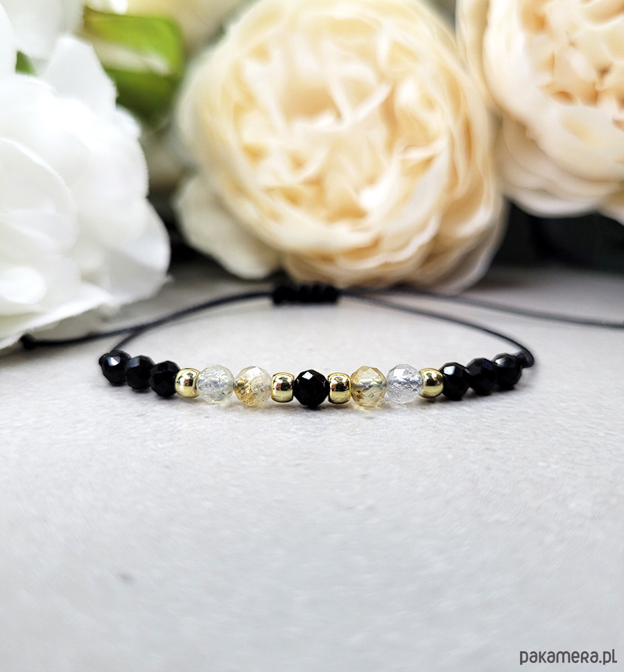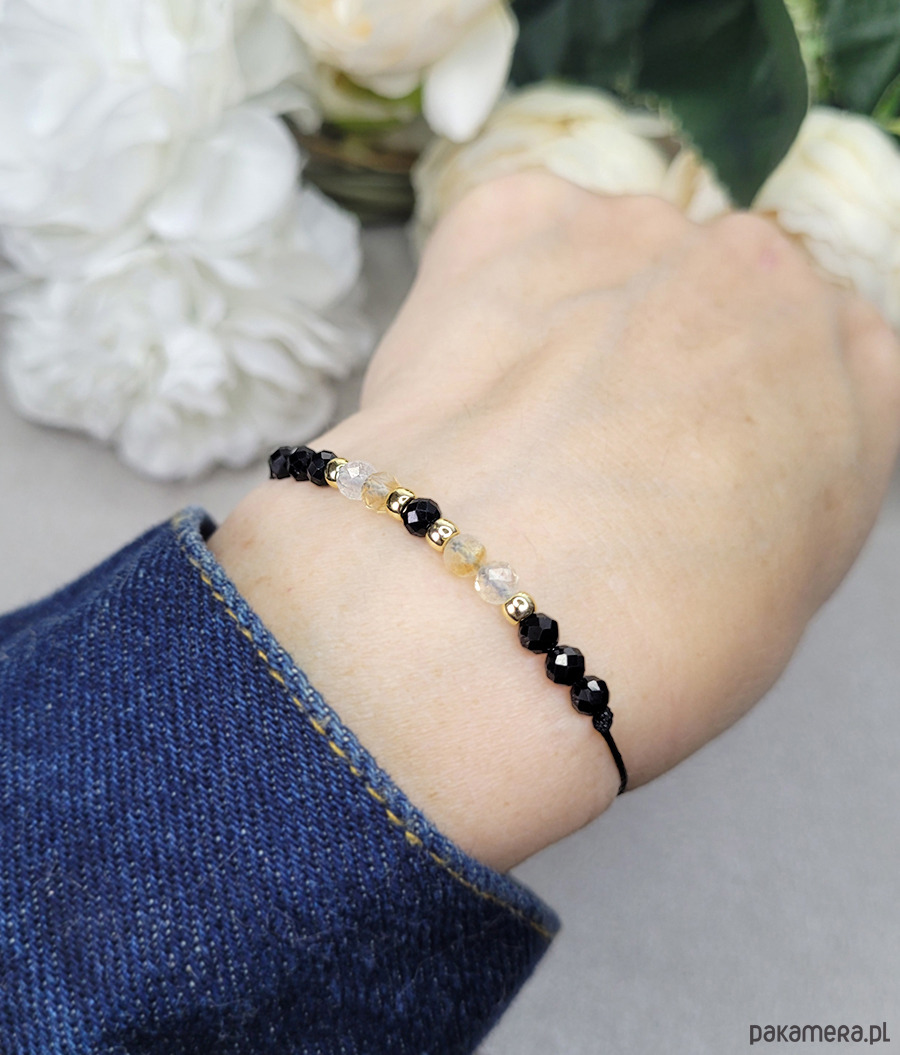 Przepiękna delikatna bransoletka zrobiona z kamieni naturalnych: Turmalinu, Cytrynu, Spinelu i Hematytu w kolorze złota.