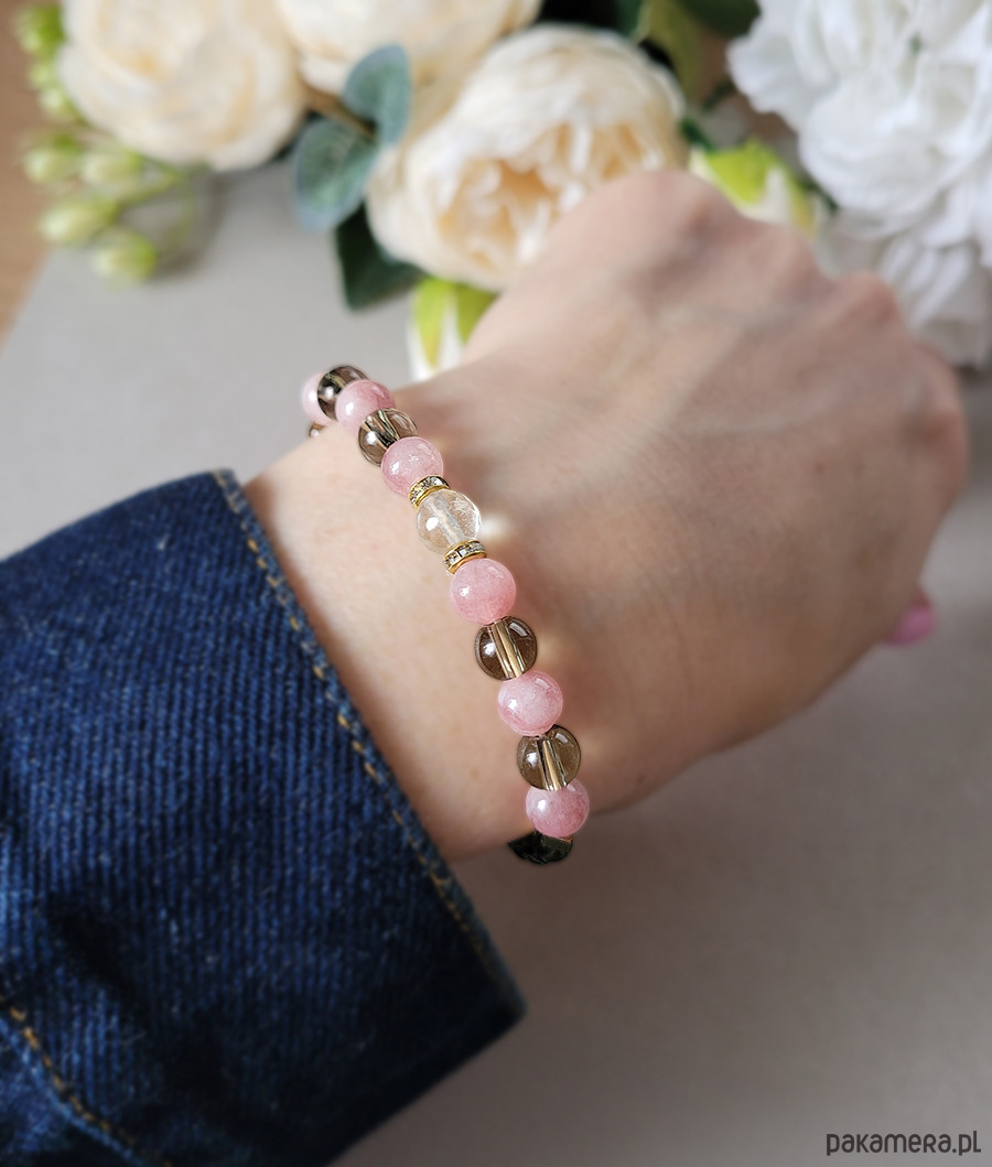 Przepiękna bransoletka z kolekcji "Queen of light z cytrynem" zrobiona z kamieni naturalnych: Cytrynu, Opalu różowego, Kwarcu dymnego oraz Hematytu w kolorze złota.