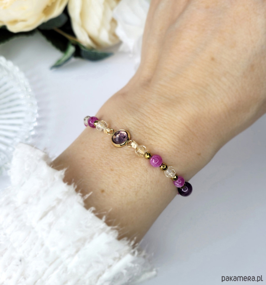 Całość dopełniają kamienie naturalne: Ametyst, Cytryn, Turmalin różowy oraz Hematyt w kolorze złota.