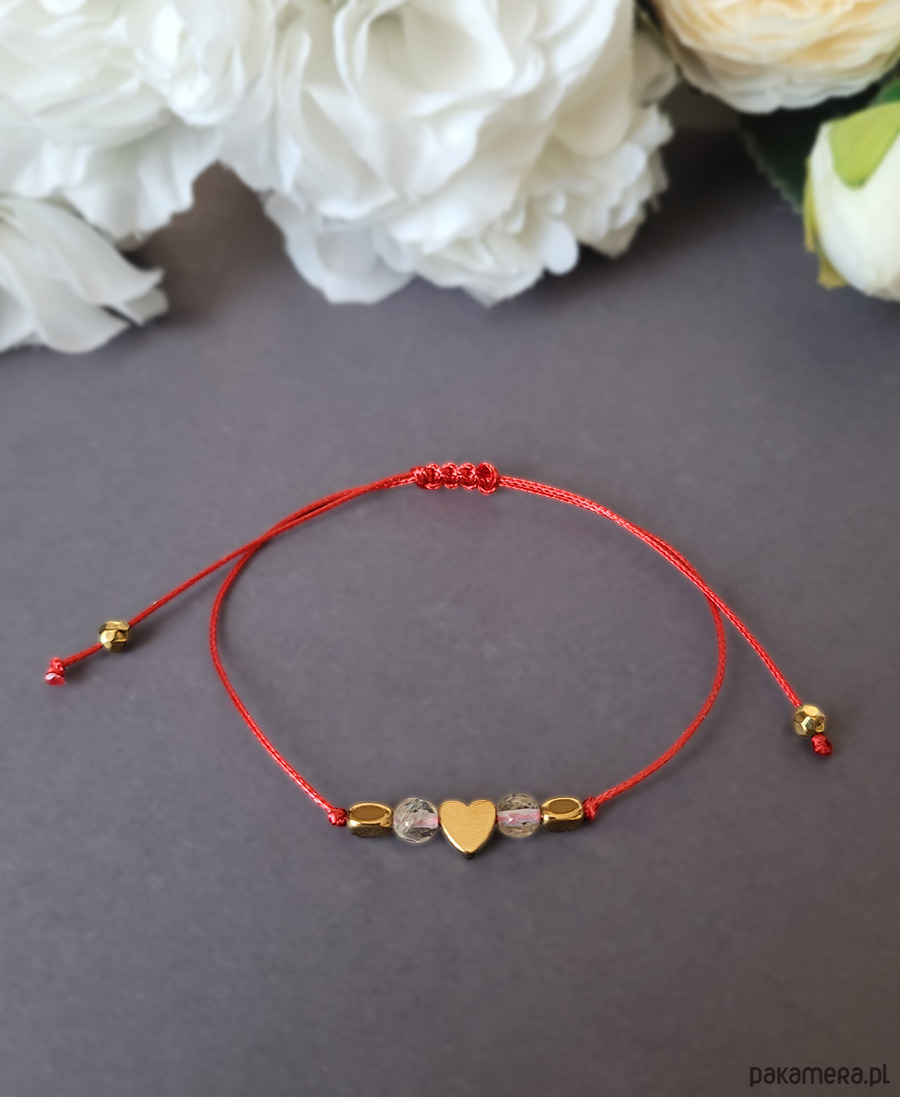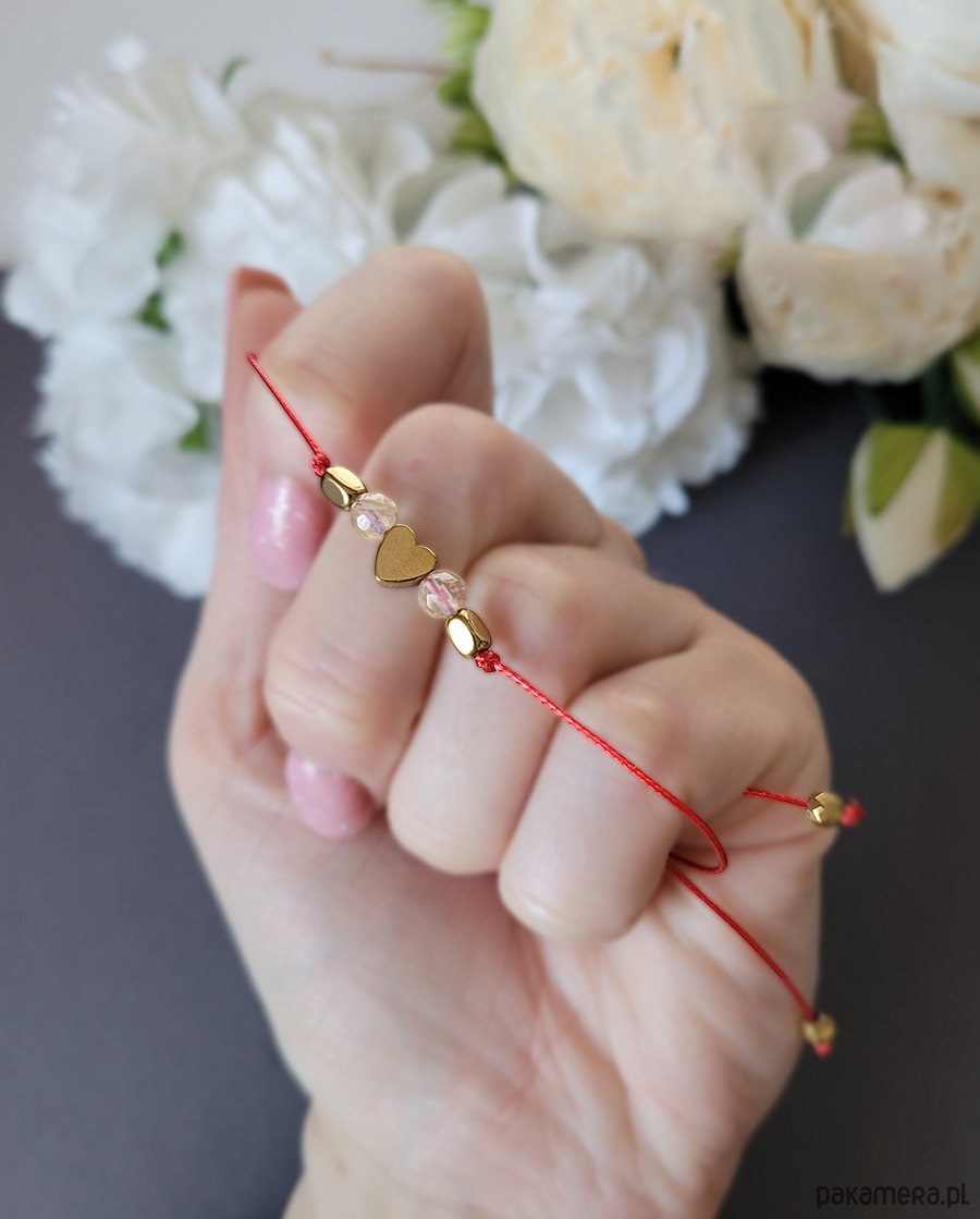 Bransoletka na czerwonym sznureczku woskowanym z regulowaną długością więc będzie pasować na nadgarstek aż do obwodu 20cm. Na zdjęciu na ręce o obwodzie ok. 15cm.