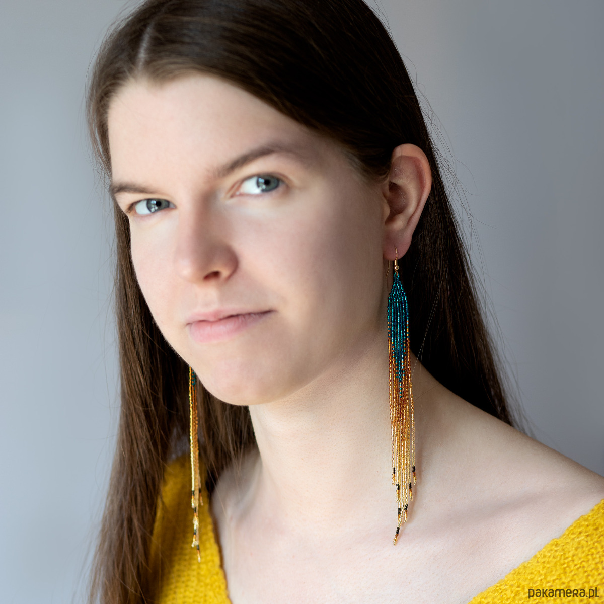 Długie, wąskie kolczyki, wykonane ze szklanych koralików okrągłych. Kolory: morski, topaz, zloty. Bigle ze stali szlachetnej, pozłacane.