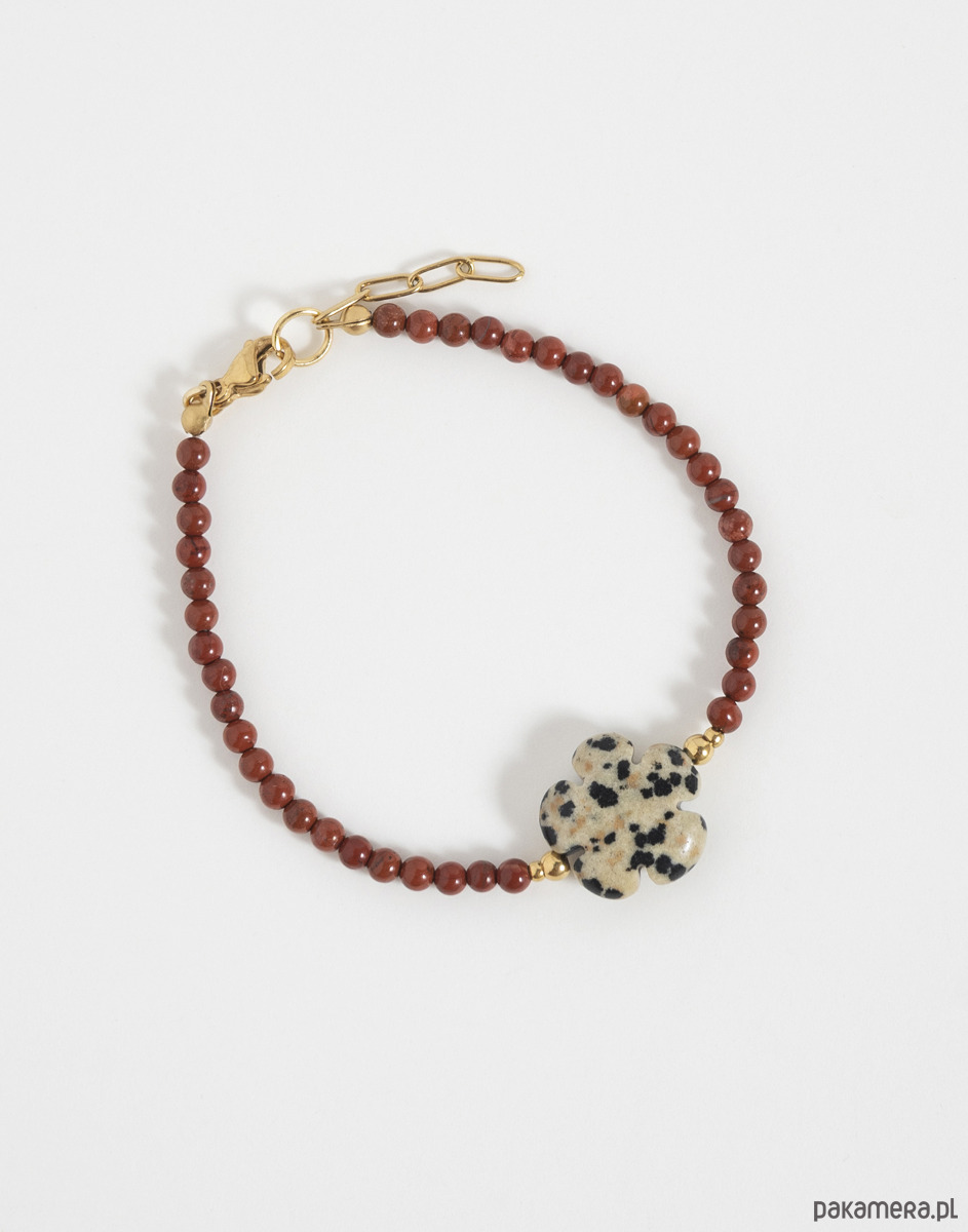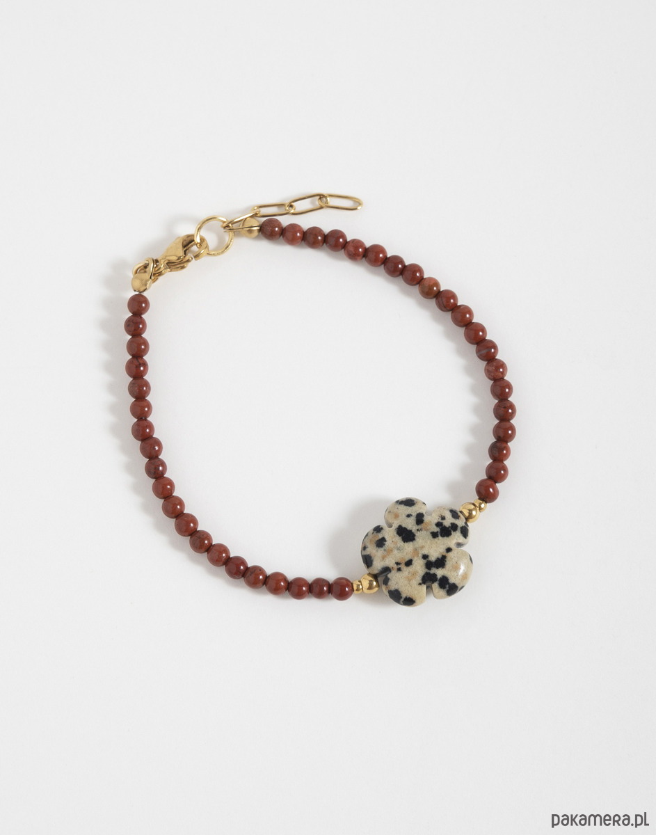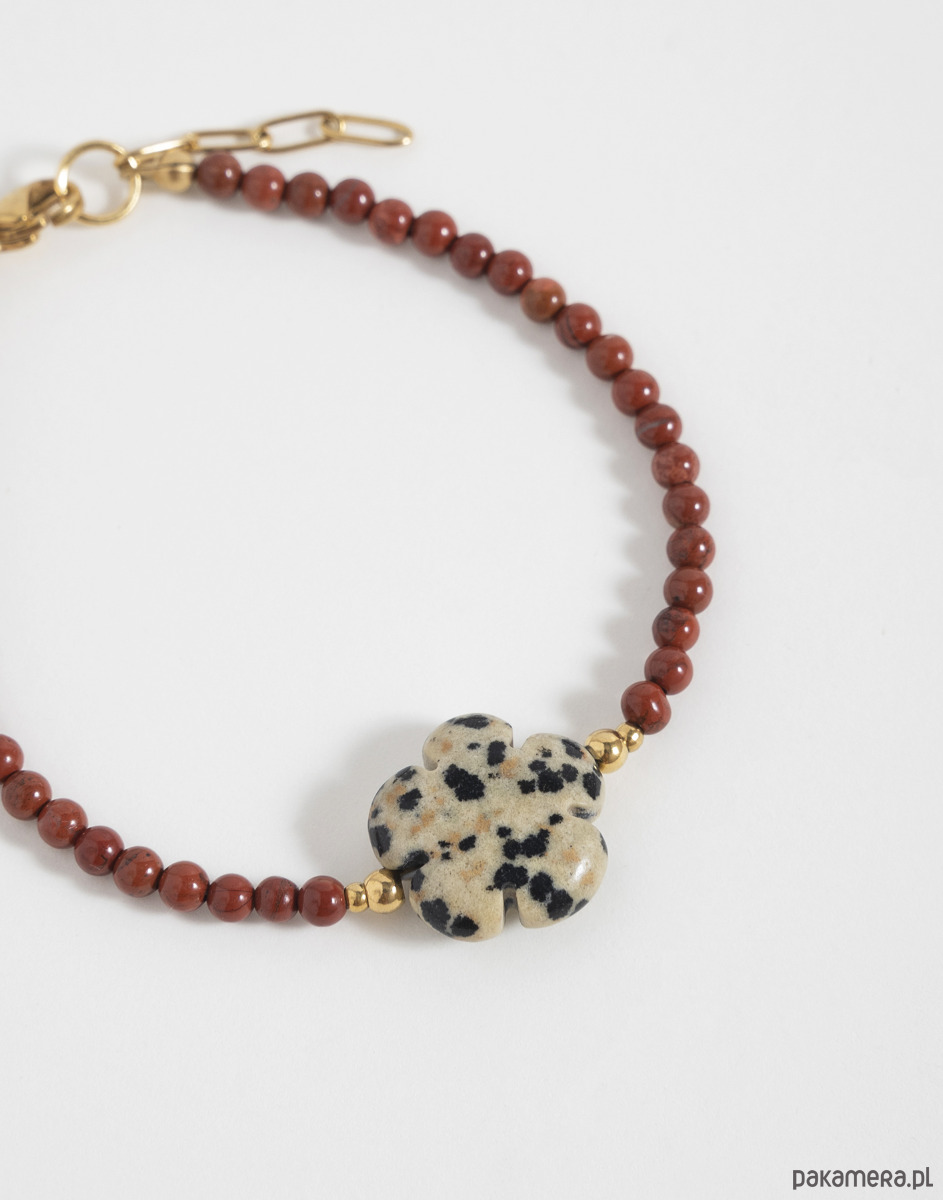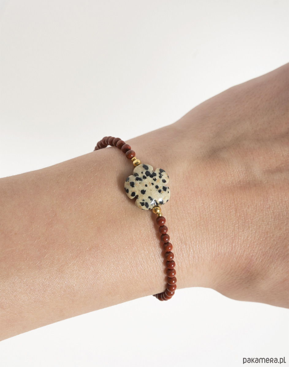 Bransoletka z regulacją wykonana z kamieni naturalnych. Głównym kamieniem jest jaspis czerwony, a na środku znajduje się jaspis dalmatyński w kształcie kwiatka.