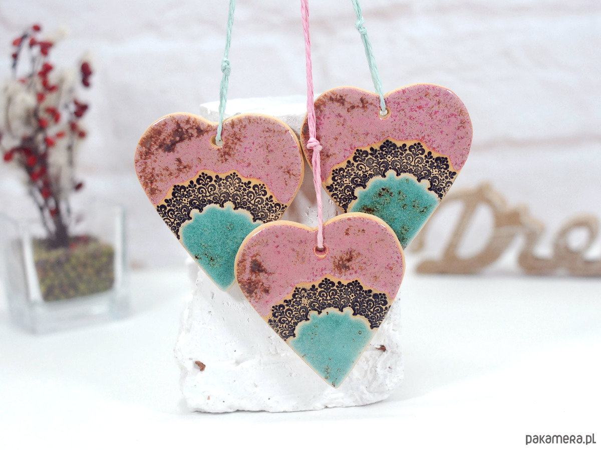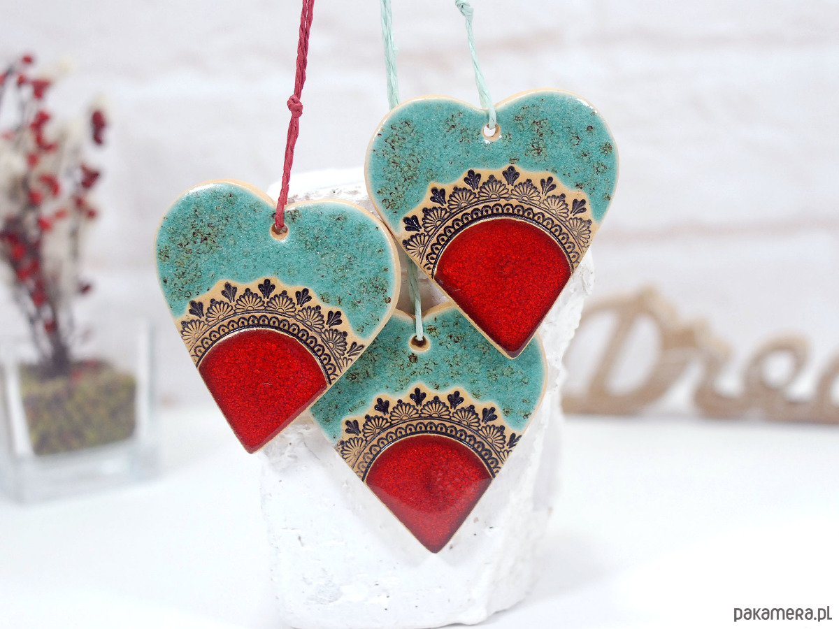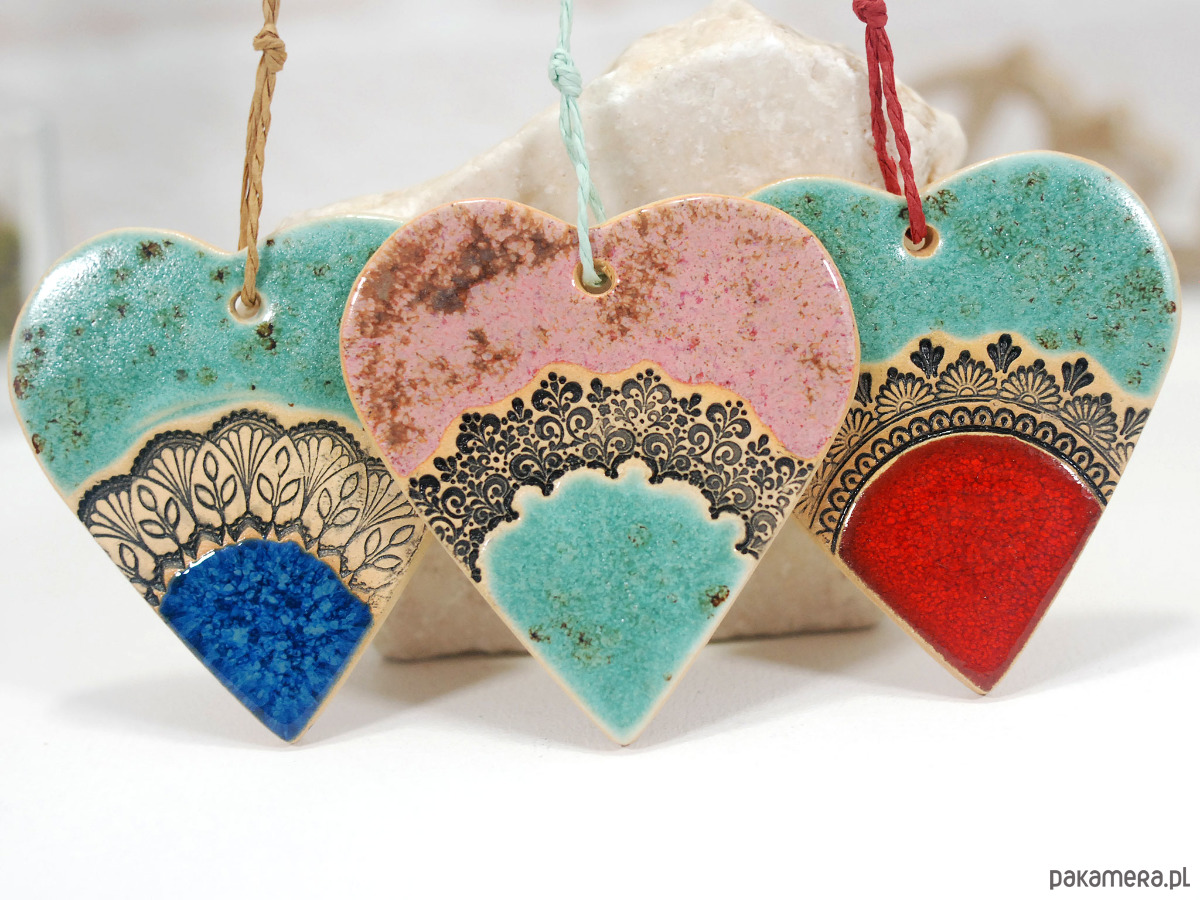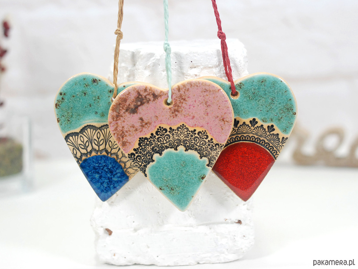 3 ręcznie robione i malowane ceramiczne ozdoby serca.