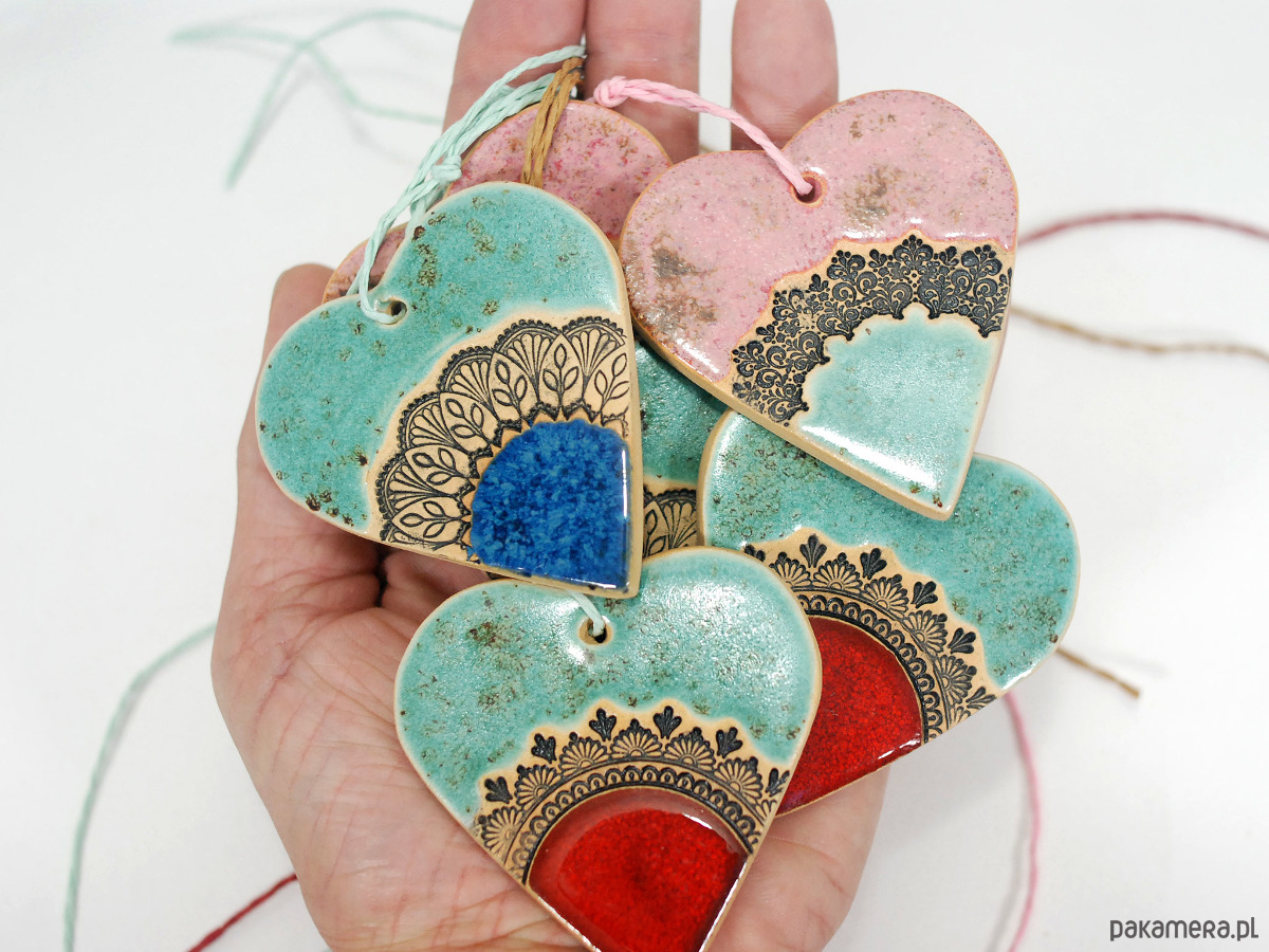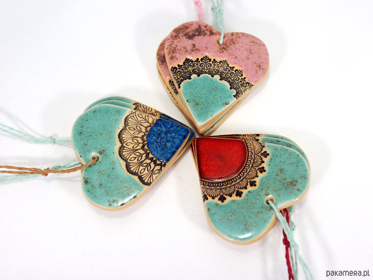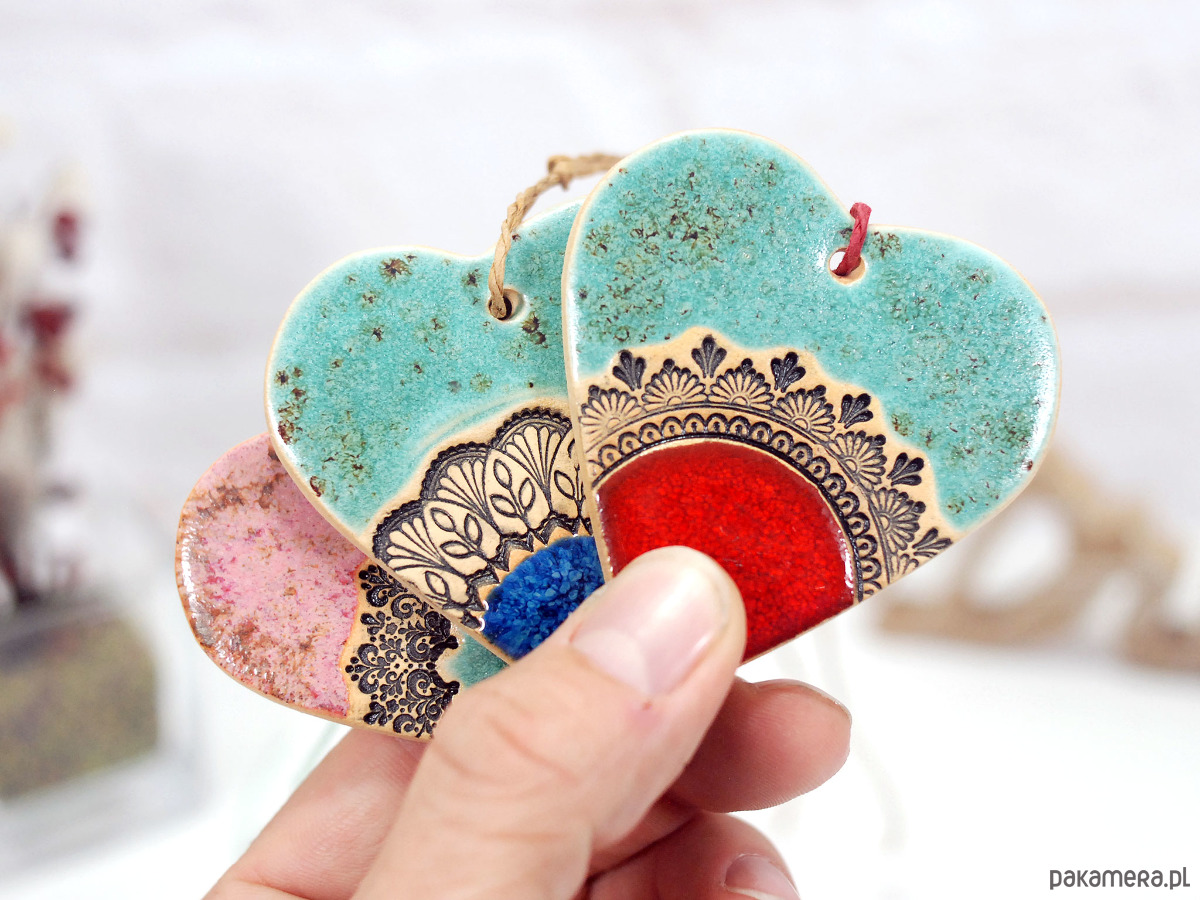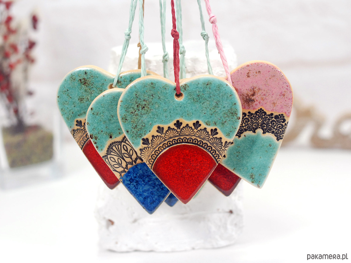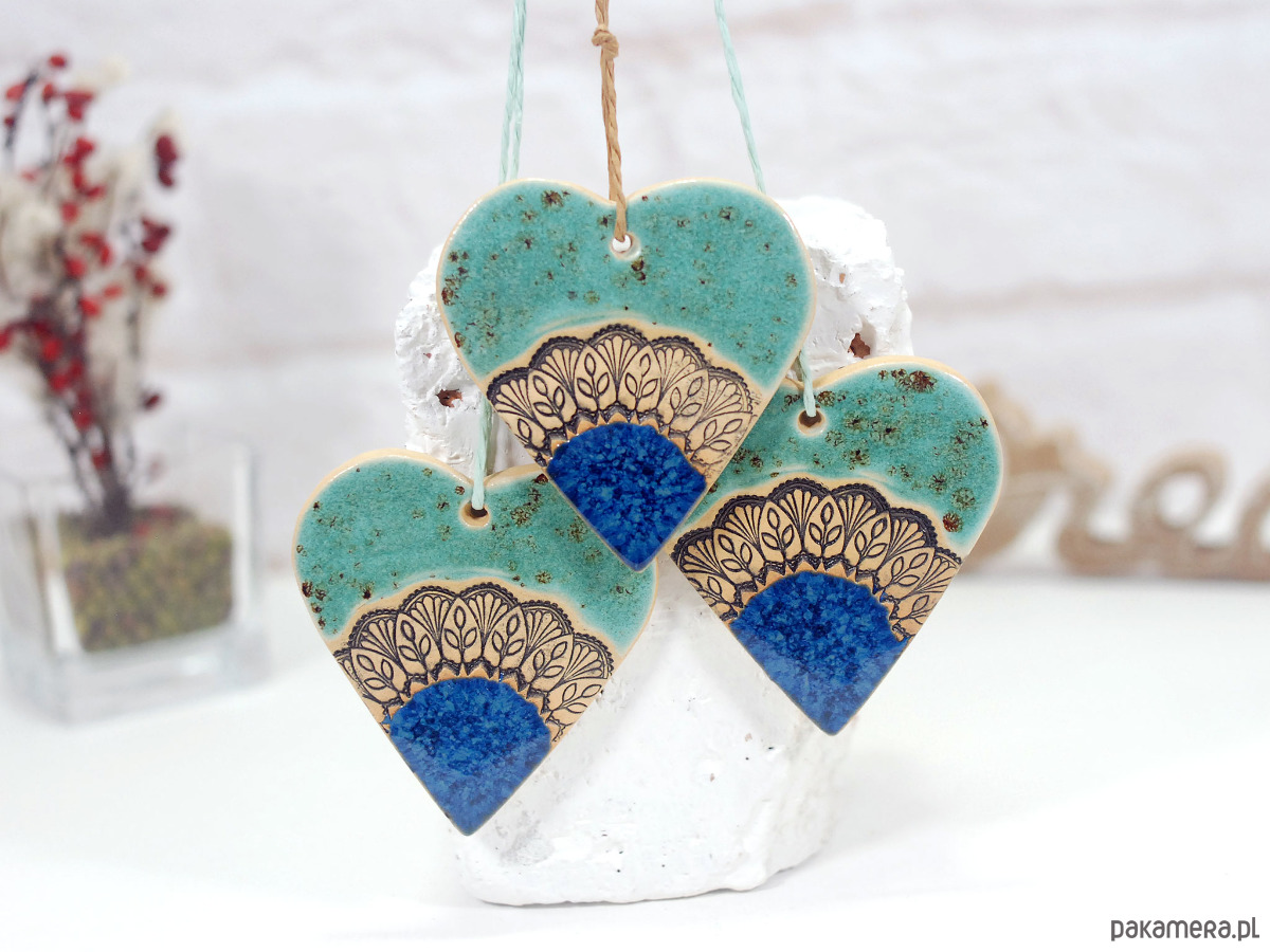 3 ręcznie robione i malowane ceramiczne ozdoby serca.