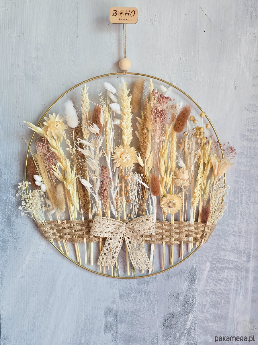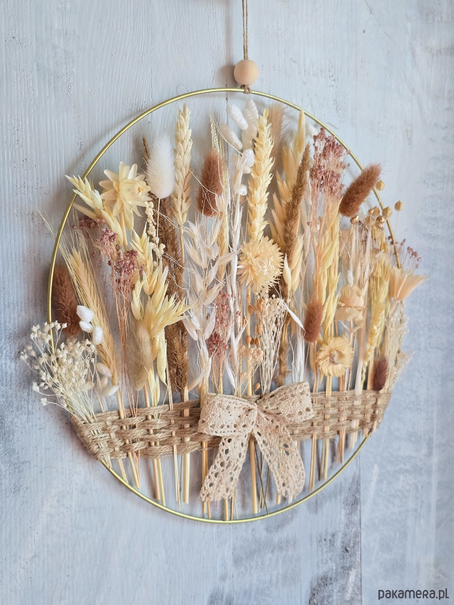 Złota obręcz ozdobiona sznurkiem jutowym, suszonymi kwiatami oraz romantyczną koronkową kokardą. Beże i brązy wprowadzą do wnętrza spokój, naturę i lekki rustykalny klimat. Idealnie sprawdzi się w salonie, sypialni, przedpokoju czy biurze. Dzięki neutralnej kolorystyce pasuje zarówno do wnętrz w stylu boho, skandynawskim, rustykalnym, jak i nowoczesnym.