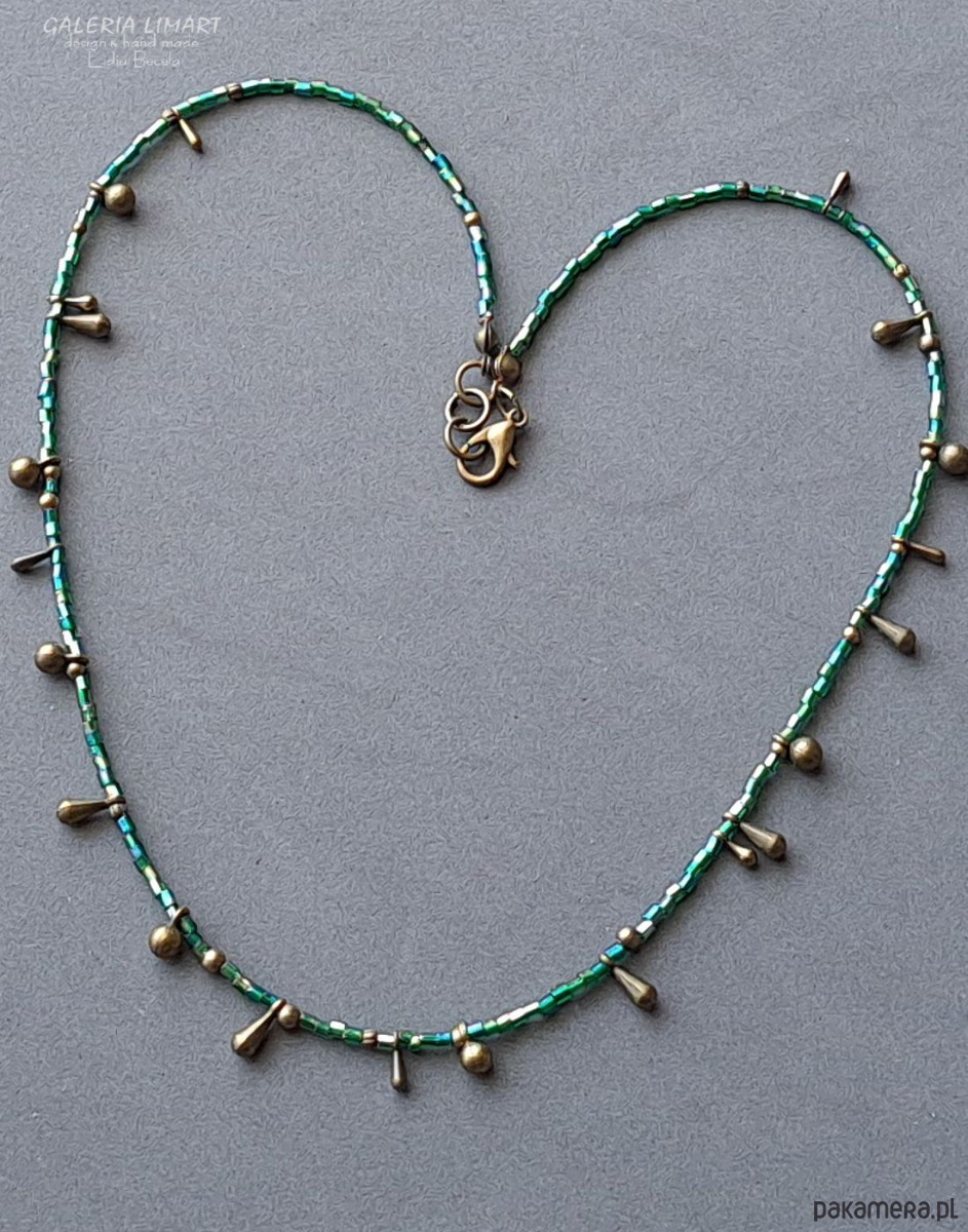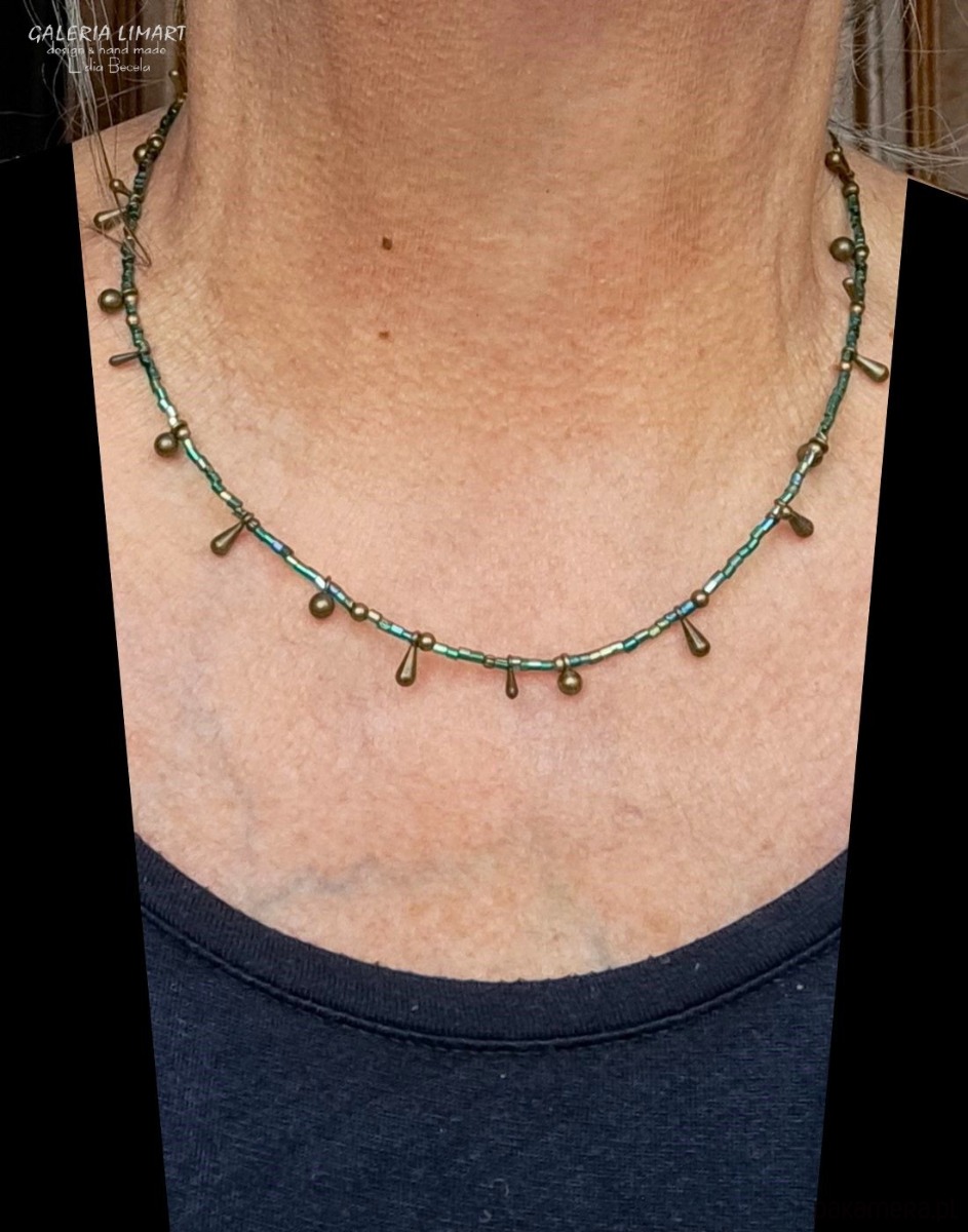 Lubisz styl BOHO? Jeśli tak to polecam ten uroczy i bardzo prosty wręcz minimalistyczny ale bardzo ozdobny naszyjnik. Drobniutkie szmaragdowe opalizujące szklane koraliki zostały dodatkowo ozdobione przywieszkami w kształcie kropelek w kolorze starego złota z mosiądzu, co ogromnie spotęgowało ozdobny efekt tego naszyjnika. Niby nic, a skutek fantastyczny. Pracochłonny.