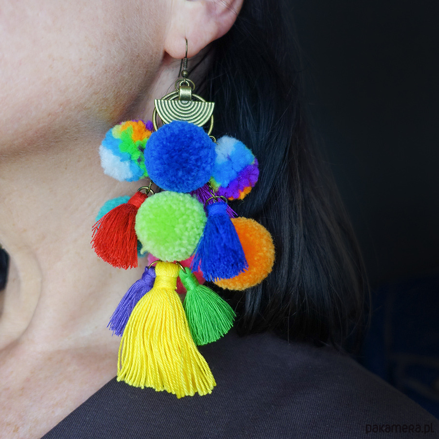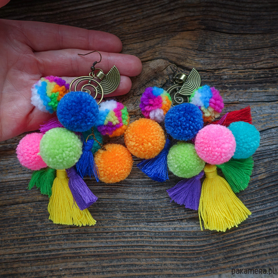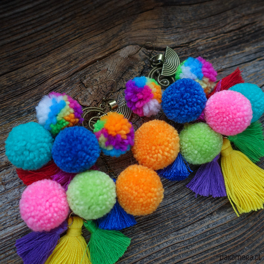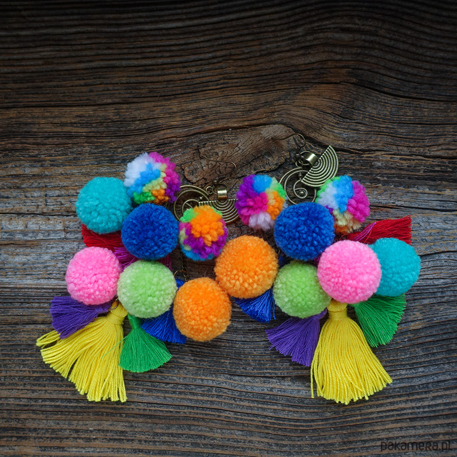 Niezwykle optymistyczne i przyciągające uwagę kolczyki wykonane z ręcznie robionych pomponów oraz chwostów.