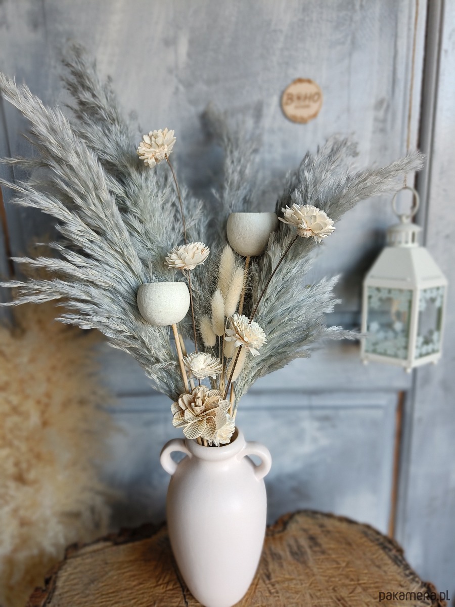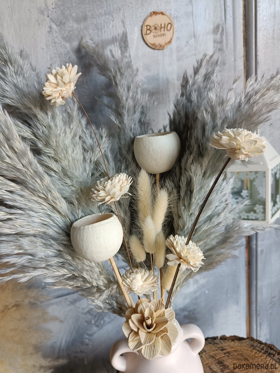 Boho kompozycja do wazonu z szarymi trawami pampasowymi i kremowymi dodatkami.