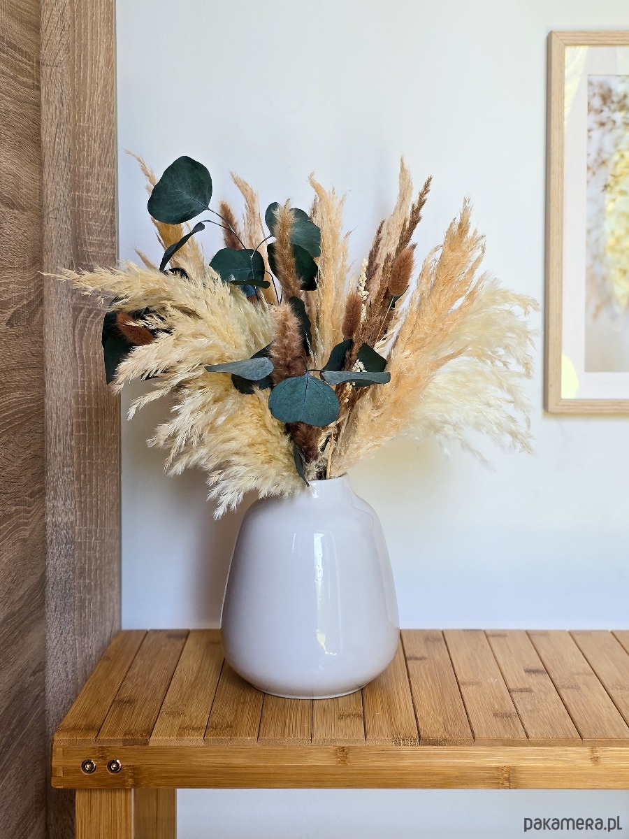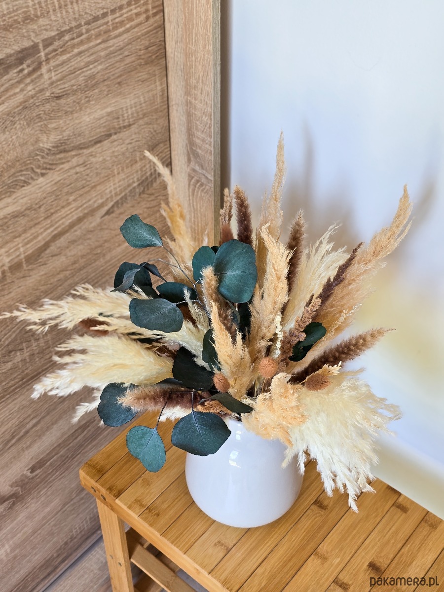 Ten wyjątkowy bukiet to idealna propozycja dla miłośników stylu boho, rustykalnego i skandynawskiego. Naturalne trawy pampasowe w beżowych odcieniach pięknie łączą się z zielenią eukaliptusa i innymi suszonymi roślinami, tworząc ponadczasową dekorację do wazonu.