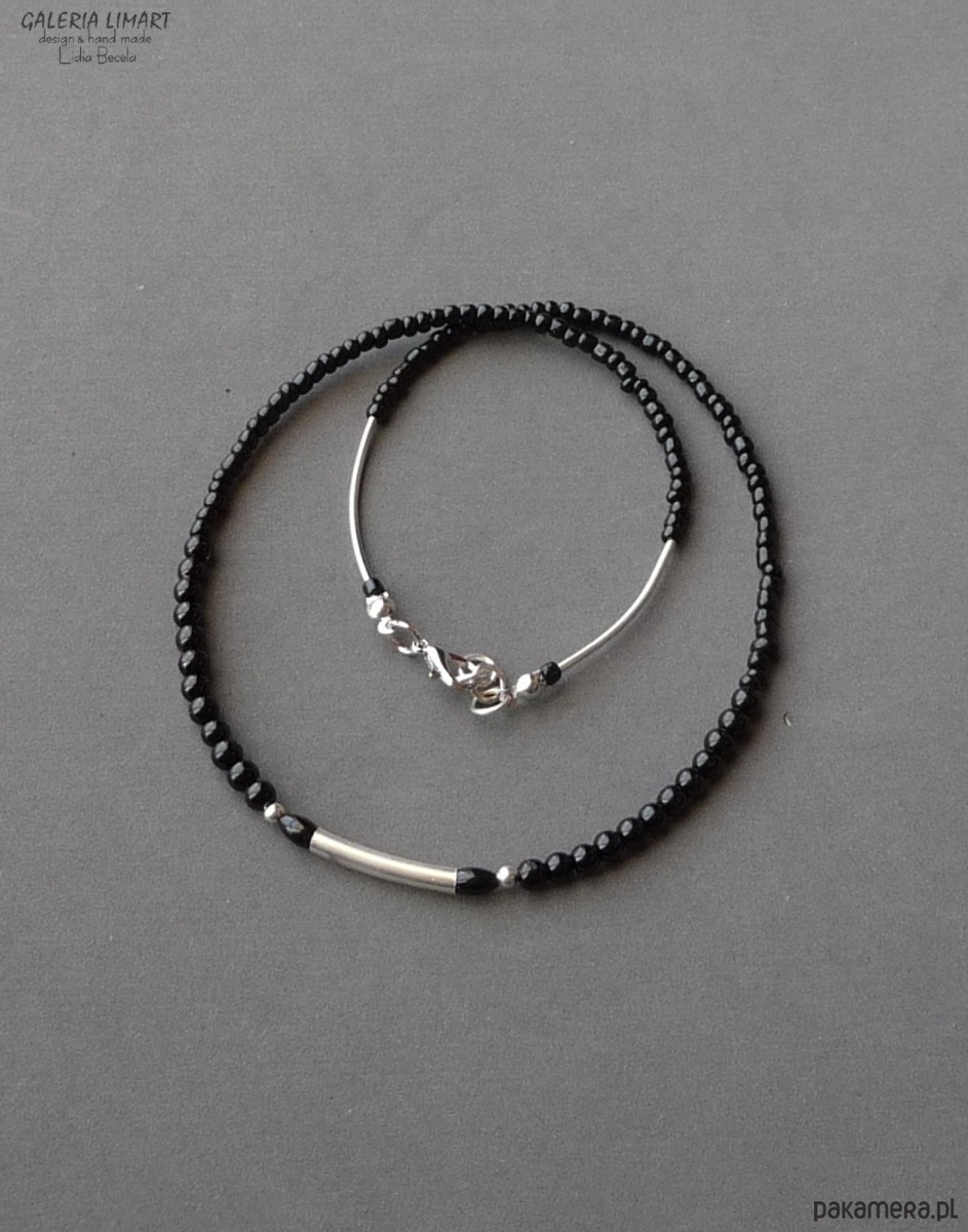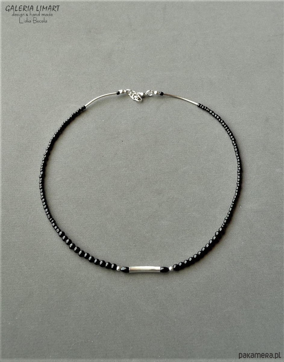 Uroczy minimalistyczny naszyjnik z mnóstwa drobnych czarnych szklanych koralików (seed beads) dodatkowo ozdobiobny stalowymi rurkami. Dla NIEGO lub dla NIEJ - unisex.
