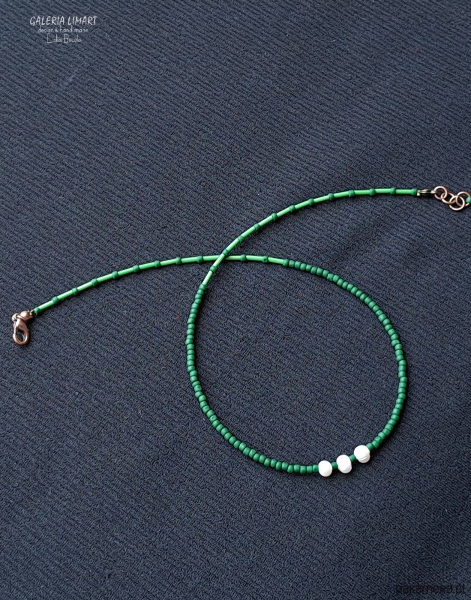 Uroczy minimalistyczny naszyjnik - choker z mnóstwa drobnych ciemno zielonych piękną leśną zielenią (fern) szklanych japońskich koralików TOHO dodatkowo ozdobiony trzema naturalnymi białymi perłami.