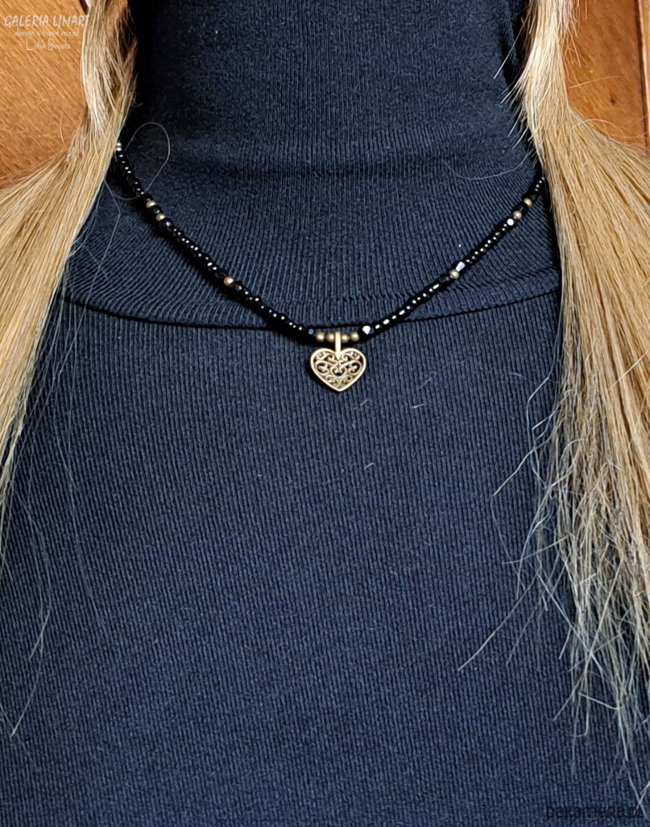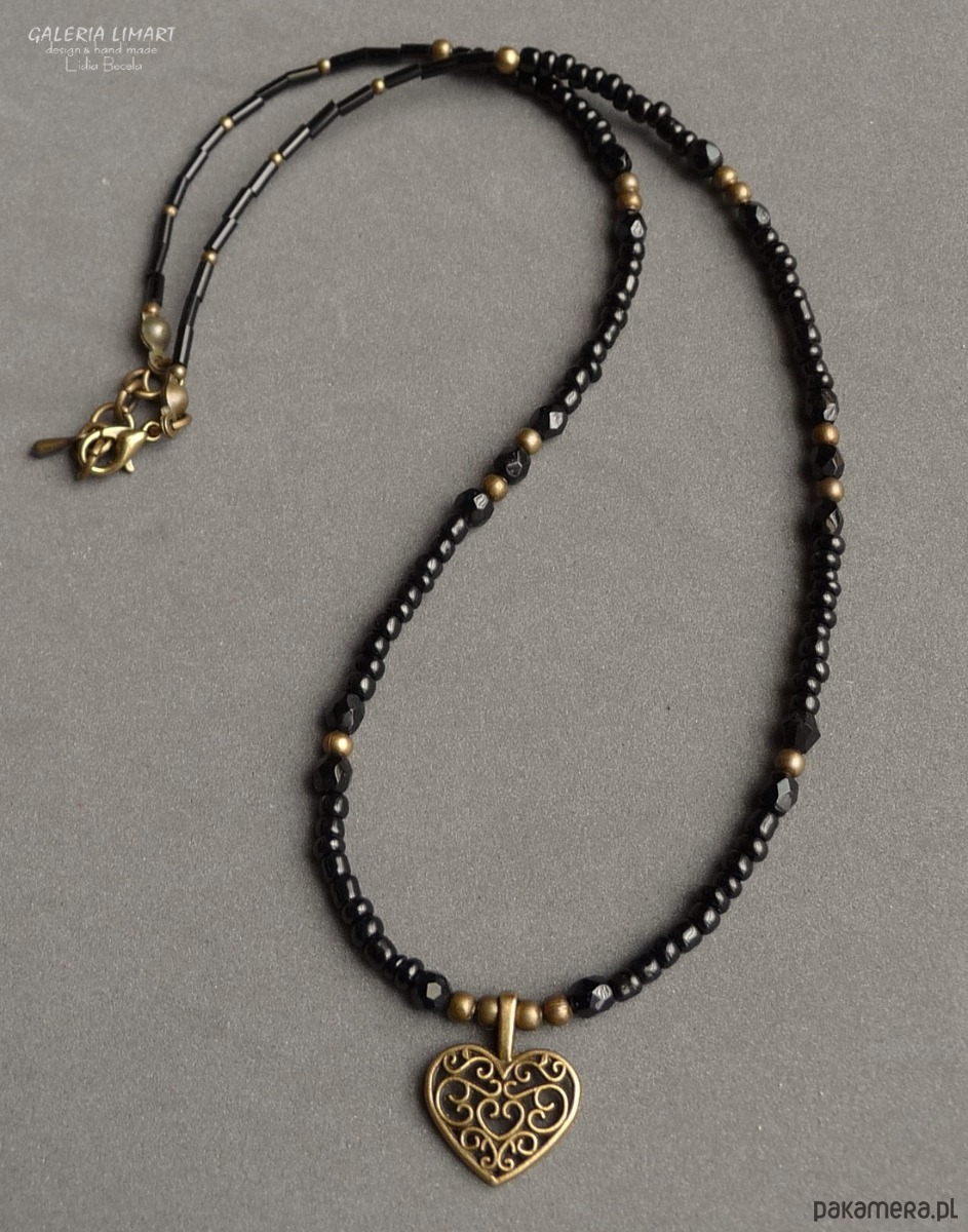 Lubisz styl BOHO? Jeśli tak to polecam ten uroczy, ozdobny i leciutki naszyjnik. Czarne w różnych kształtach i wielkościach śliczne czeskie kryształki i drobniutkie szklane koraliki dały cudowny efekt lekkiego, zwiewnego i spektakularnego naszyjnika, dodatkowa ozdoba w kształcie ażurowego serduszka dodała temu naszyjnikowy szczególnego uroku.