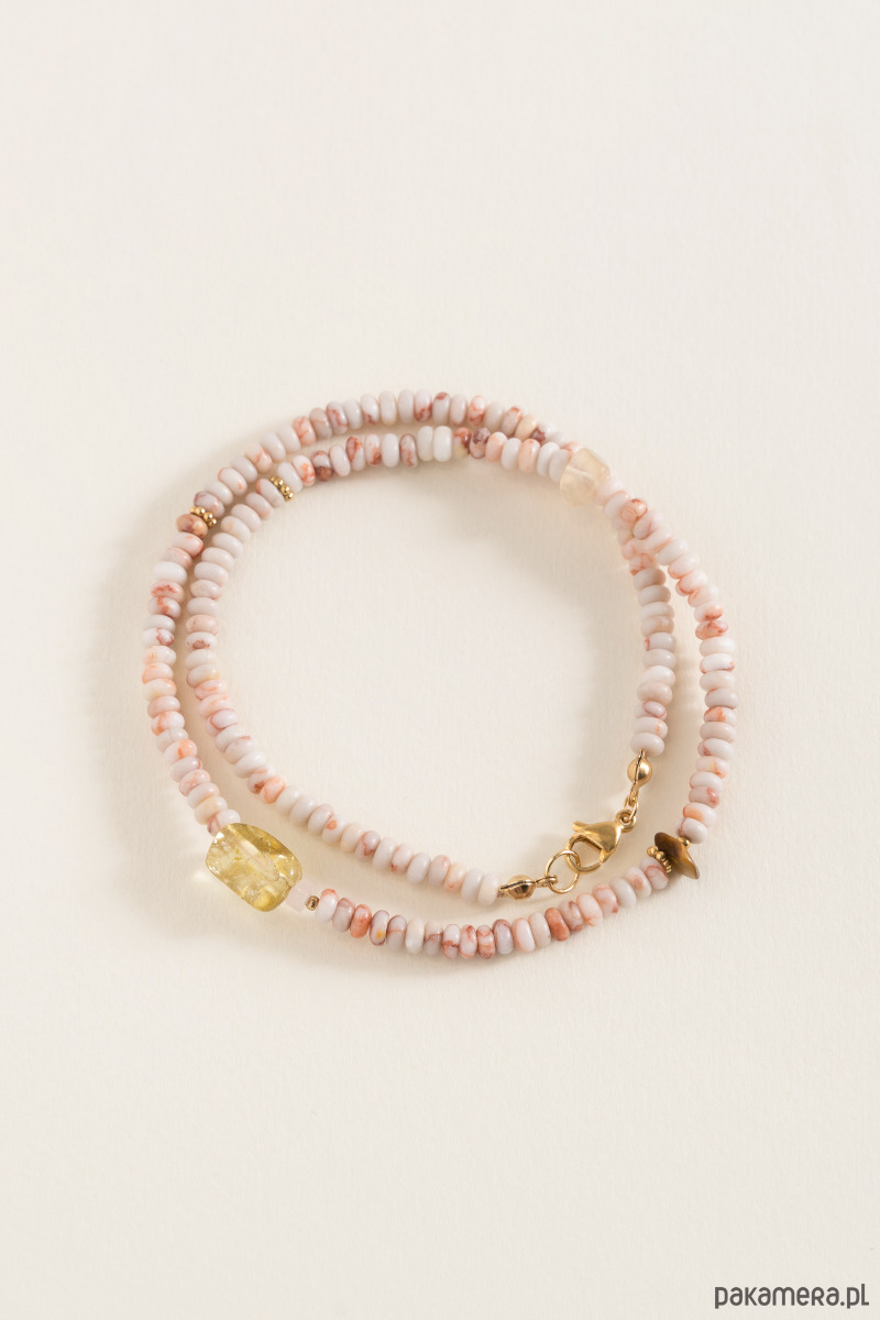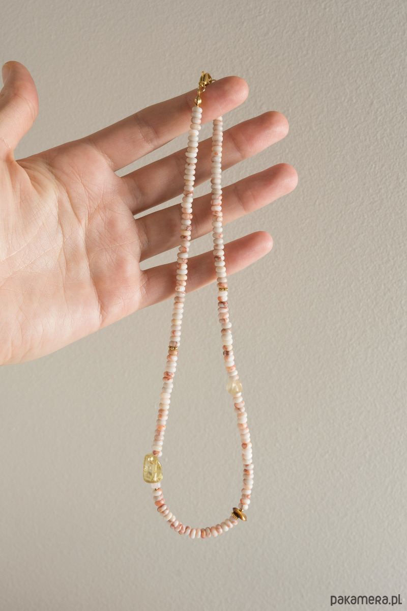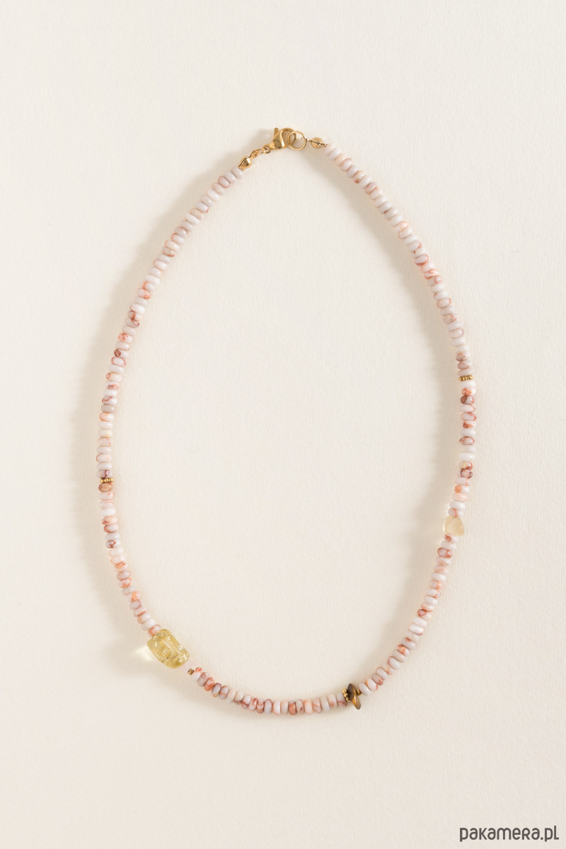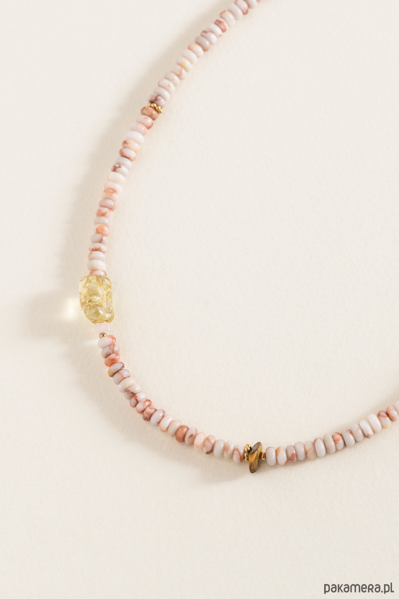 Naszyjnik wykonano z kamieni naturalnych. Głównym kamieniem jest jaspis, a w nieregularnych kształtach pojawiają się fluoryt, kwarc i tygrysie oko. Złote przekładki i elementy zapięcia wykonano ze złotej stali chirurgicznej.