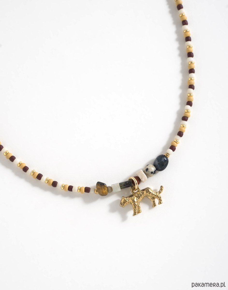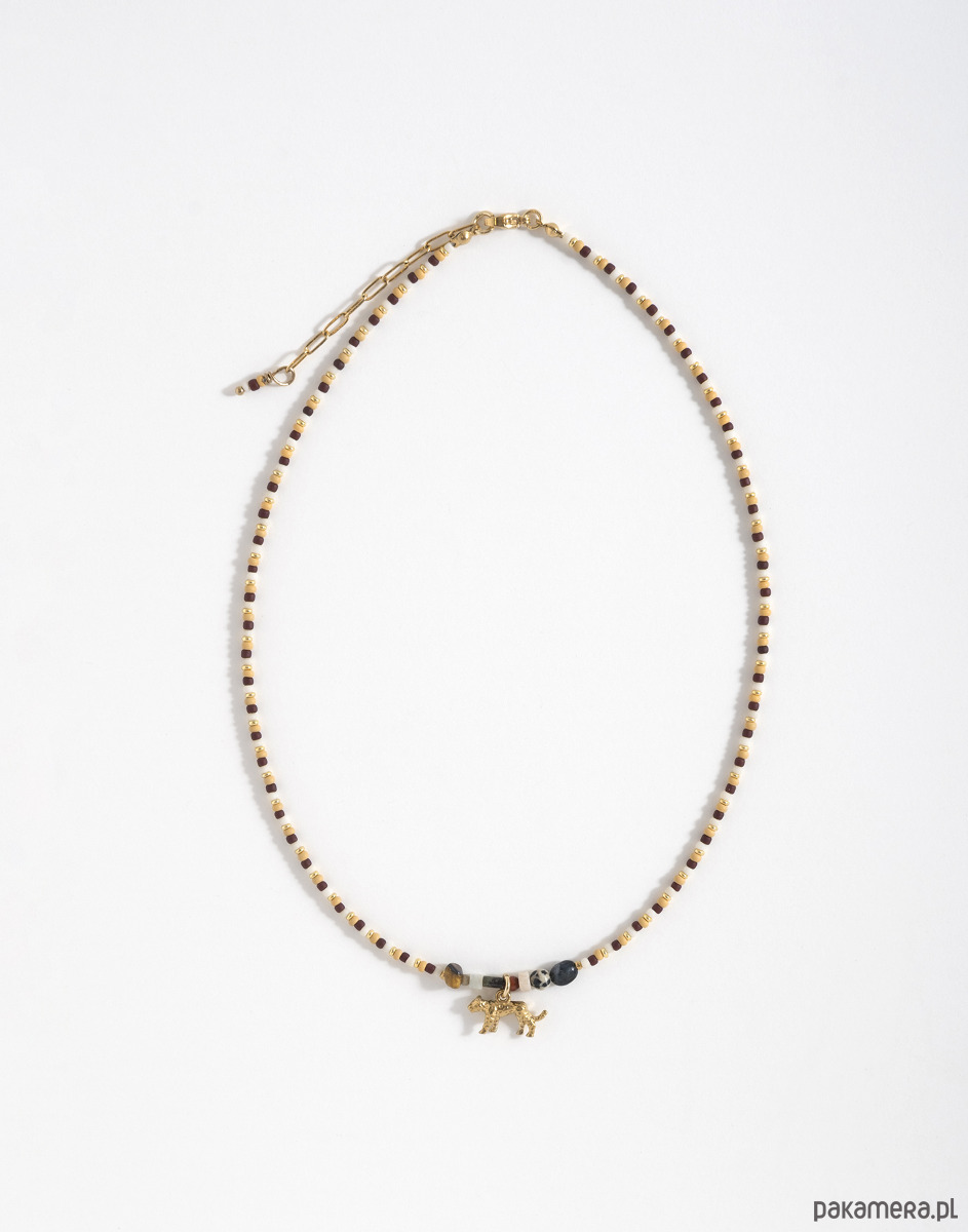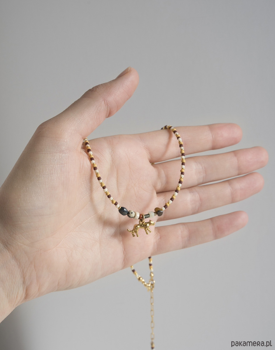 Naszyjnik wykonano ręcznie z koralików TOHO oraz z kamieni naturalnych. Zawieszka w kształcie geparda oraz elementy zapięcia są ze złotej stali chirurgicznej.