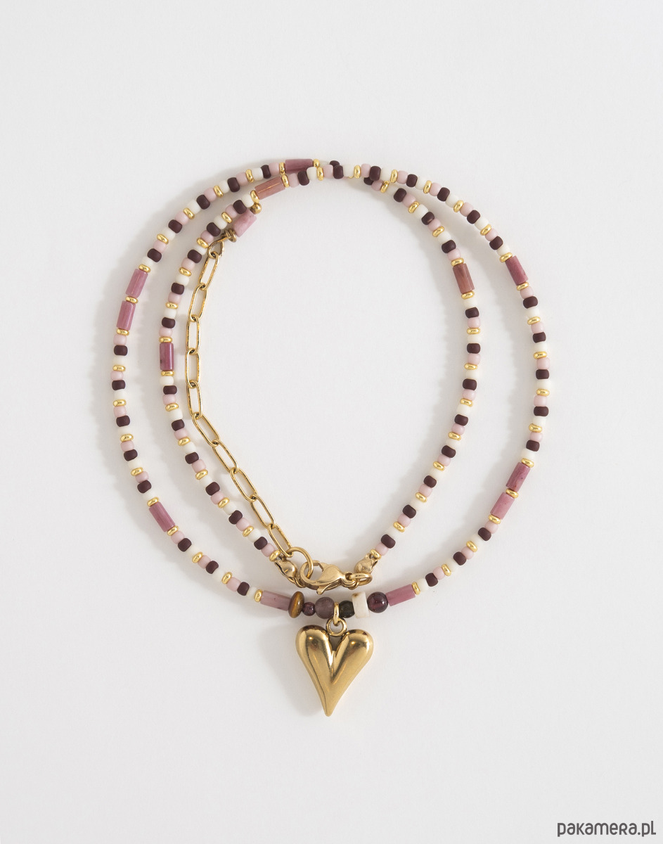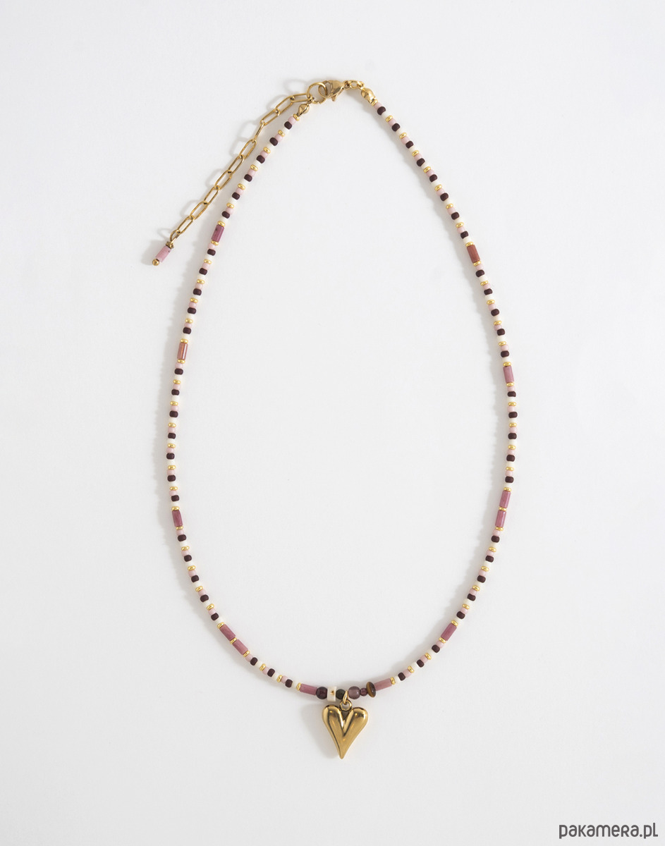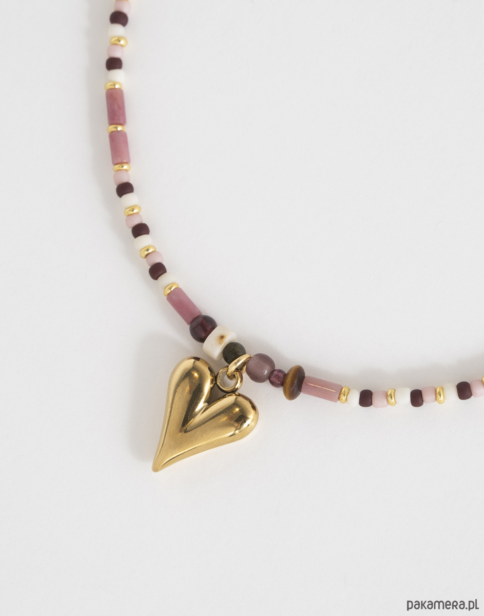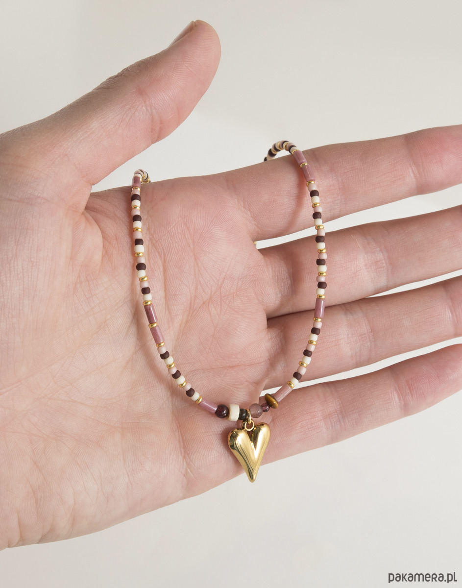 Naszyjnik wykonano ręcznie z koralików TOHO oraz z kamieni naturalnych. Zawieszka w kształcie serca oraz elementy zapięcia są ze złotej stali chirurgicznej.