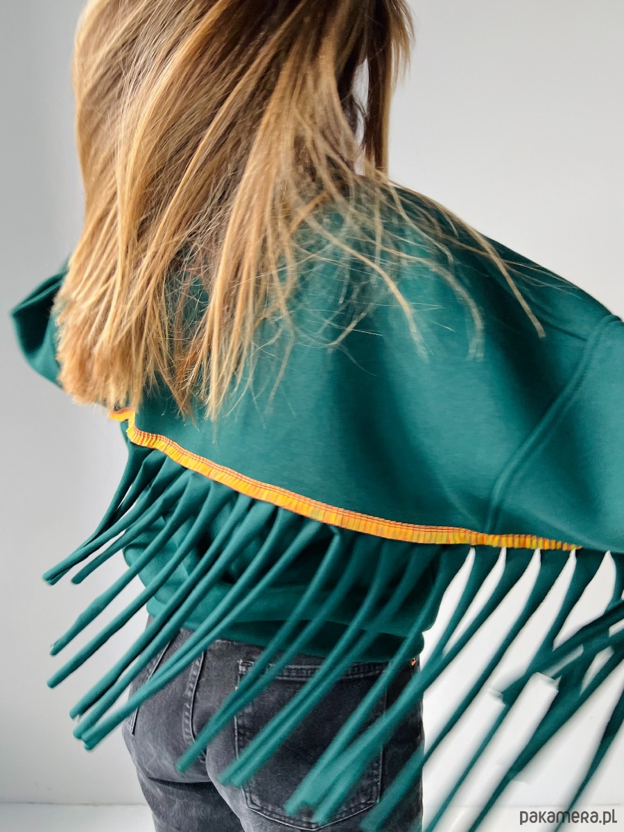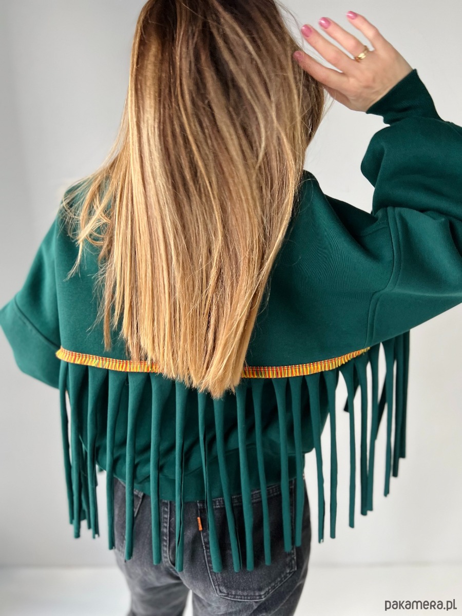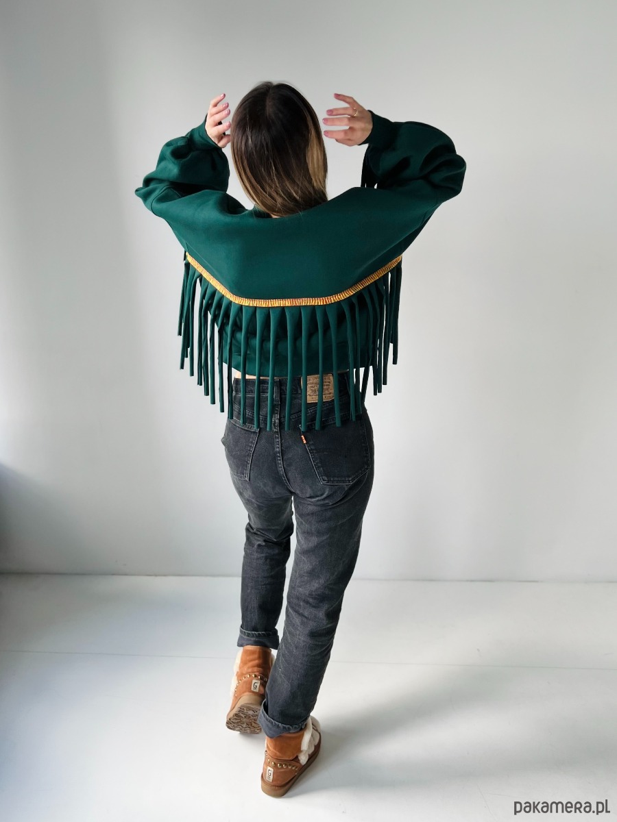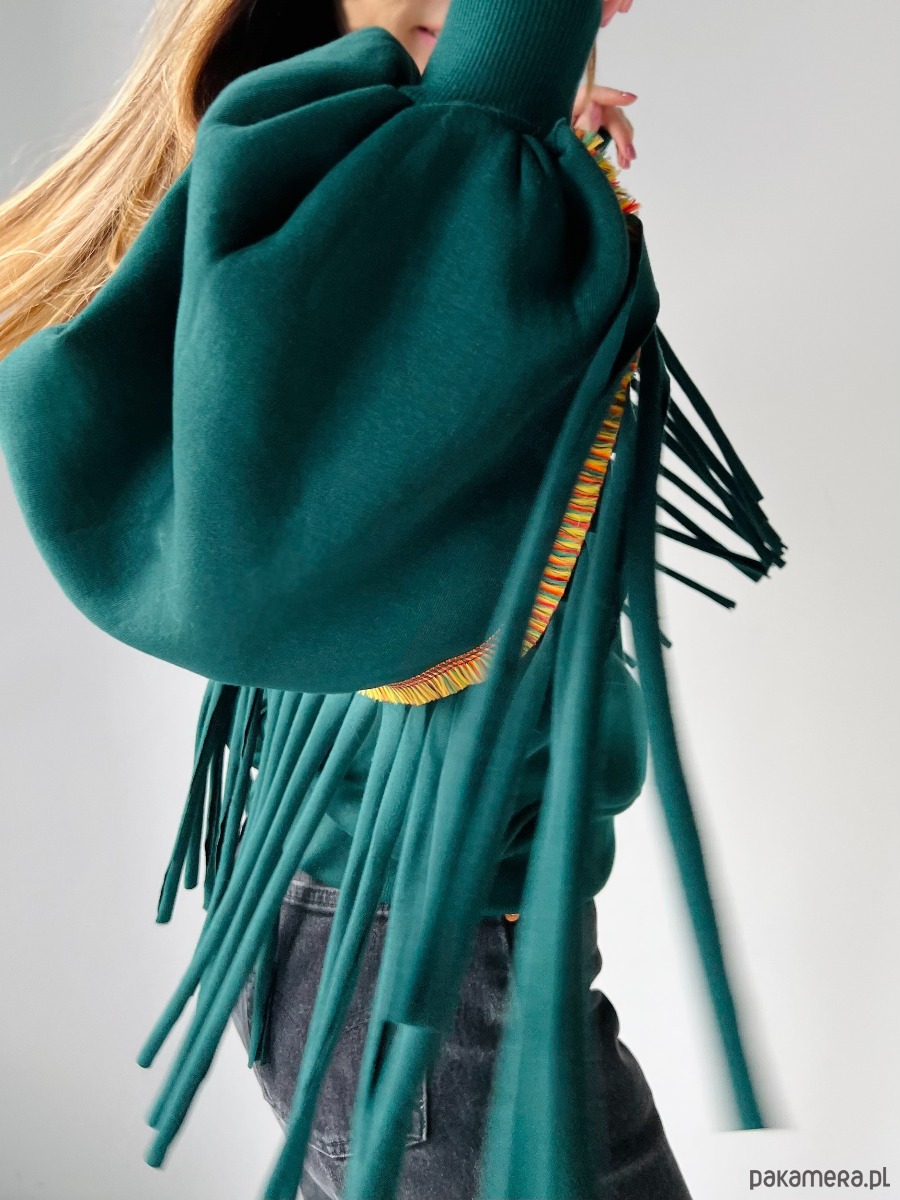 Bluzę charakteryzują również bogate zdobienia w postaci frędzli i taśmy, a także obszernych, bufiastych rękawów.