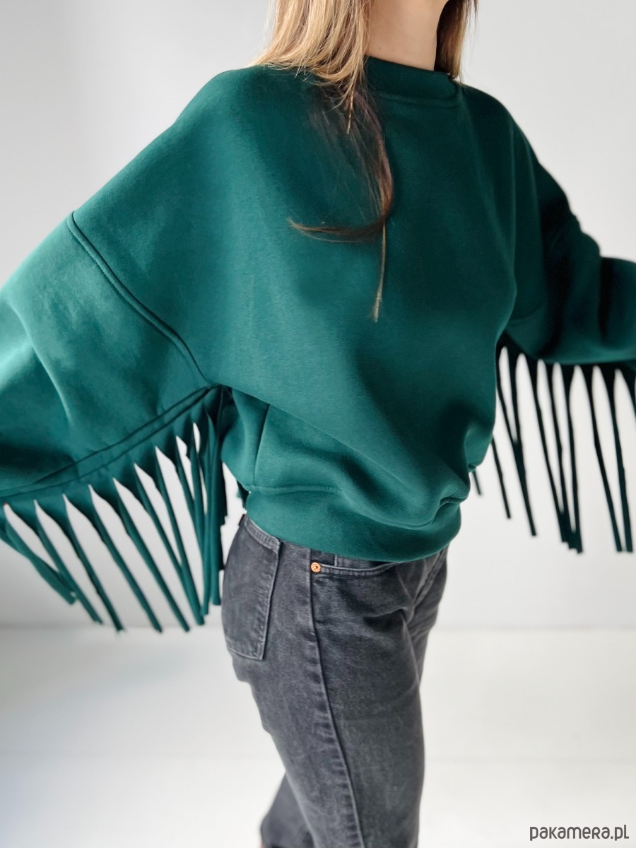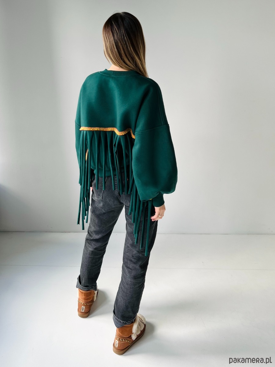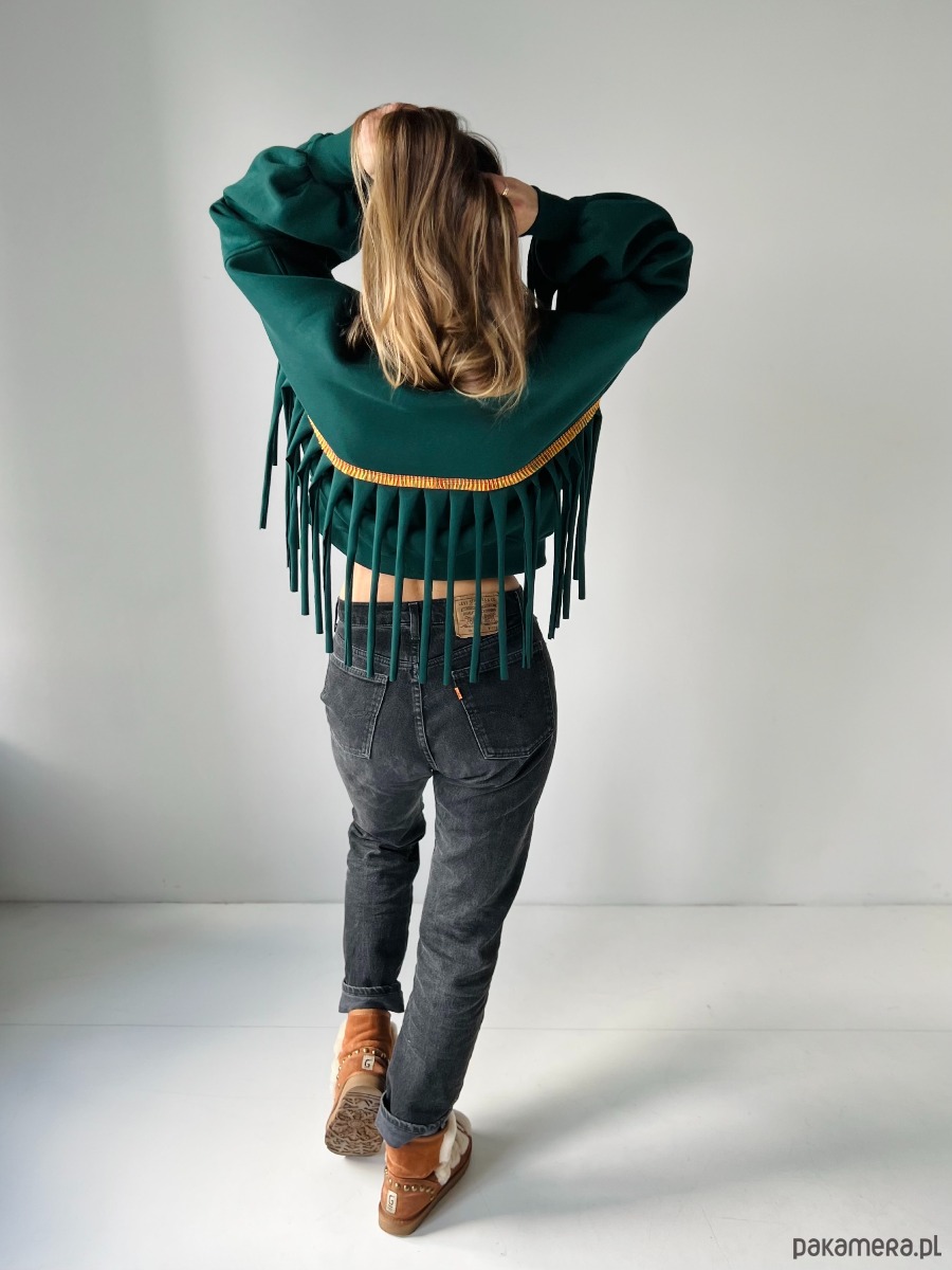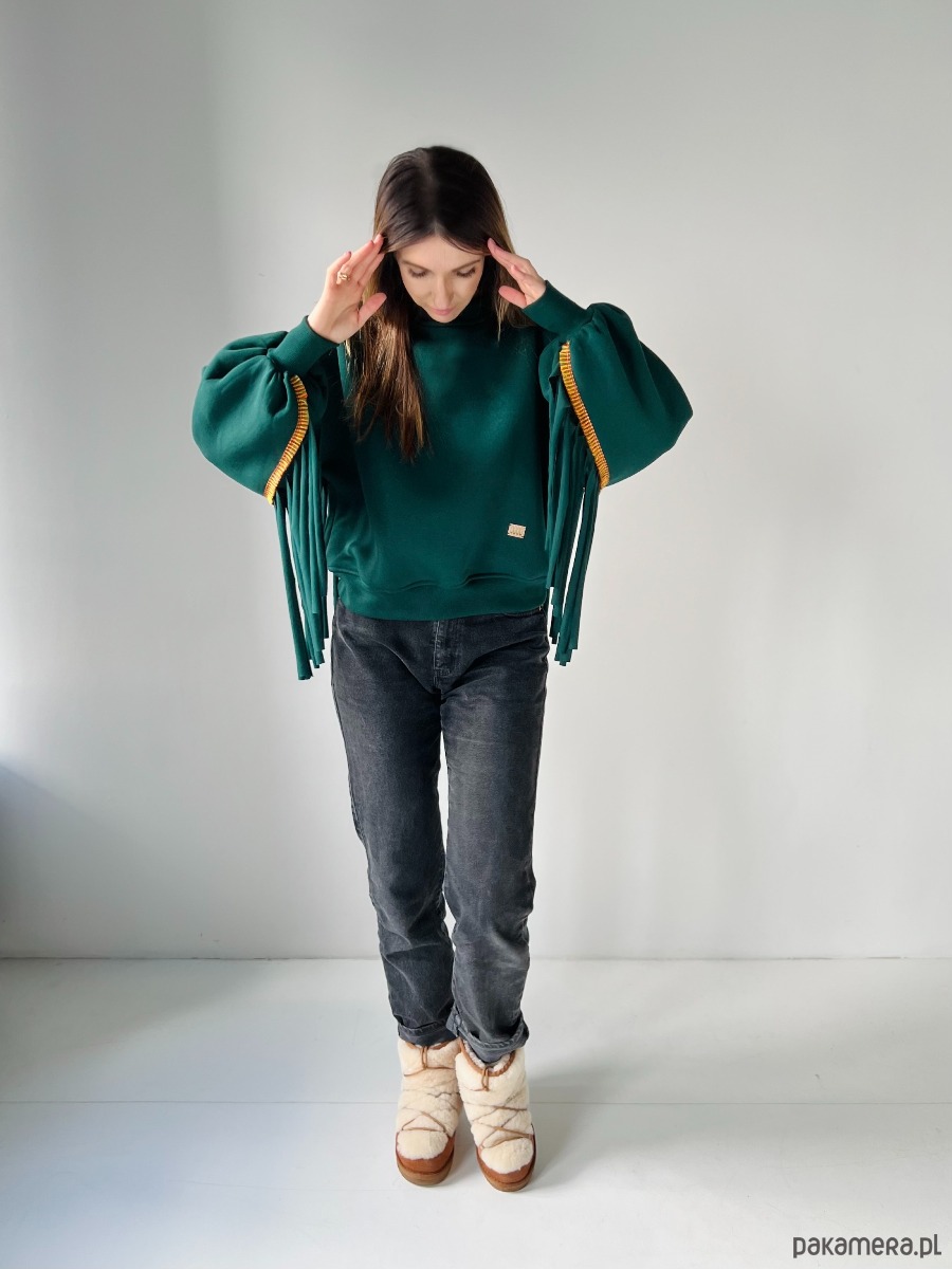 Bluzę charakteryzują również bogate zdobienia w postaci frędzli i taśmy, a także obszernych, bufiastych rękawów.