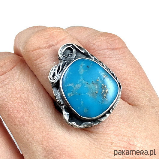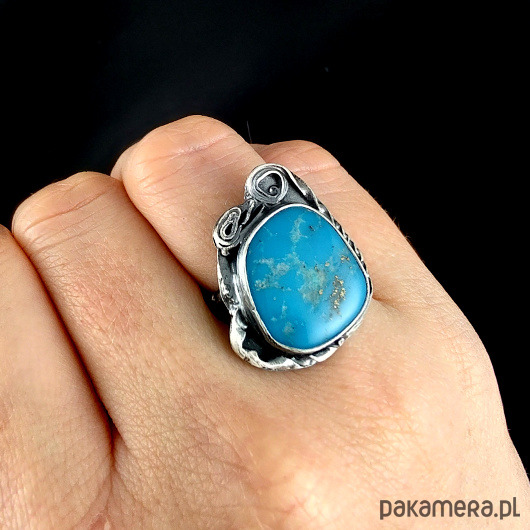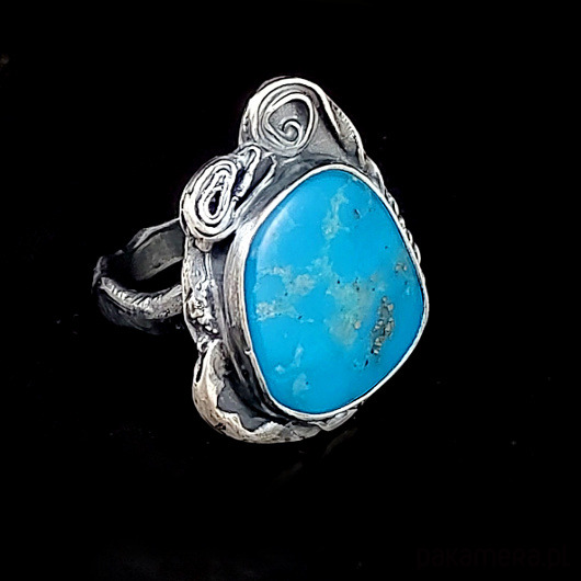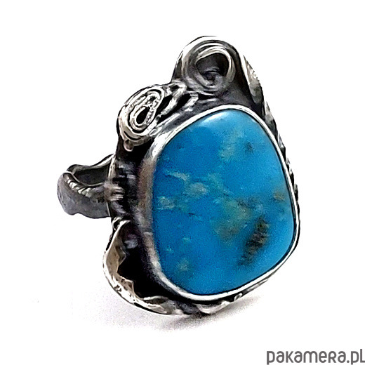 Pierscionek w misternej oprawie oksydowanego srebra próby 925 z naturalnym turkusem. Wymiary oprawy całości 26 x 20 mm, rozmiar jubilerski 15, mogę powiększyć max. na 16. Waga 8 gramów. Obrączka ma 4 mm szerokości. Pierścień zostanie zapakowany w ozdobne pudełeczko