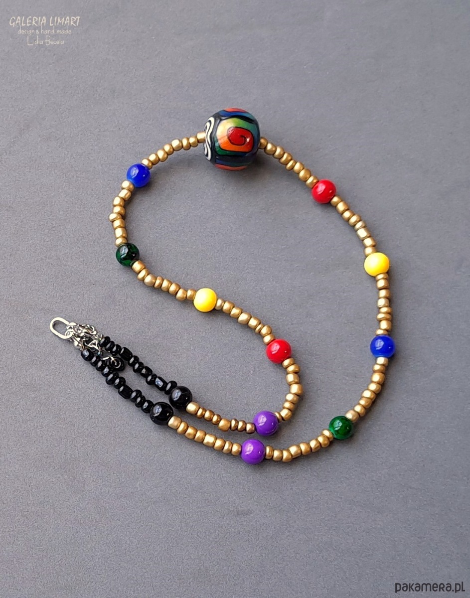 Kolorowe koraliki zostały poprzedzielane drobnymi szkalnymi koralikami (seed beads) w złotym kolorze, a całość zwieńczona dużą (śr. ok. 2 cm) bajecznie kolorową kulą ręcznie stworzoną z masy plastycznej fimo.