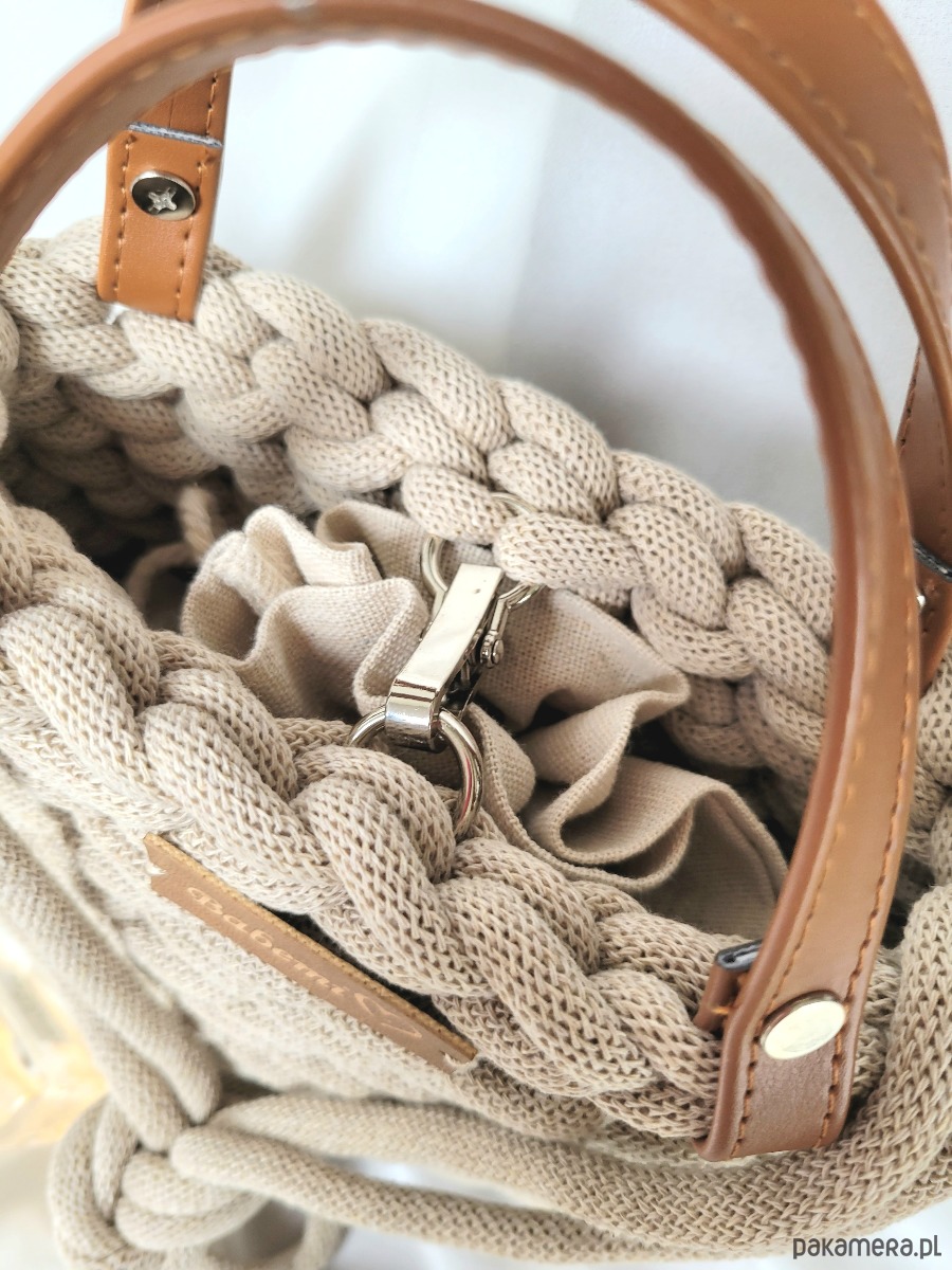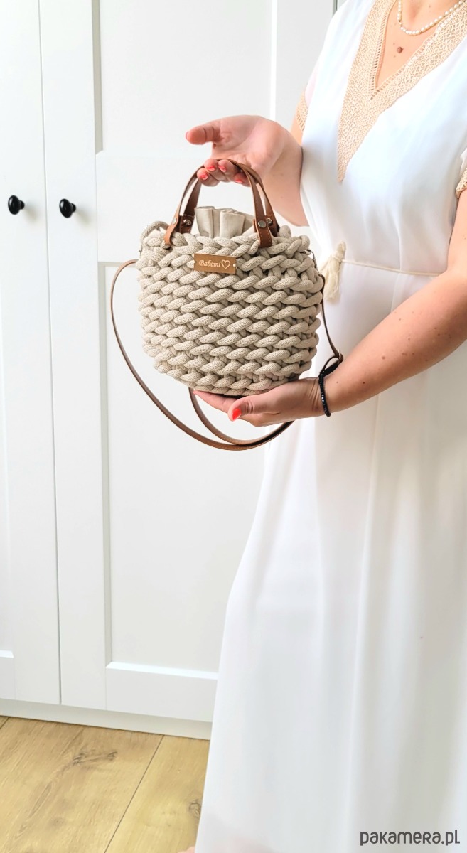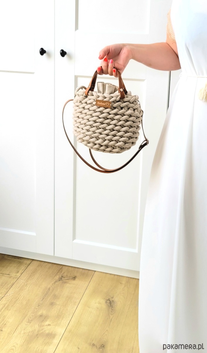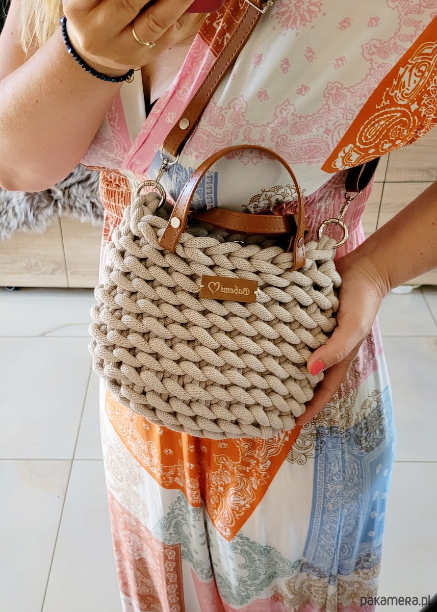 Szalenie modna i efektowna torebka z grubego sznurka bawełnianego z lużno włożoną sakiewką ala lnianą.