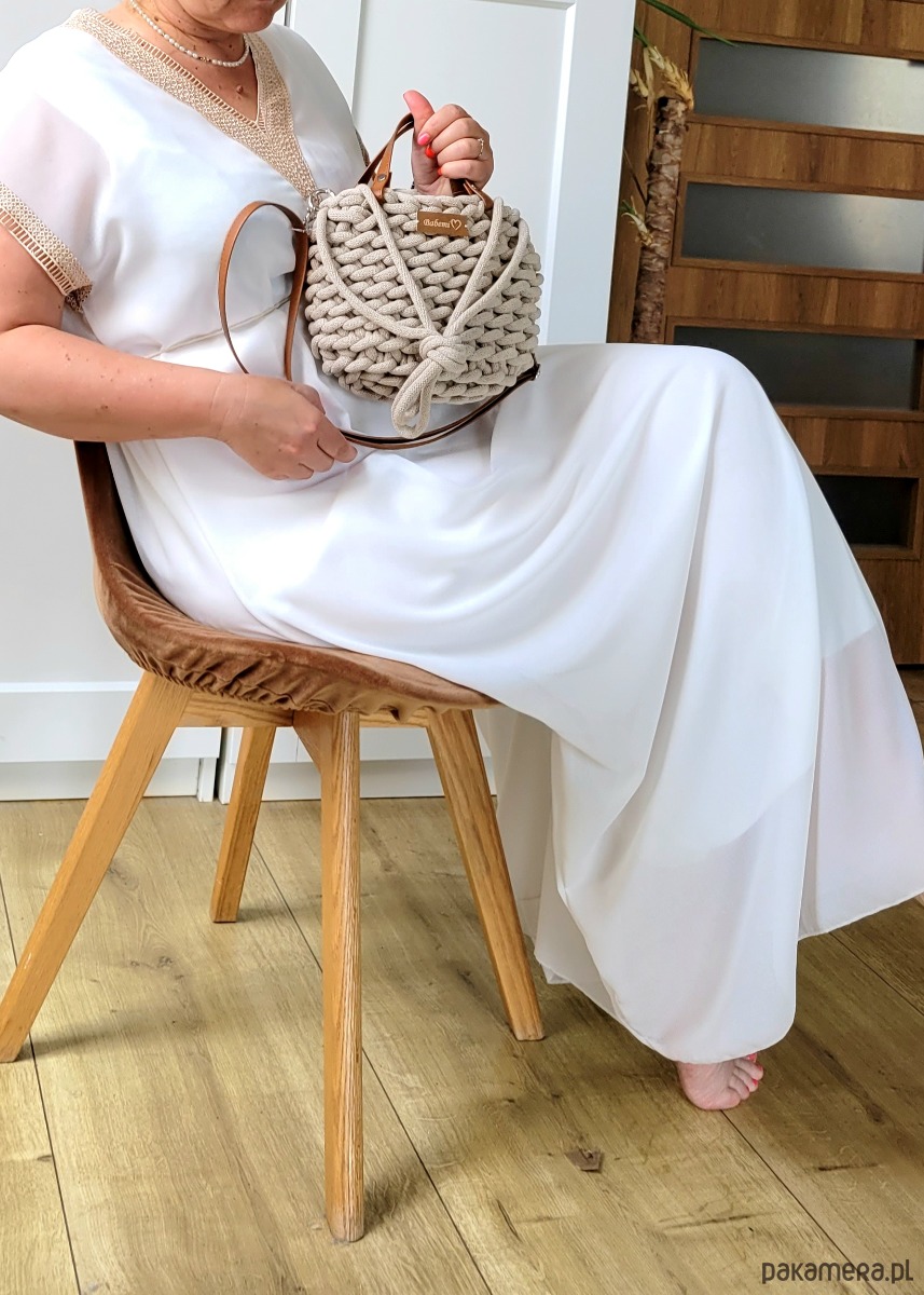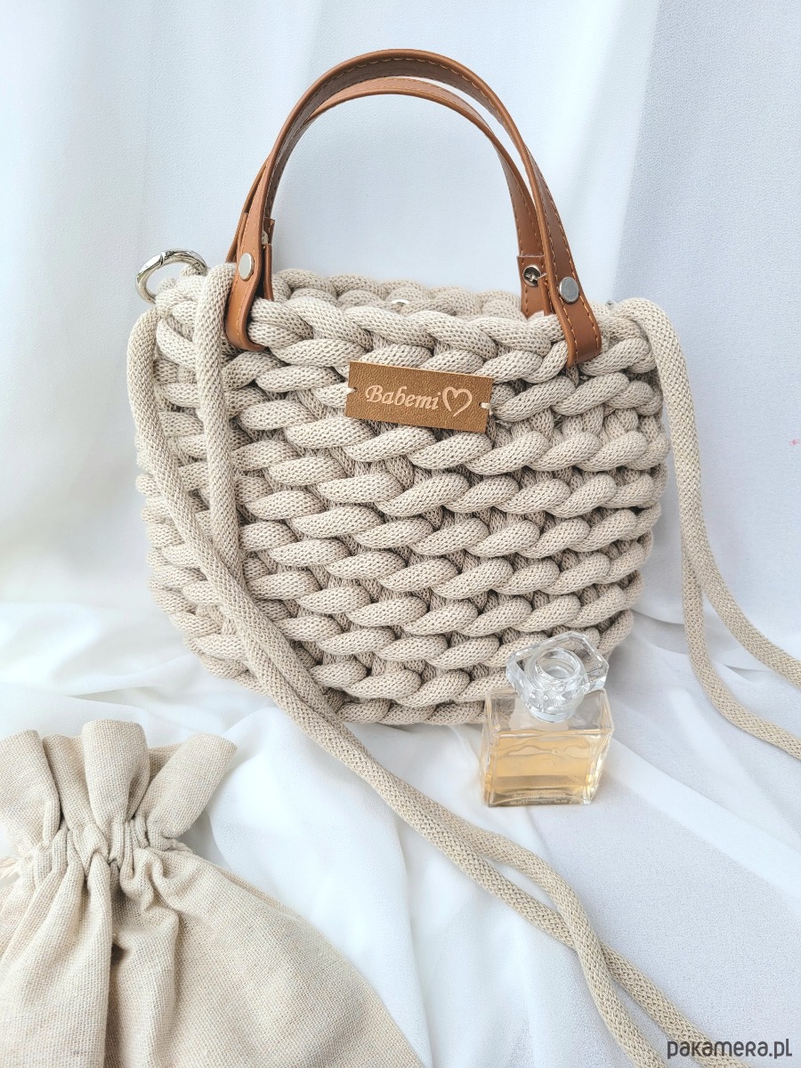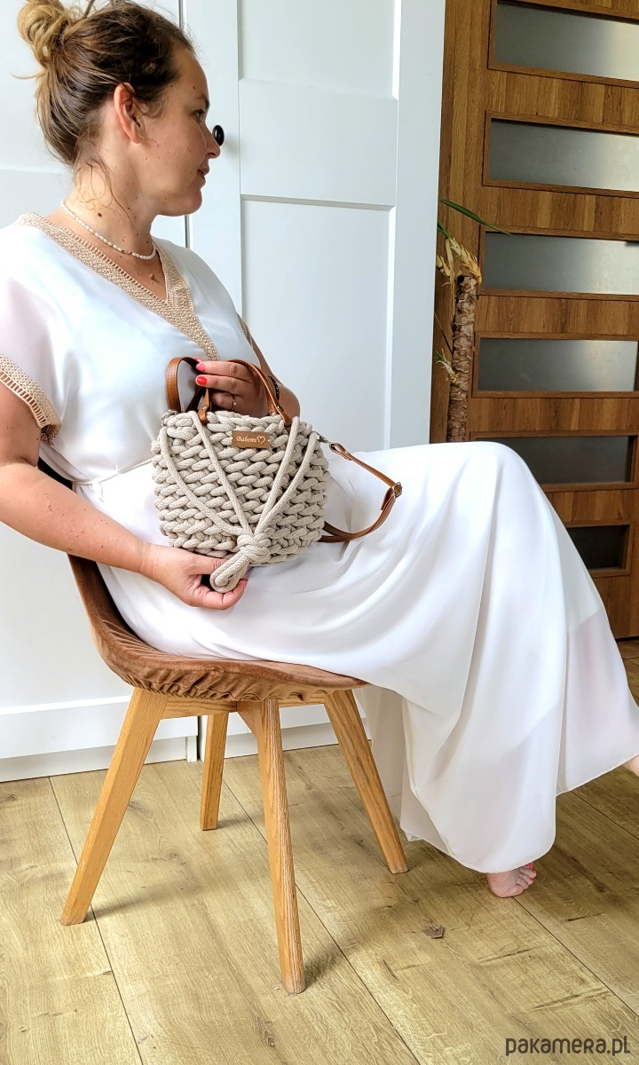 Szalenie modna i efektowna torebka z grubego sznurka bawełnianego z lużno włożoną sakiewką ala lnianą.