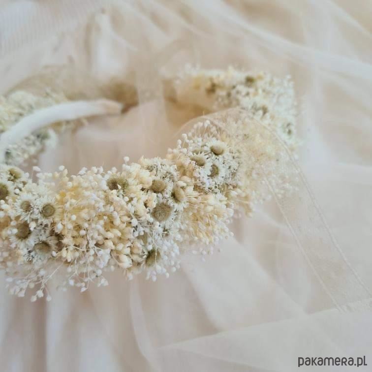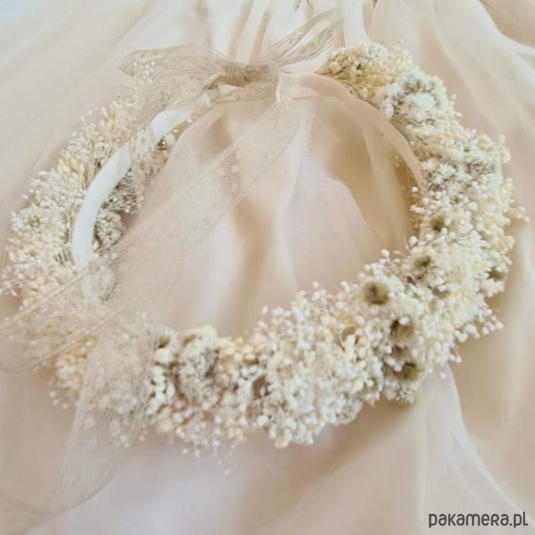Wianek na głowę wykonany z naturalnej, stabilizowanej hortensji oraz gispówki.