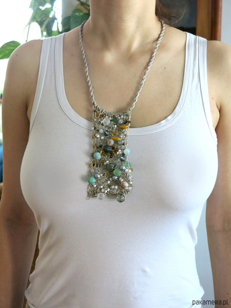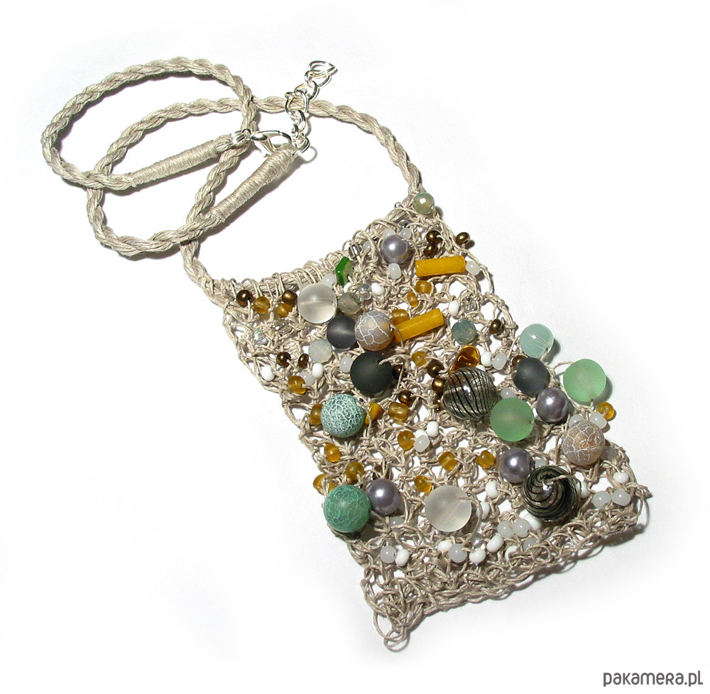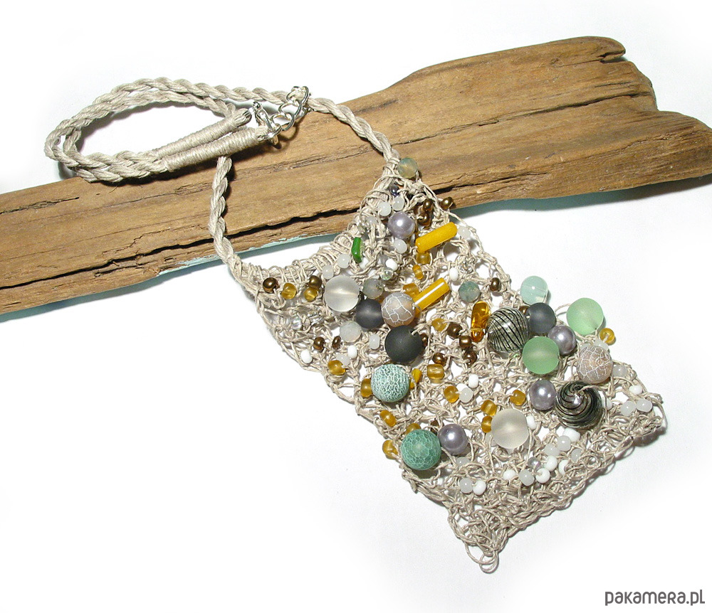 Naszyjnik inspirowany bałtycką plażą. Powstał na bazie naturalnej przędzy lnianej wyplecionej w kształt luźnego wisiora, w którym znajdują się elementy szklane, jadeit, agaty, masa perłowa i szkło dmuchane.