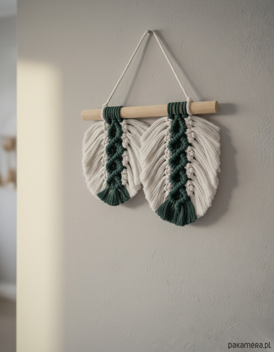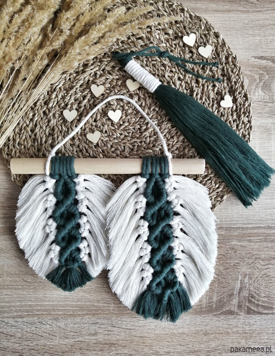 Liście makramowe ze splotem w środku, wykonane ręcznie ze sznurka skręcanego w kolorze naturalnym i butelkowej zieleni. Dodatkowo zawieszka chwost, która może ozdobić klamkę, uchwyt witryny lub wg własnego uznania.