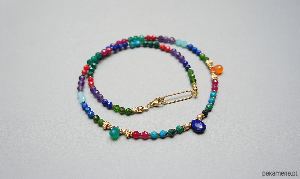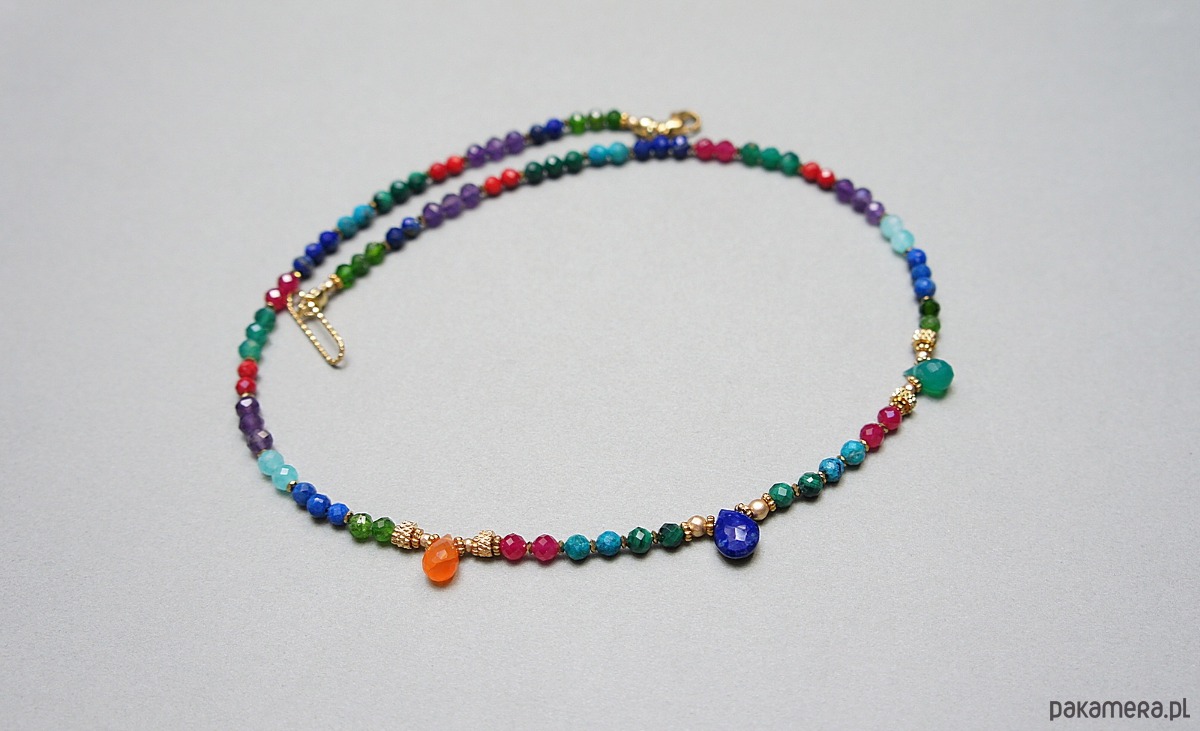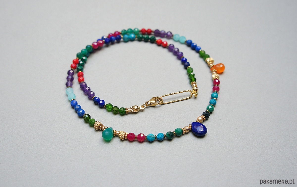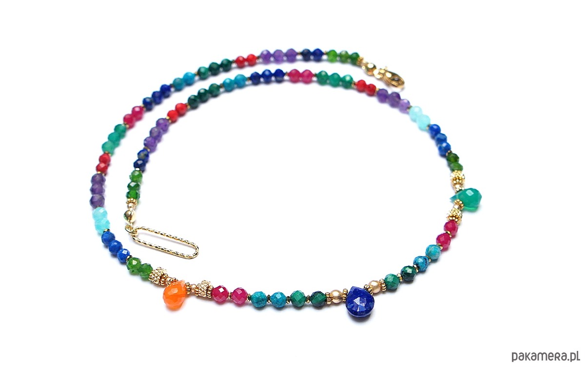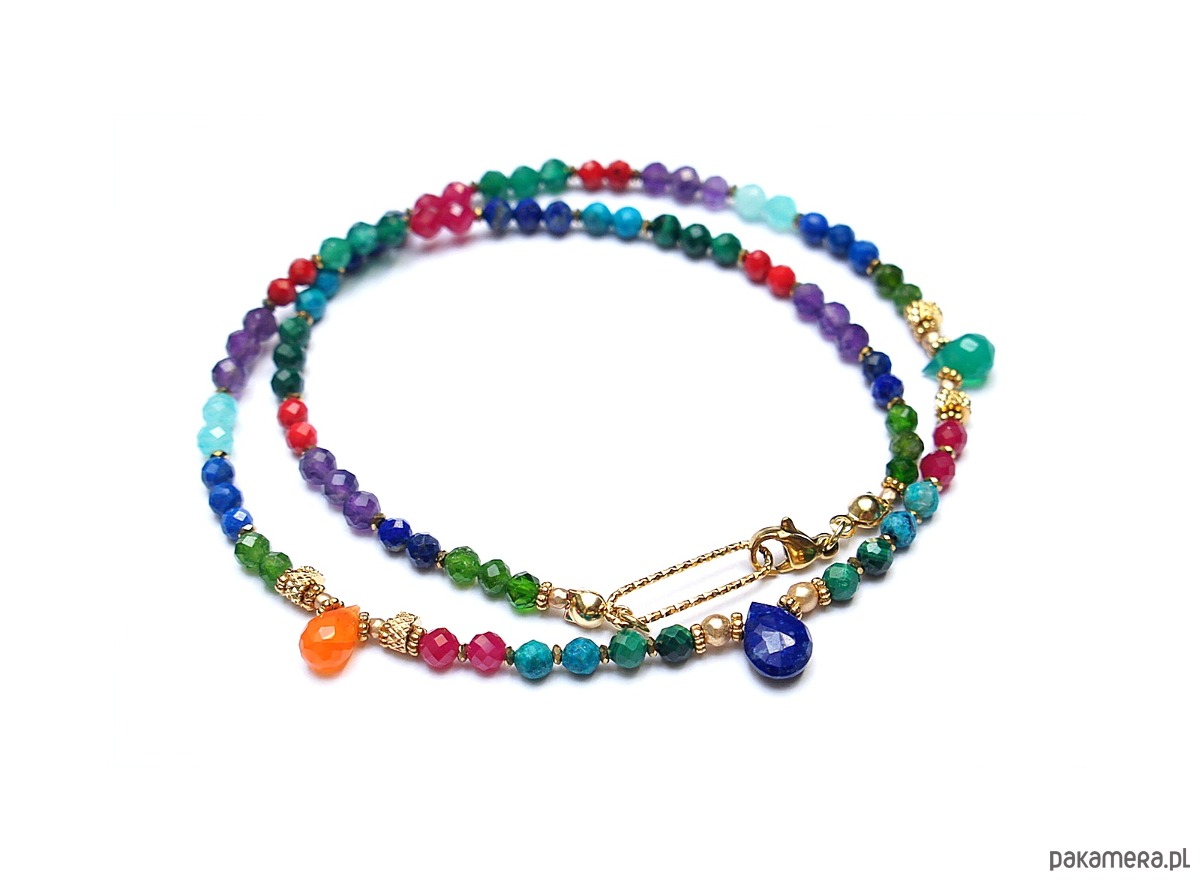 Krótki naszyjnik wykonany w całości z pozłacanej stali szlachetnej oraz naturalnych kamieni - lapis lazuli [3mm], malachit [4mm], koral naturalny [3mm], apatyt [4mm], ametyst [4mm], jadeit [4mm], diopsyd [3mm], turkus naturalny [4mm], onyks zielony [4mm], brioletek lapis lazuli, karneolu, zielonego onyksu, hematytu matowego, platerowanego [2mm oraz 3mm]. Naszyjnik o długości ok. 45,5cm. Biżuteria ozdobnie zapakowana.