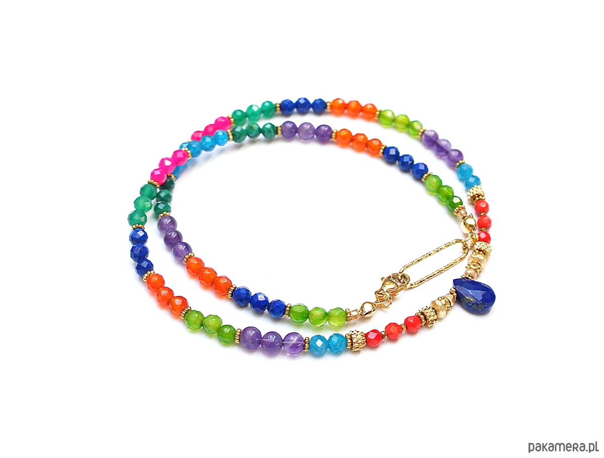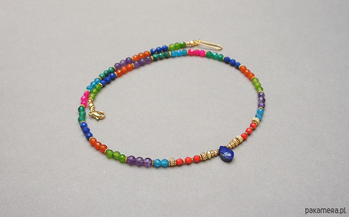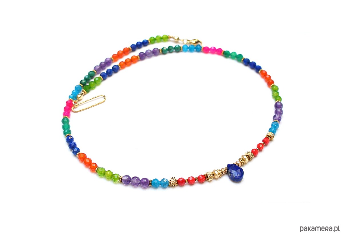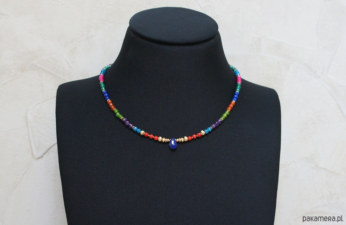 Krótki naszyjnik wykonany w całości z pozłacanej stali szlachetnej oraz naturalnych kamieni - lapis lazuli [3mm], malachit [4mm], koral naturalny [3mm],karneol [4mm], apatyt [4mm], ametyst [4mm], onyks zielony [4mm], agatów fasetowanych [4mm], brioletki lapis lazuli, hematytu matowego, platerowanego [4x2mm, 3x2mm oraz 2mm]. Naszyjnik o długości ok. 44,5cm. Biżuteria ozdobnie zapakowana.