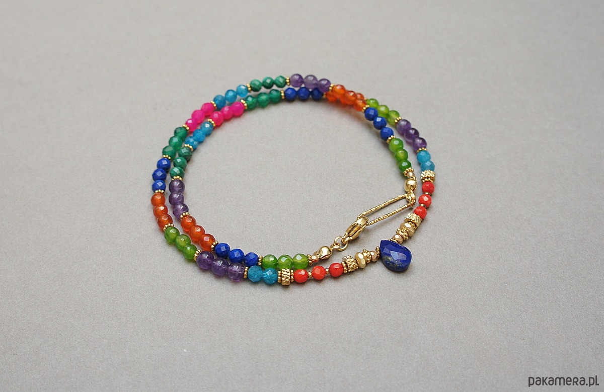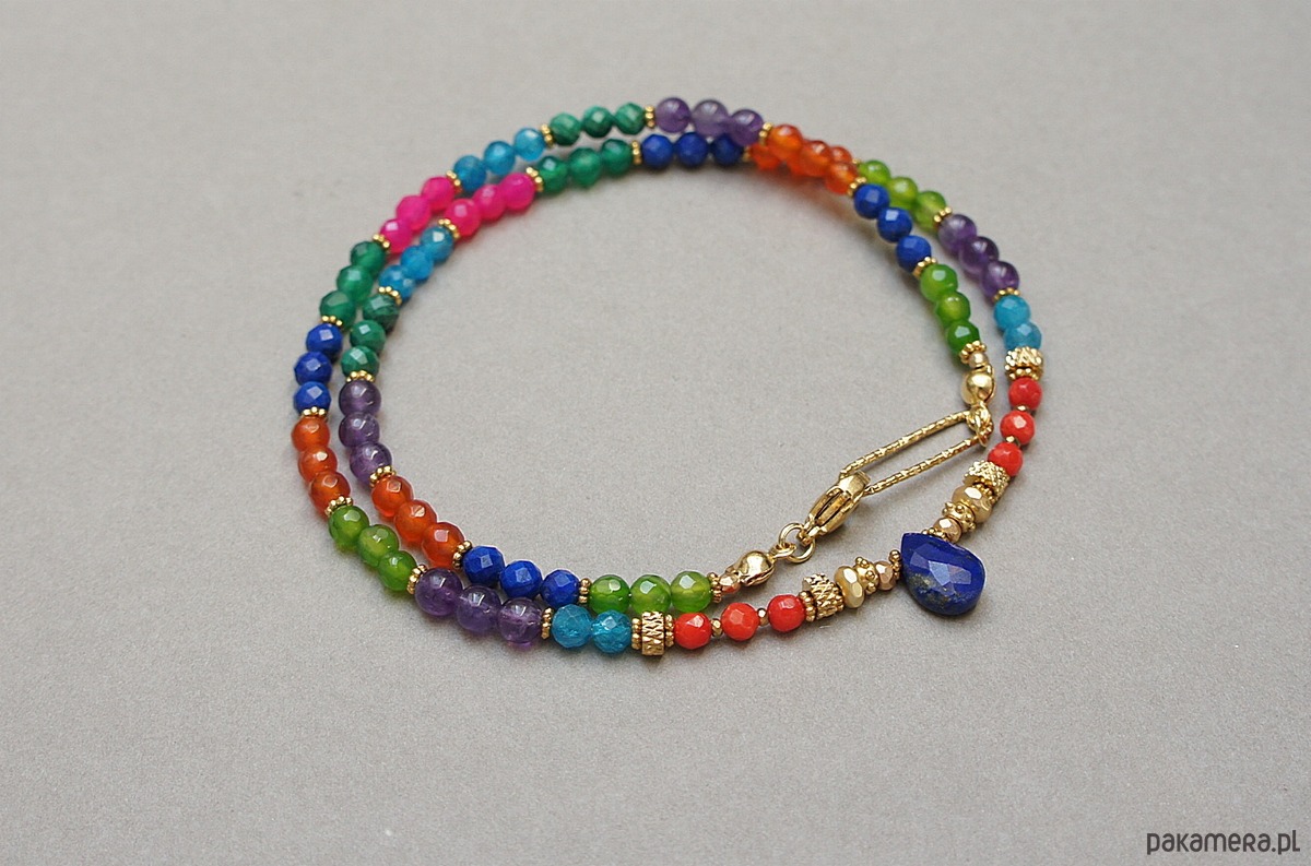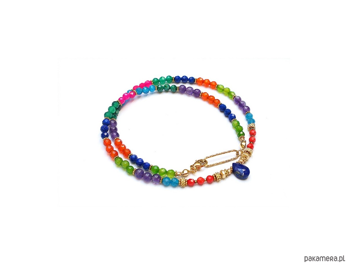 Krótki naszyjnik wykonany w całości z pozłacanej stali szlachetnej oraz naturalnych kamieni - lapis lazuli [3mm], malachit [4mm], koral naturalny [3mm],karneol [4mm], apatyt [4mm], ametyst [4mm], onyks zielony [4mm], agatów fasetowanych [4mm], brioletki lapis lazuli, hematytu matowego, platerowanego [4x2mm, 3x2mm oraz 2mm]. Naszyjnik o długości ok. 44,5cm. Biżuteria ozdobnie zapakowana.