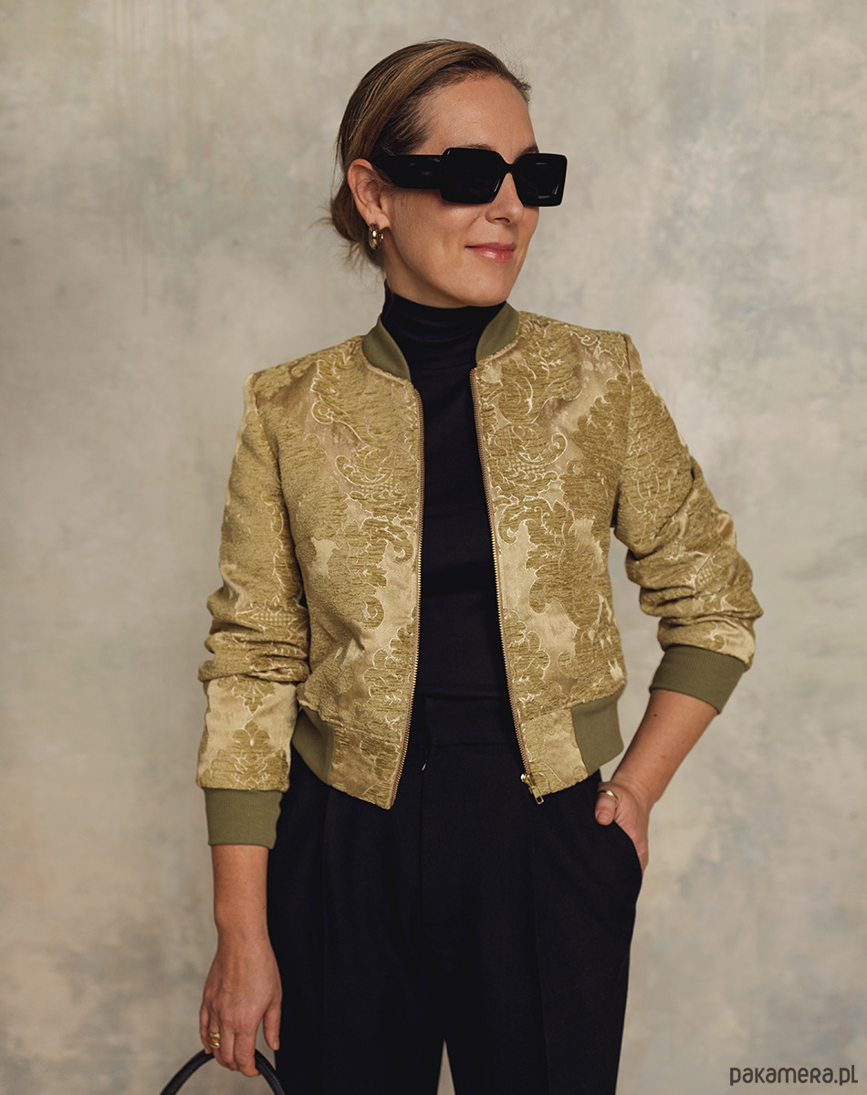 Elegancka bomberka w kolorach złota, brązu i jasnego błękitu. Uszyta z haftowanej tkaniny żakardowej. Przestrzenny haft z motywami roślinnymi w kolorze jasnoszarego błękitu nadaje kurtce oryginalnego i niepowtarzalnego eleganckiego charakteru. Z powodzeniem może zastąpić marynarkę w biznesowych stylizacjach i nie tylko. Dekolt, dół i rękawy wykończone bawełnianym ściągaczem. W całości od spodu odszyta podszewką. Bomberki mogą różnić się układem wzoru, aczkolwiek zawsze staramy się zachować symetryczność wzoru.