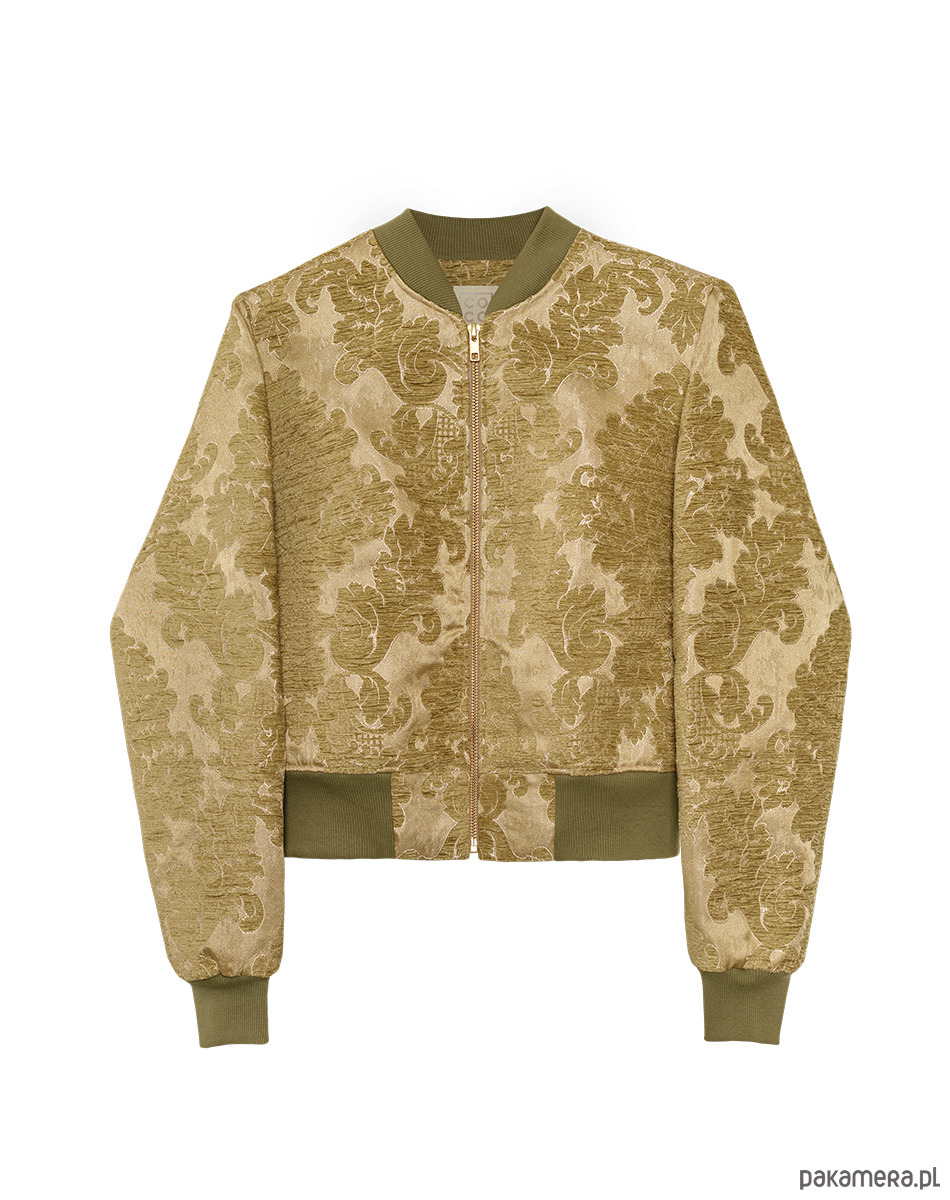 Elegancka bomberka w kolorach złota, brązu i jasnego błękitu. Uszyta z haftowanej tkaniny żakardowej. Przestrzenny haft z motywami roślinnymi w kolorze jasnoszarego błękitu nadaje kurtce oryginalnego i niepowtarzalnego eleganckiego charakteru. Z powodzeniem może zastąpić marynarkę w biznesowych stylizacjach i nie tylko. Dekolt, dół i rękawy wykończone bawełnianym ściągaczem. W całości od spodu odszyta podszewką. Bomberki mogą różnić się układem wzoru, aczkolwiek zawsze staramy się zachować symetryczność wzoru.