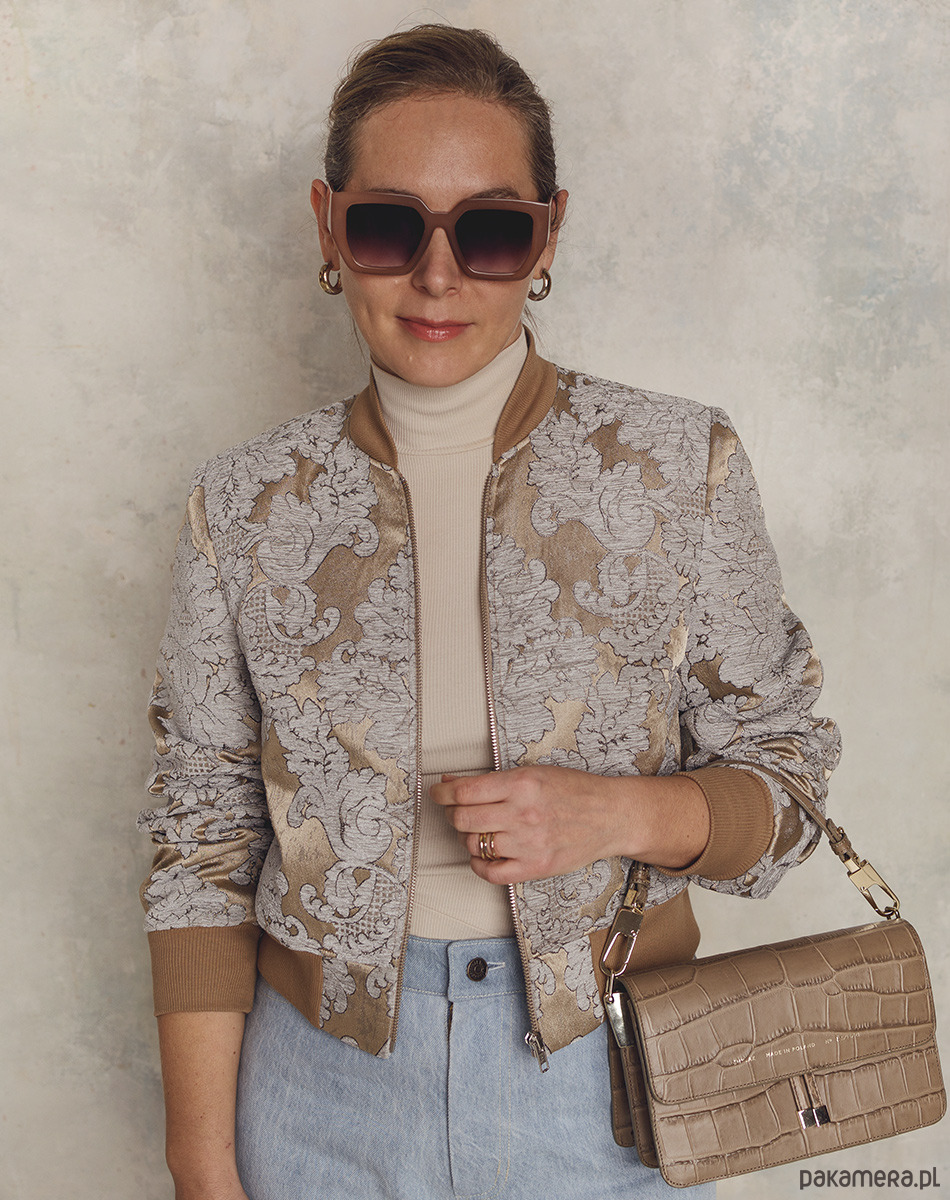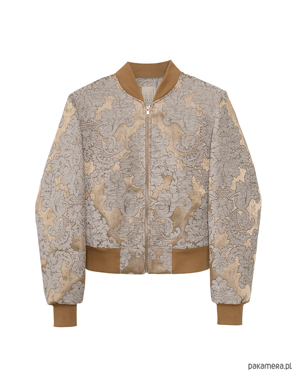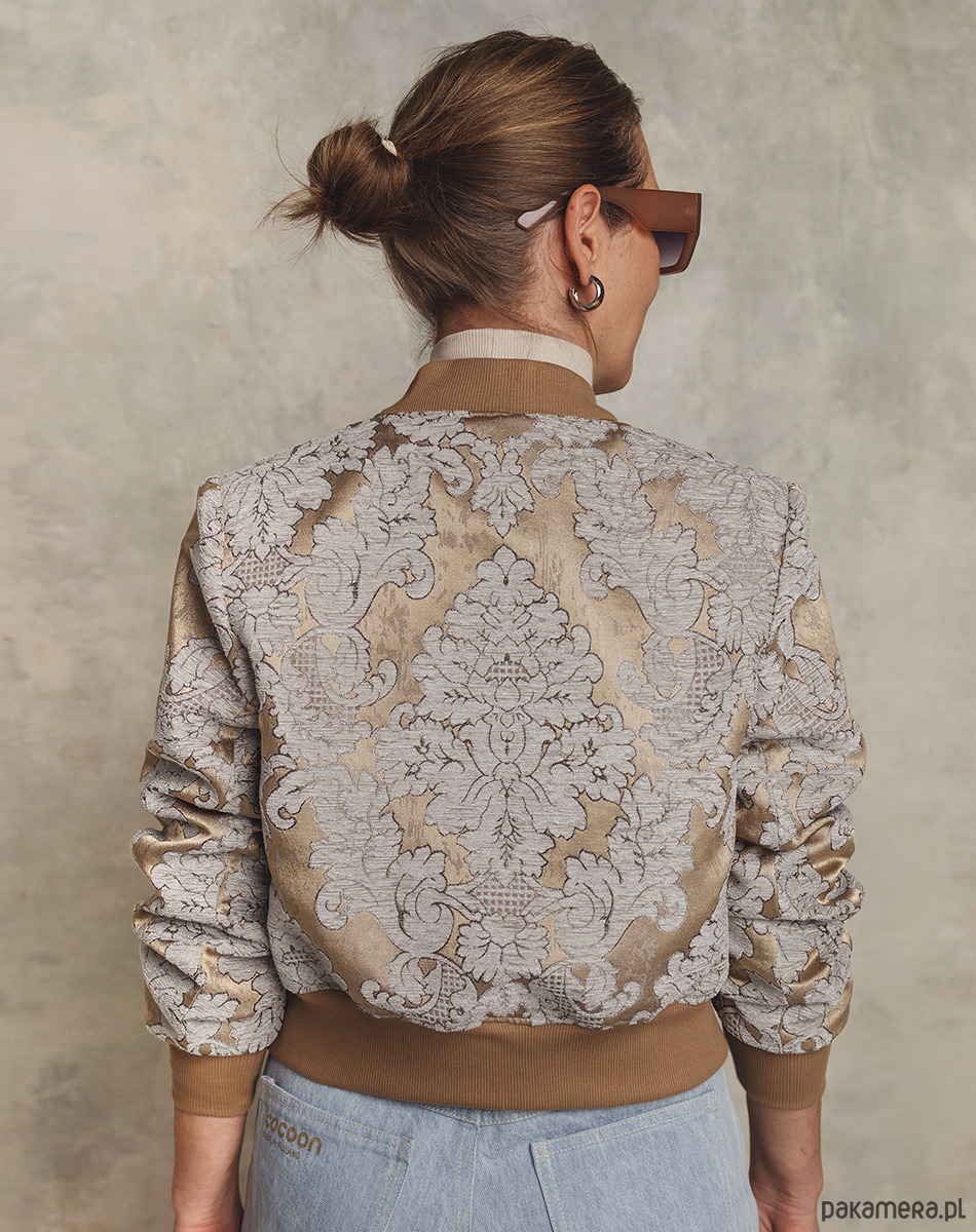 Elegancka bomberka w kolorach złota, brązu i jasnego błękitu. Uszyta z haftowanej tkaniny żakardowej. Przestrzenny haft z motywami roślinnymi w kolorze jasnoszarego błękitu nadaje kurtce oryginalnego i niepowtarzalnego eleganckiego charakteru. Z powodzeniem może zastąpić marynarkę w biznesowych stylizacjach i nie tylko. Dekolt, dół i rękawy wykończone bawełnianym ściągaczem. W całości od spodu odszyta podszewką. Bomberki mogą różnić się układem wzoru, aczkolwiek zawsze staramy się zachować symetryczność wzoru.
