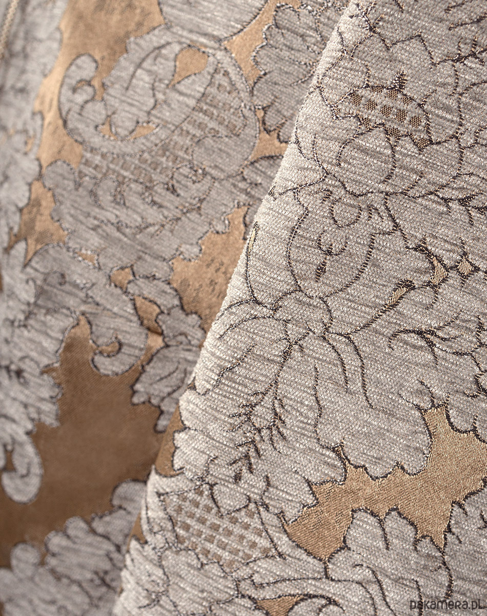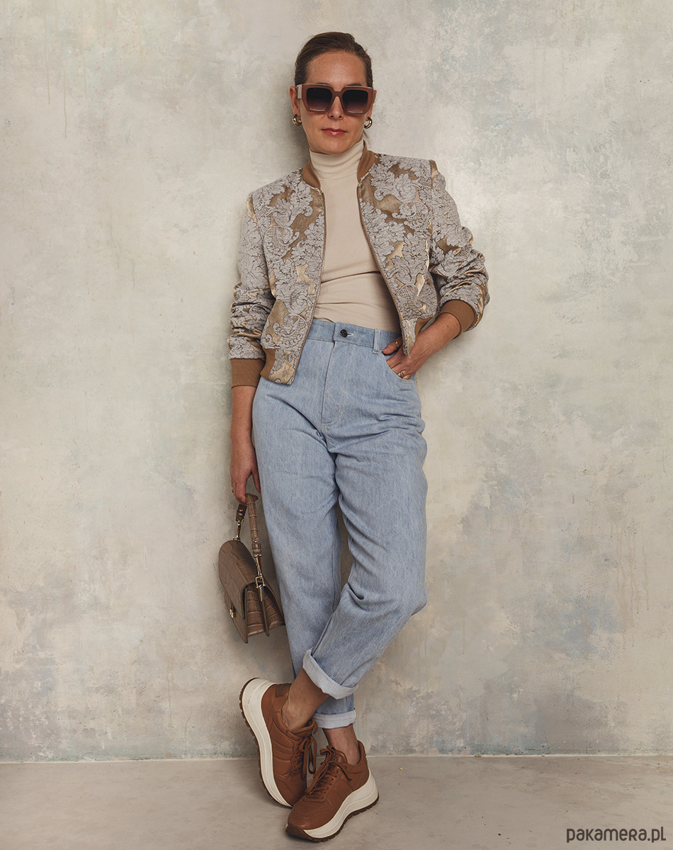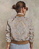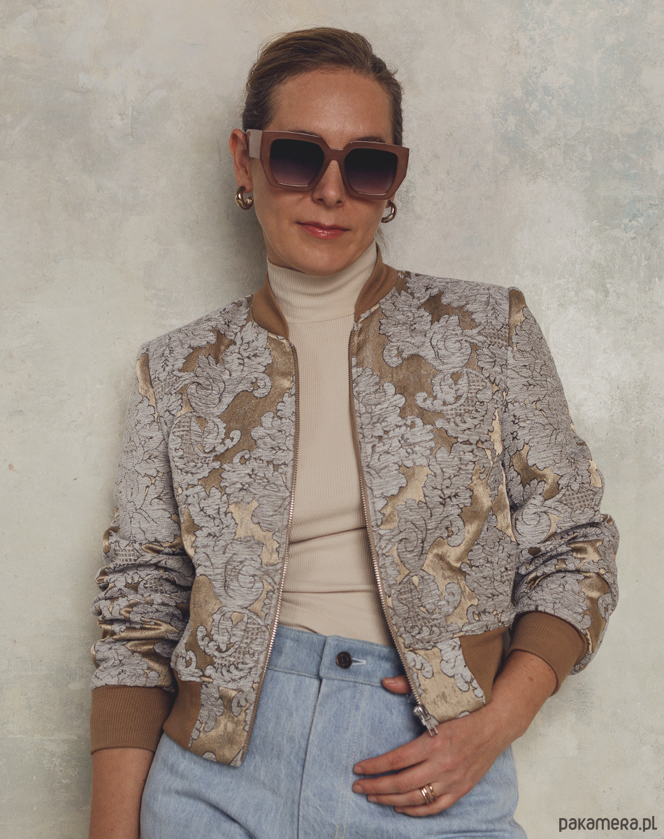 Elegancka bomberka w kolorach złota, brązu i jasnego błękitu. Uszyta z haftowanej tkaniny żakardowej. Przestrzenny haft z motywami roślinnymi w kolorze jasnoszarego błękitu nadaje kurtce oryginalnego i niepowtarzalnego eleganckiego charakteru. Z powodzeniem może zastąpić marynarkę w biznesowych stylizacjach i nie tylko. Dekolt, dół i rękawy wykończone bawełnianym ściągaczem. W całości od spodu odszyta podszewką. Bomberki mogą różnić się układem wzoru, aczkolwiek zawsze staramy się zachować symetryczność wzoru.