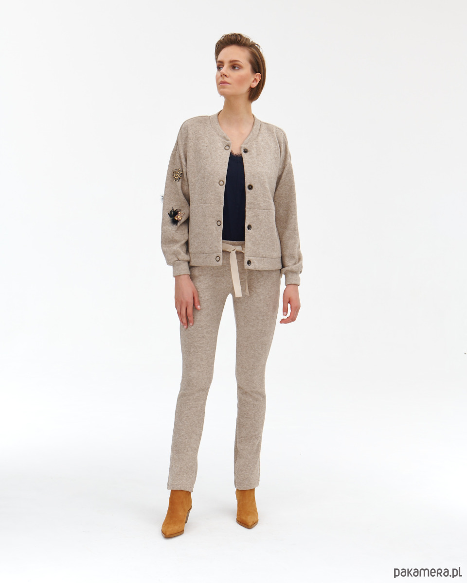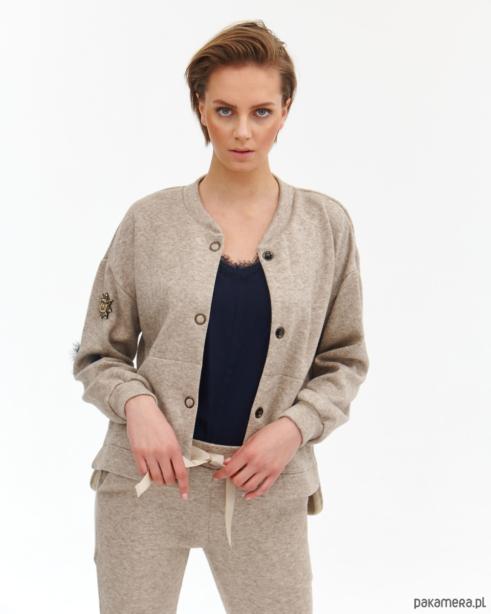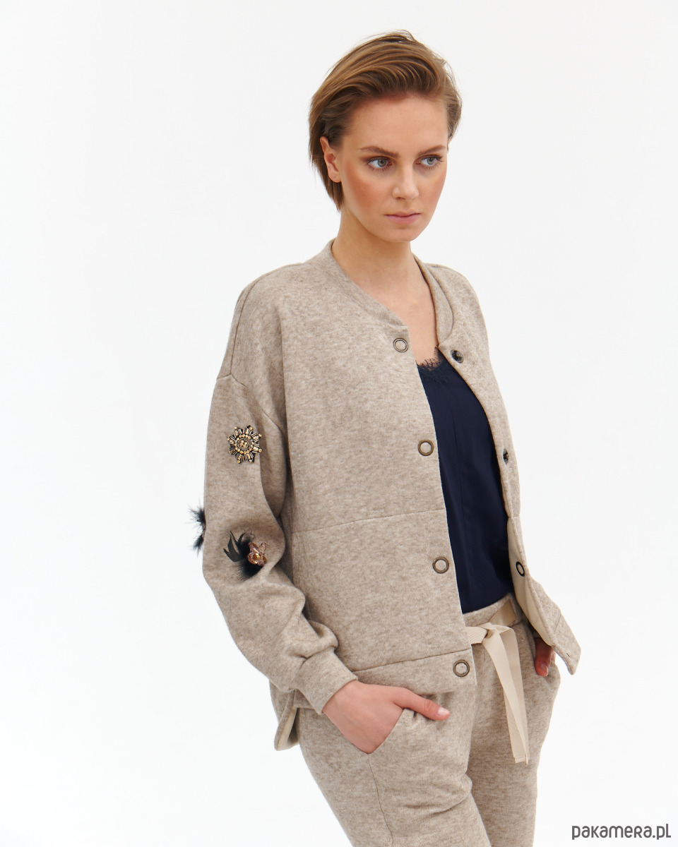 Bomberka Cana ze sweterkowej, ciepłej dzianiny. Forma bomberki jest luźna, typu koszula , z prostym dołem. Bluza jest zapinany na napy - springi. Na bokach są kieszenie. Tył jest lekko dłuższy od przodu. Rękawy są wykończone ściągaczami z podstawowej dzianiny. Bomberka od środka jest wykończona zamszem. Na jednym rękawie naszyte są ozdobne aplikacje. Do kompletu można dobrać spódnice lub spodnie, z tej samej dzianiny sweterkowej.