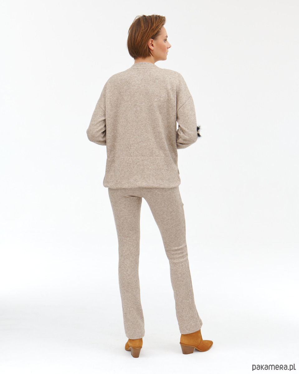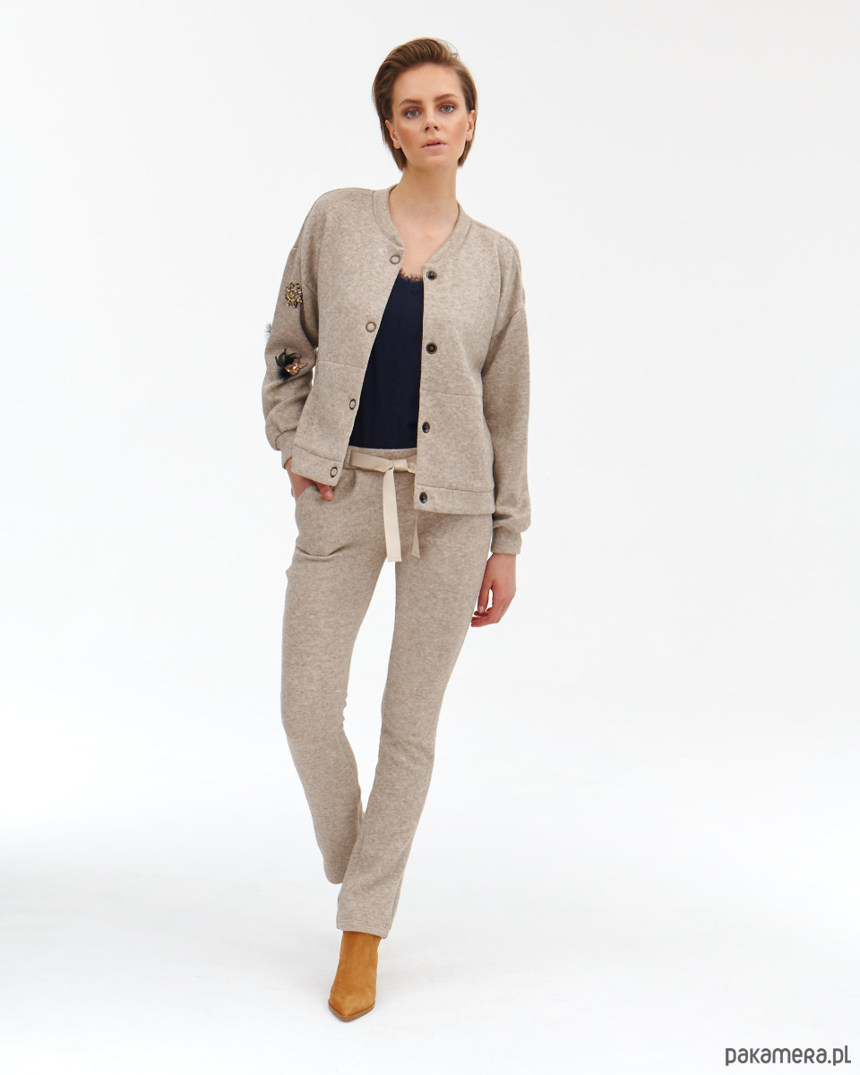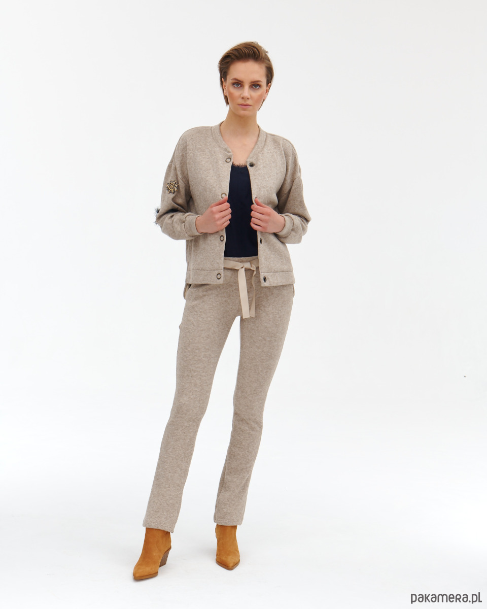 Bomberka Cana ze sweterkowej, ciepłej dzianiny. Forma bomberki jest luźna, typu koszula , z prostym dołem. Bluza jest zapinany na napy - springi. Na bokach są kieszenie. Tył jest lekko dłuższy od przodu. Rękawy są wykończone ściągaczami z podstawowej dzianiny. Bomberka od środka jest wykończona zamszem. Na jednym rękawie naszyte są ozdobne aplikacje. Do kompletu można dobrać spódnice lub spodnie, z tej samej dzianiny sweterkowej.