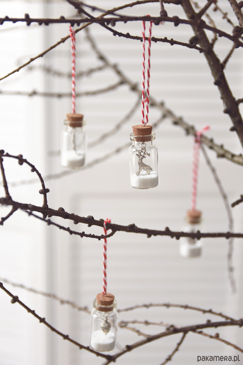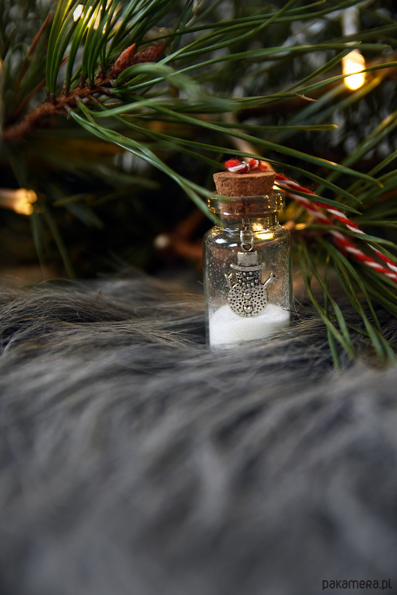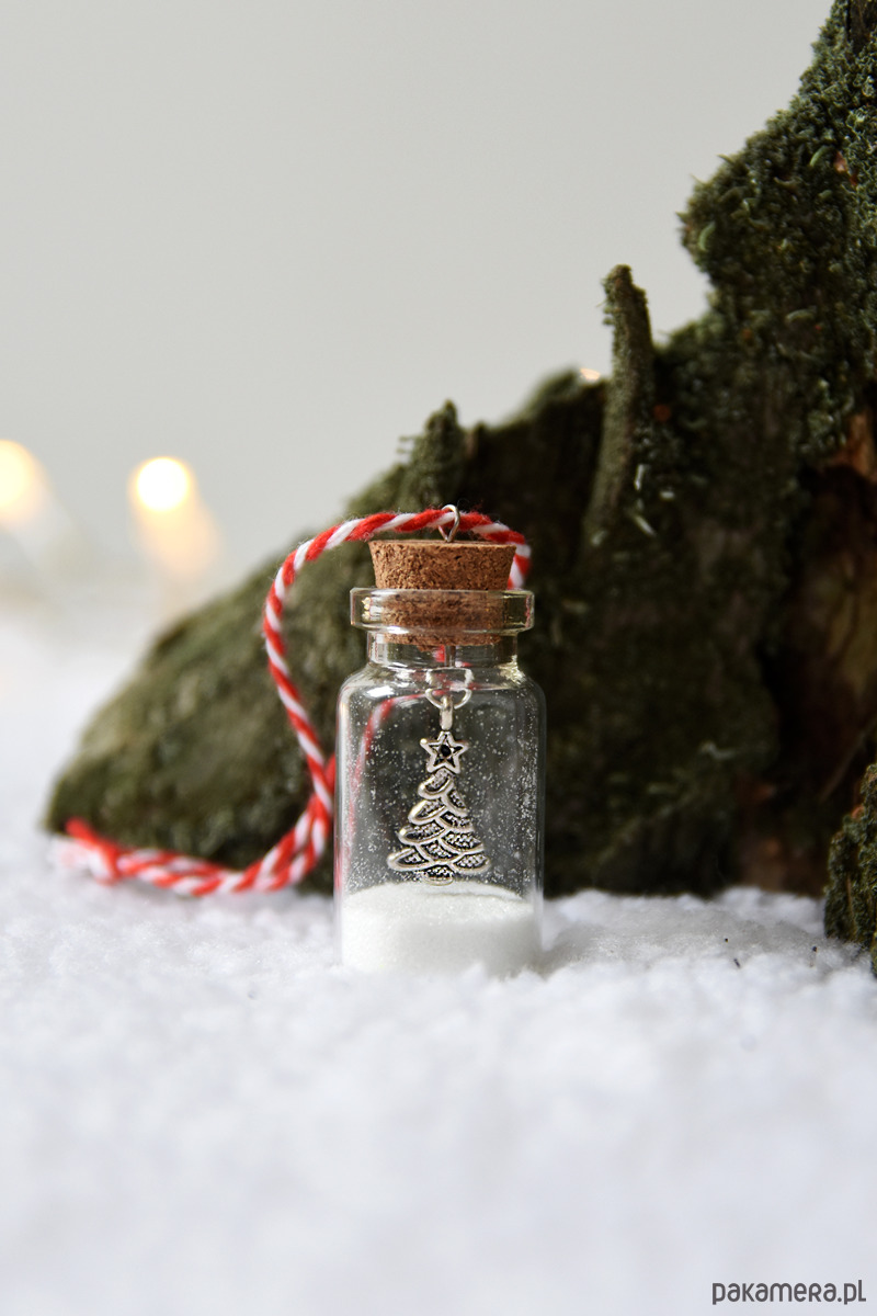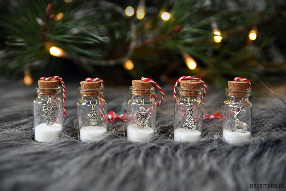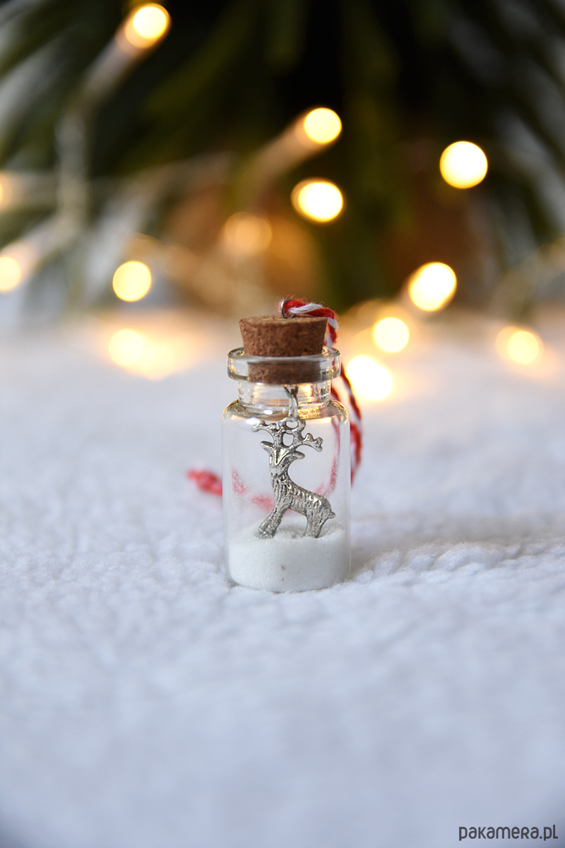 Nietuzinkowe bombki butelki z subtelnym charmsem zawieszonym w środku, wypełnione błyszczącym śniegiem. Idealne na prezent dla najbliższych, jako wyjątkowa dekoracja choinki lub świątecznego stołu.