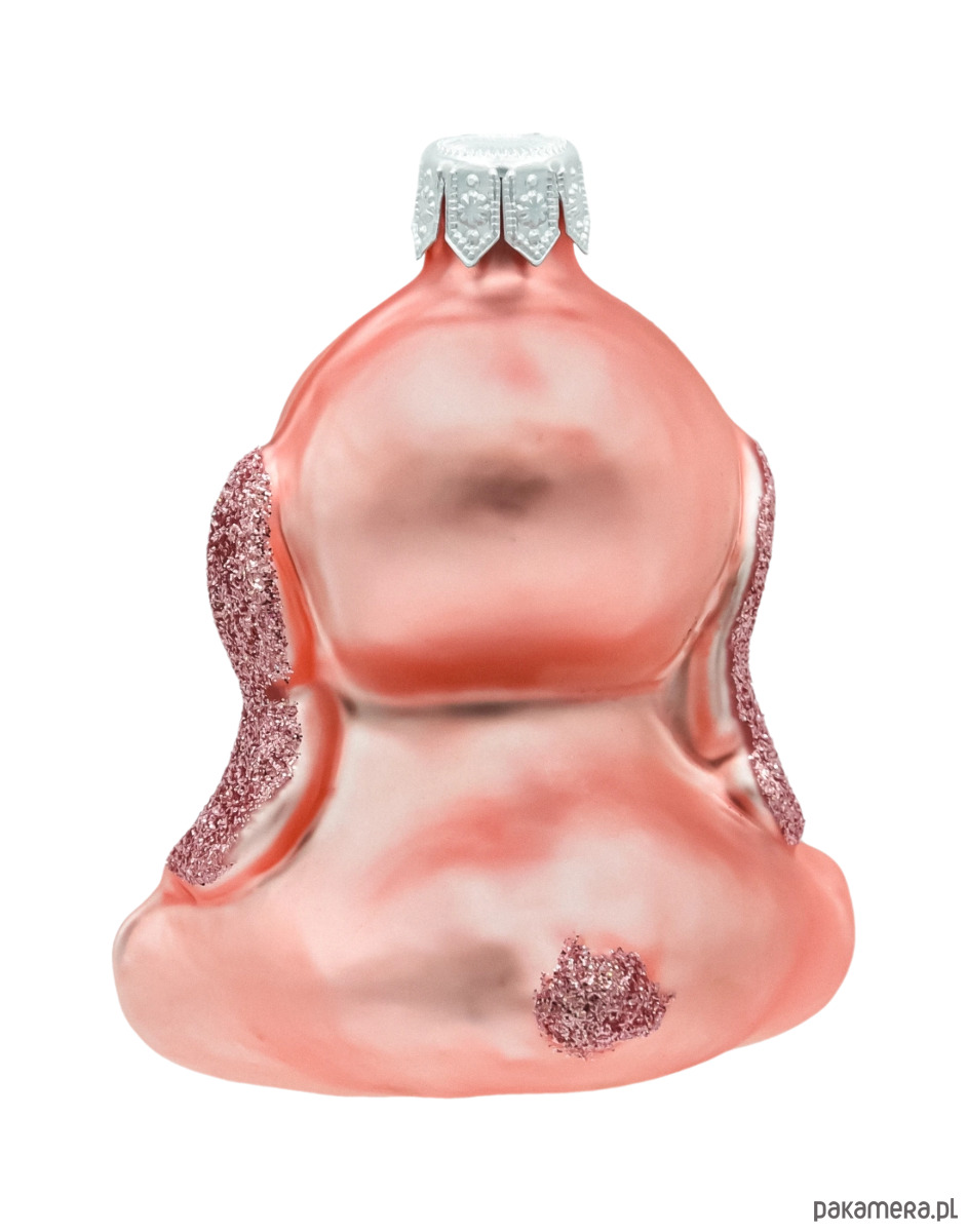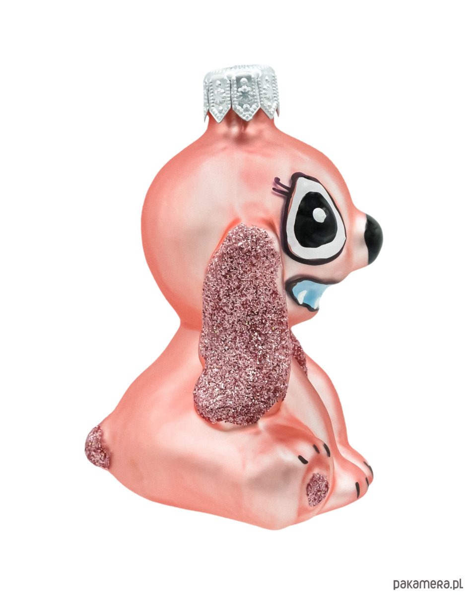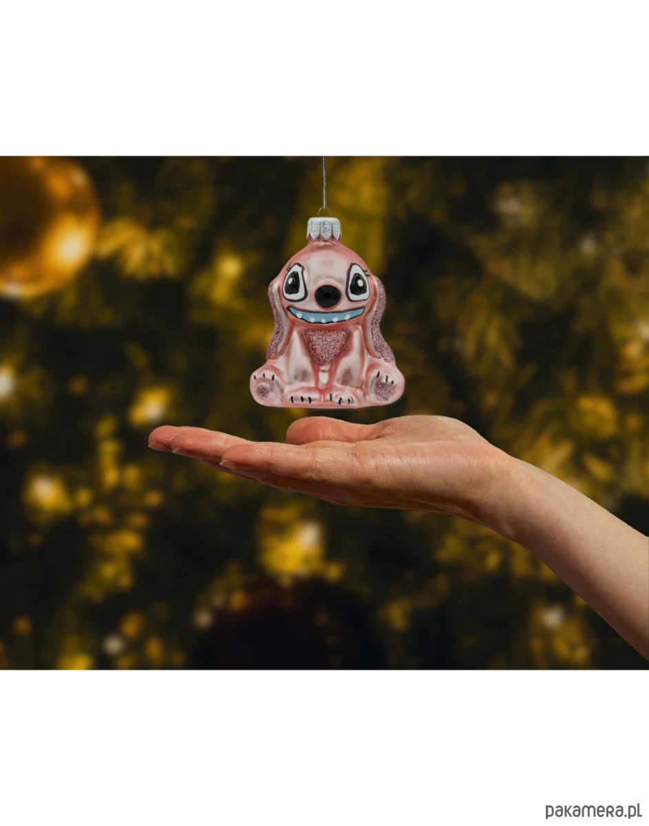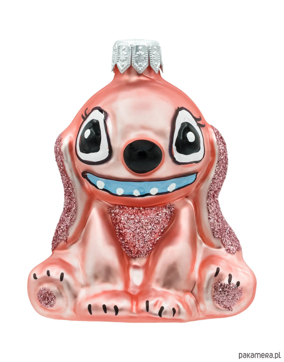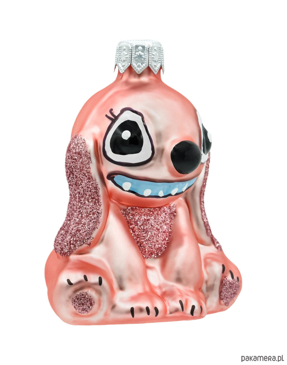 Ręcznie zdobiona bombka szklana „Andzia inspirowana bajką „Lilo & Stitch” to figuralna ozdoba choinkowa, która natychmiast przyciąga wzrok. Urocza, różowa postać z dużymi oczami, szerokim niebieskim uśmiechem i brokatowymi uszkami została pomalowana aerografem oraz domalowana pędzlem, a następnie wykończona połyskującym, różowym brokatem. Delikatne szkło pięknie odbija światło lampek, dzięki czemu bombka wprowadza do wnętrza bajkowy, radosny klimat.