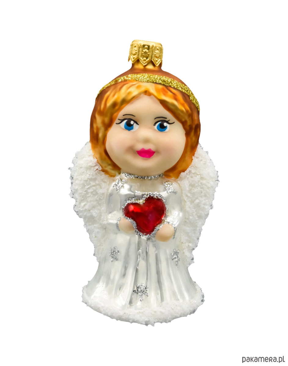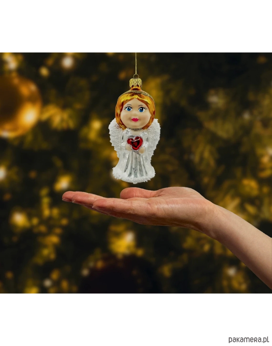 Design: Bombka przedstawia uroczego anioła o łagodnym wyrazie twarzy, ubranego w połyskującą, białą szatę. Anioł trzyma w dłoniach czerwone serce, symbolizujące miłość, co doskonale wpisuje się w świąteczną atmosferę. Skrzydła anioła są pokryte białymi, brokatowymi zdobieniami, które pięknie odbijają światło i nadają ozdobie magicznego charakteru.