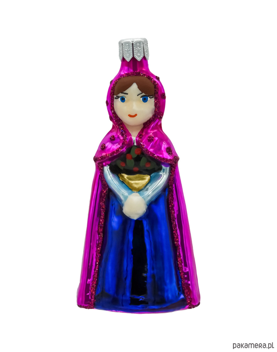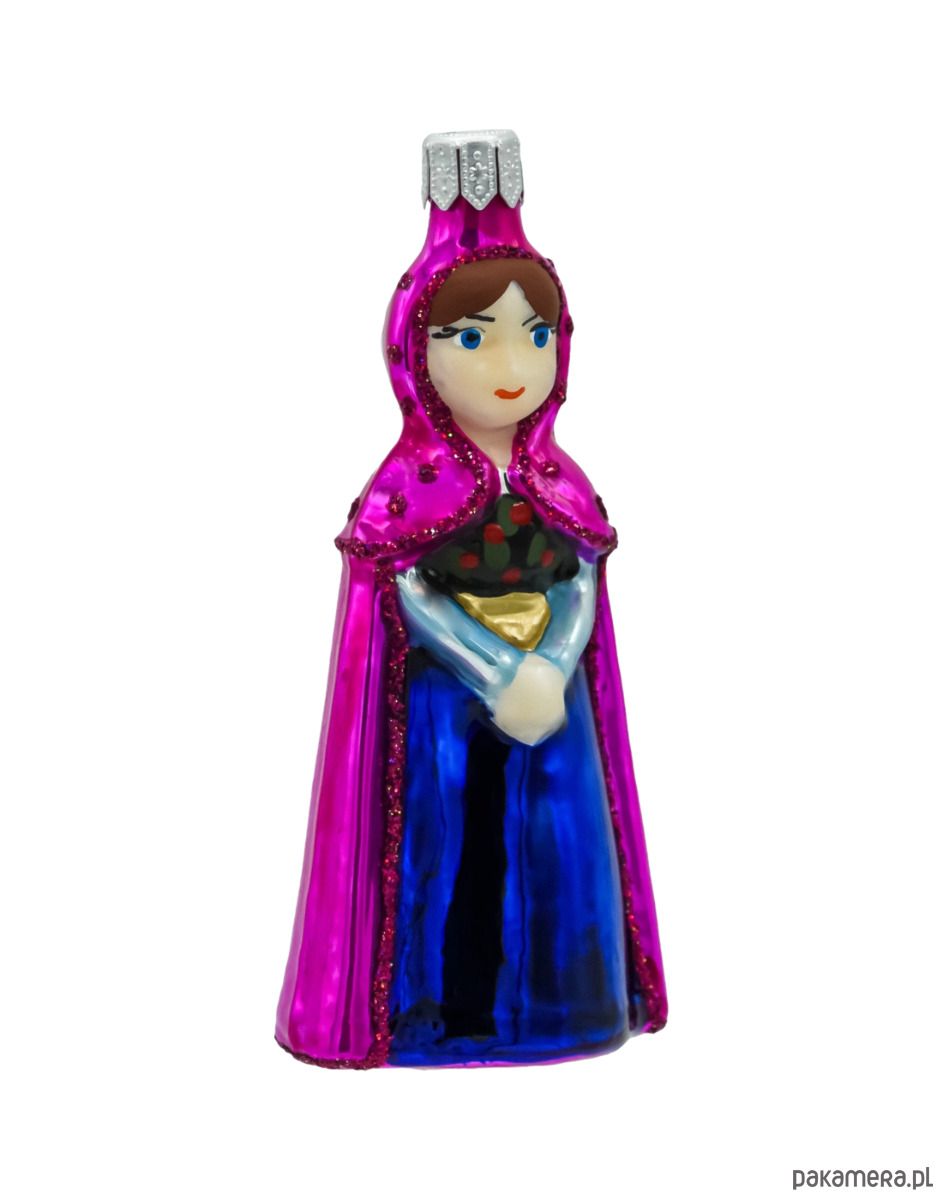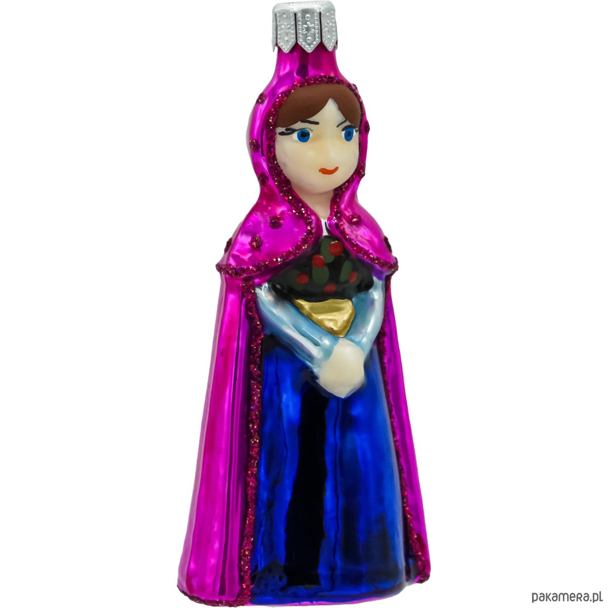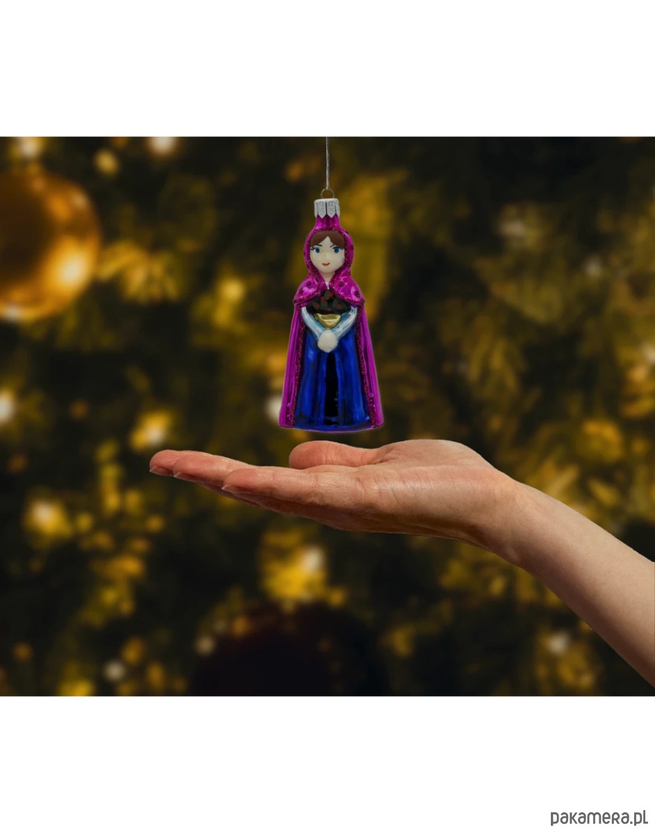 Szklana bombka choinkowa Anna z Lodowej Krainy to wyjątkowa figurka, która zachwyci każdego miłośnika bajek Disneya. Ręcznie malowana ozdoba w kształcie postaci Anny została wykonana z dmuchanego szkła i starannie ozdobiona brokatowymi detalami. Ubrana w charakterystyczną pelerynę w odcieniu fuksji i suknię w głębokim kobalcie, trzyma w dłoniach bukiet kwiatów, co nadaje całości uroku i bajkowego wdzięku.