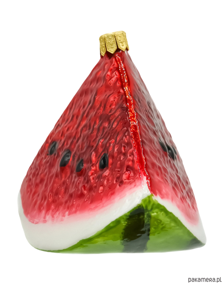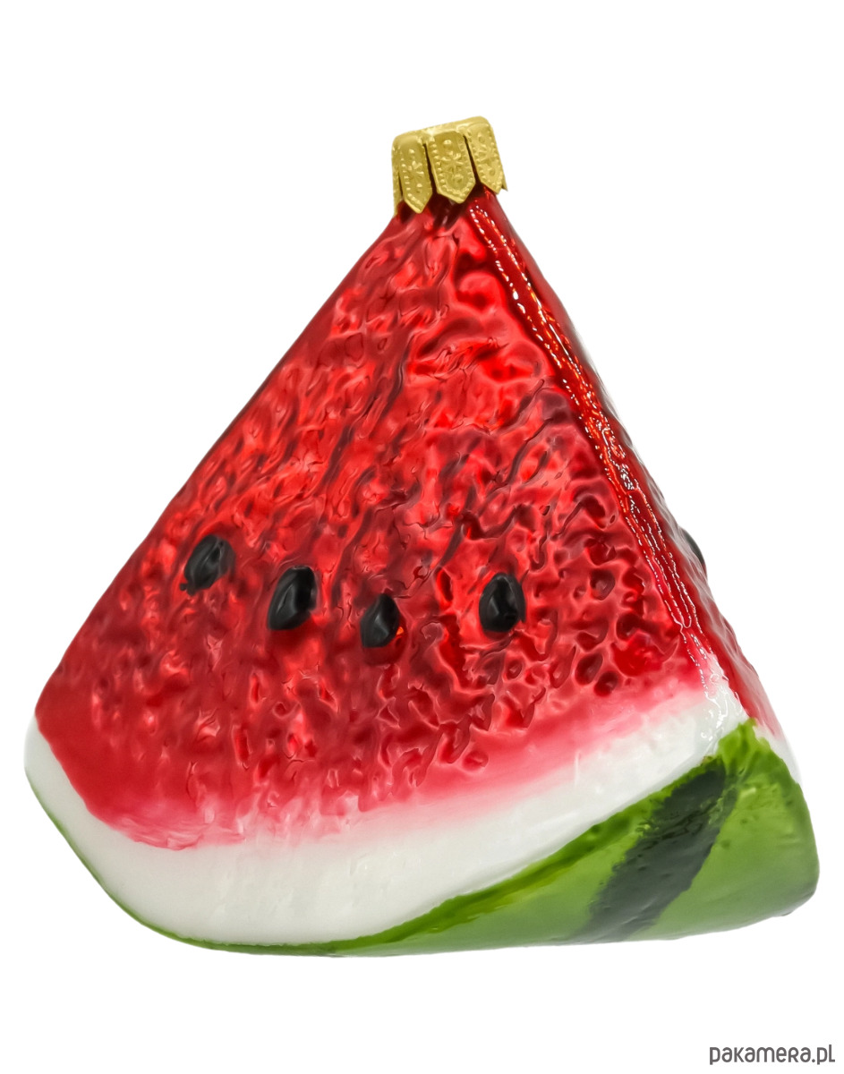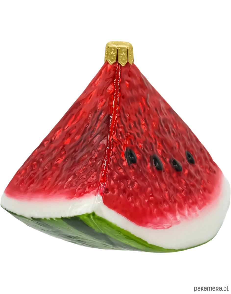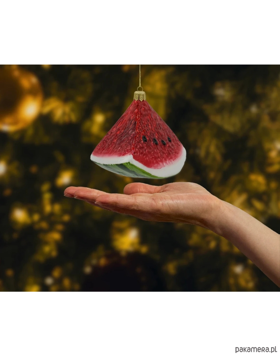 Wprowadź do swojej świątecznej dekoracji odrobinę letniego orzeźwienia dzięki tej wyjątkowej bombce choinkowej w kształcie soczystego kawałka arbuza. Ręcznie malowana, szklana ozdoba przyciąga wzrok intensywnymi, naturalnymi barwami – od głębokiej czerwieni miąższu, przez realistycznie oddane czarne pestki, aż po kontrastującą zieloną skórkę z białym obrzeżem. Jej trójkątny kształt oraz teksturowana powierzchnia doskonale imitują świeżo odkrojony plaster owocu, dzięki czemu prezentuje się niezwykle autentycznie i apetycznie.