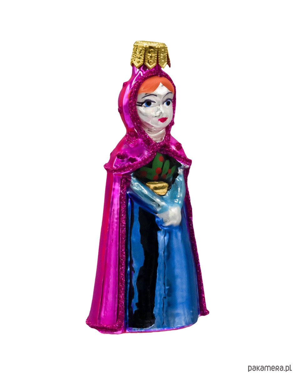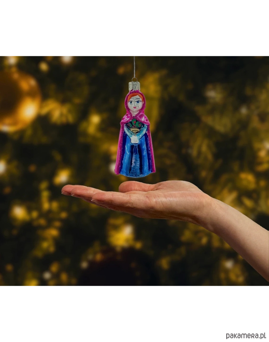 Szklana bombka z postacią w różowym płaszczu i niebieskiej sukni to idealny wybór dla tych, którzy pragną dodać swojej choince odrobinę bajkowego uroku i elegancji, tworząc niezapomnianą, magiczną atmosferę świąt.