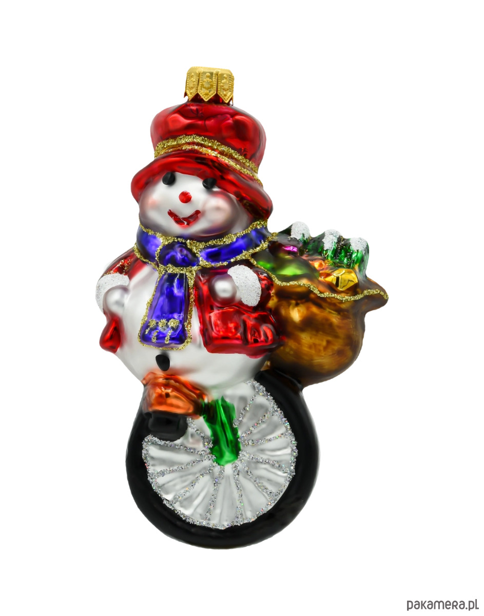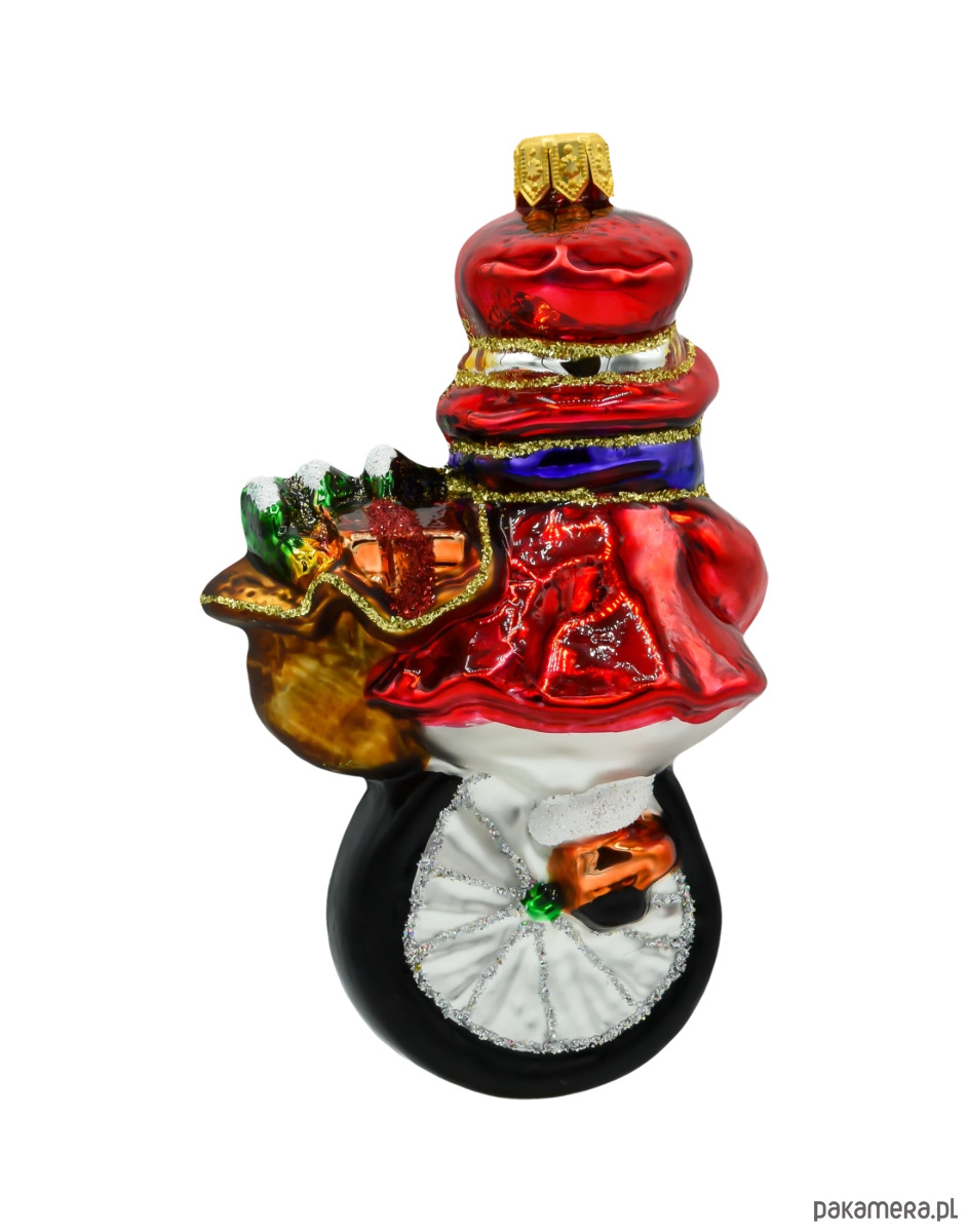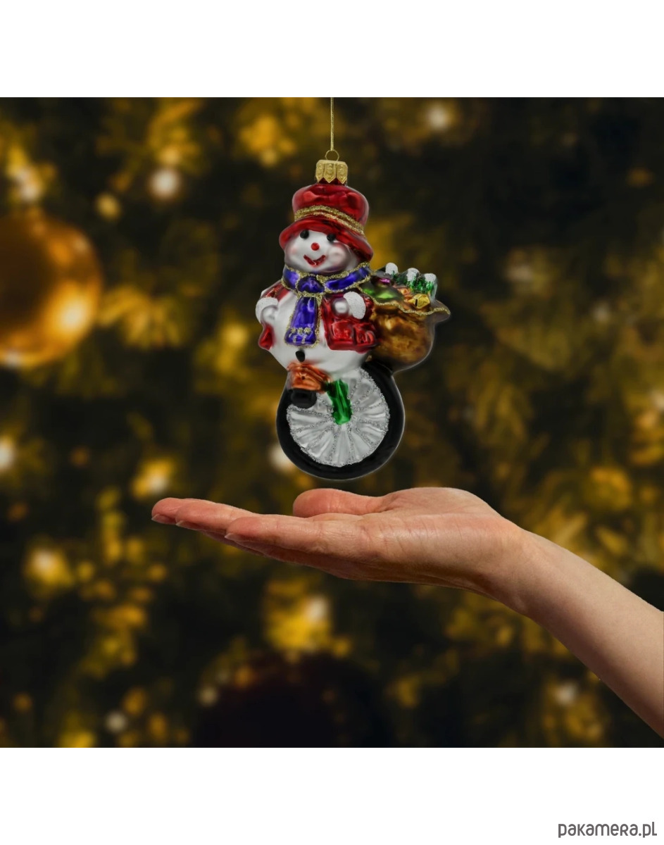Bombka choinkowa szklana – Bałwan na monocyklu z workiem prezentów