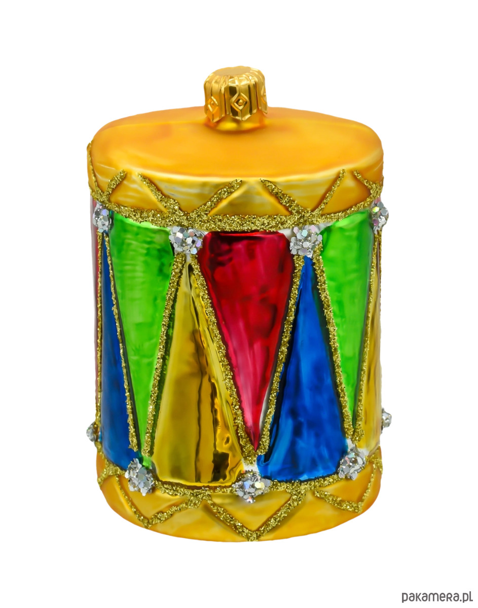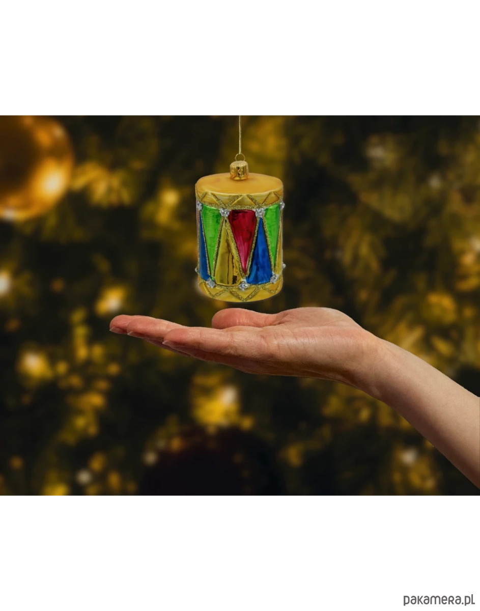 Dodaj świątecznej choince odrobinę rytmu i bajecznego blasku! Bombka choinkowa w kształcie klasycznego bębenka to idealny wybór dla miłośników tradycyjnych motywów bożonarodzeniowych w nowoczesnym, błyszczącym wydaniu. Bogata kolorystyka – intensywny czerwony, zieleń, złoto, niebieski i żółty – w połączeniu z brokatowymi zdobieniami i kryształkami sprawia, że ozdoba przyciąga wzrok i rozświetla całe drzewko.