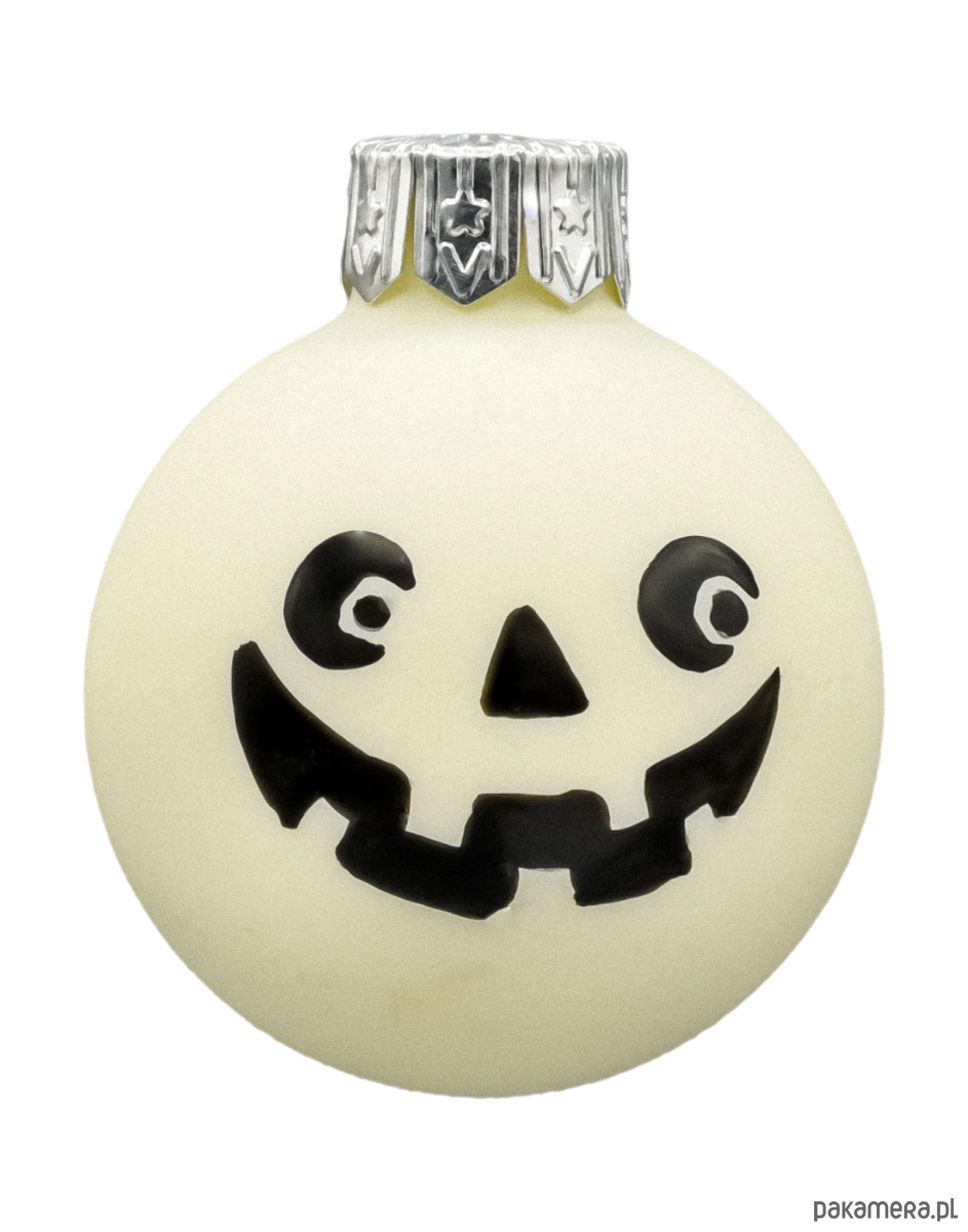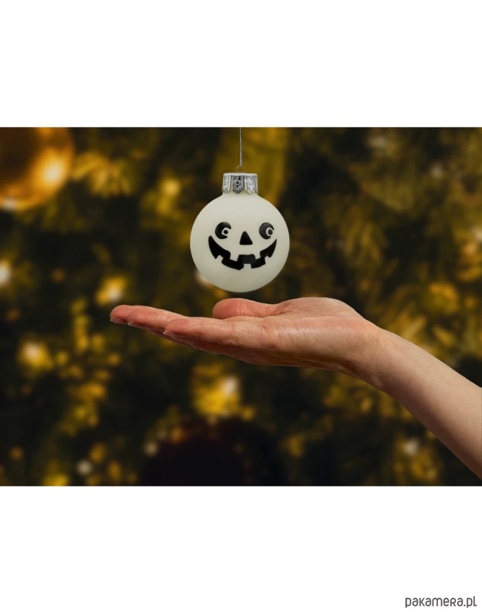 Bombka choinkowa: Biała bombka z uśmiechem dyni