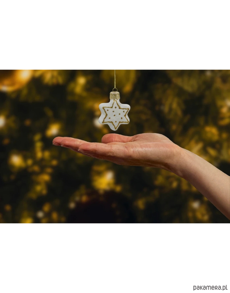 Bombka została wykonana ze szkła dmuchanego i ręcznie dekorowana, co czyni ją niepowtarzalną. Matowa biel nadaje jej szlachetnego charakteru, a złote brokatowe zdobienia w formie konturu gwiazdy i drobnych kropek w jej wnętrzu rozświetlają całość, przyciągając wzrok refleksami świątecznego oświetlenia. Dzięki niewielkim rozmiarom i lekkiej konstrukcji idealnie prezentuje się zarówno na naturalnej, jak i sztucznej choince – jako samodzielna ozdoba lub część zestawu dekoracji w stylu klasycznym, glamour lub minimalistycznym.