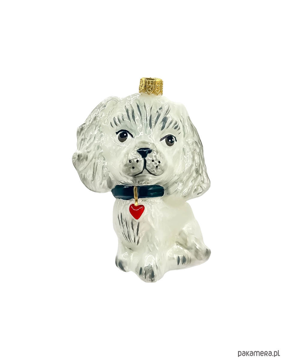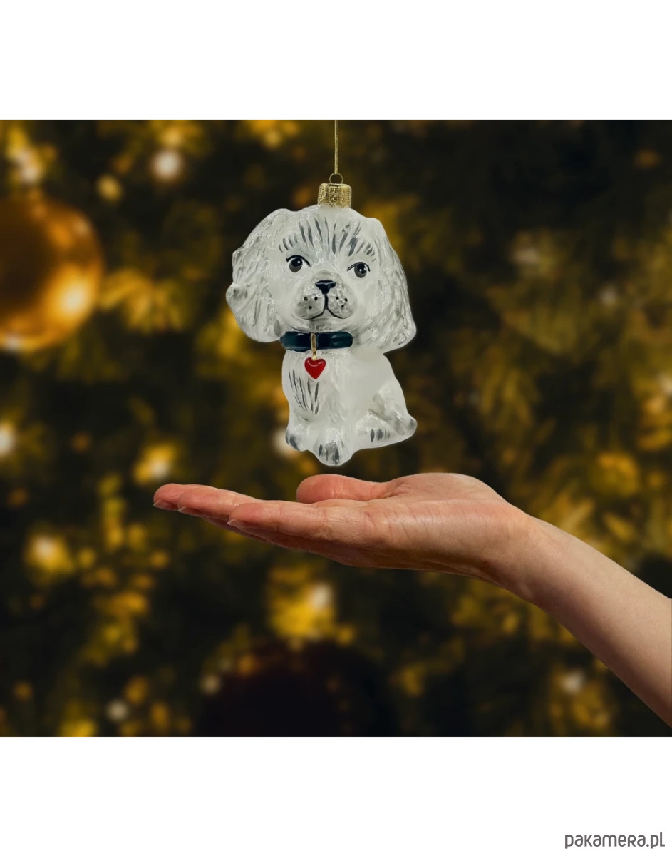 Ta bombka przedstawia uroczego białego pieska o łagodnym wyrazie pyska. Precyzyjne detale, takie jak futerko o delikatnych, szarych akcentach, piękne, duże oczy i starannie odwzorowane uszy, sprawiają, że dekoracja wygląda niezwykle realistycznie. Dodatkowym urokiem jest obroża z zawieszką w kształcie czerwonego serduszka, podkreślająca miłość do pupila.