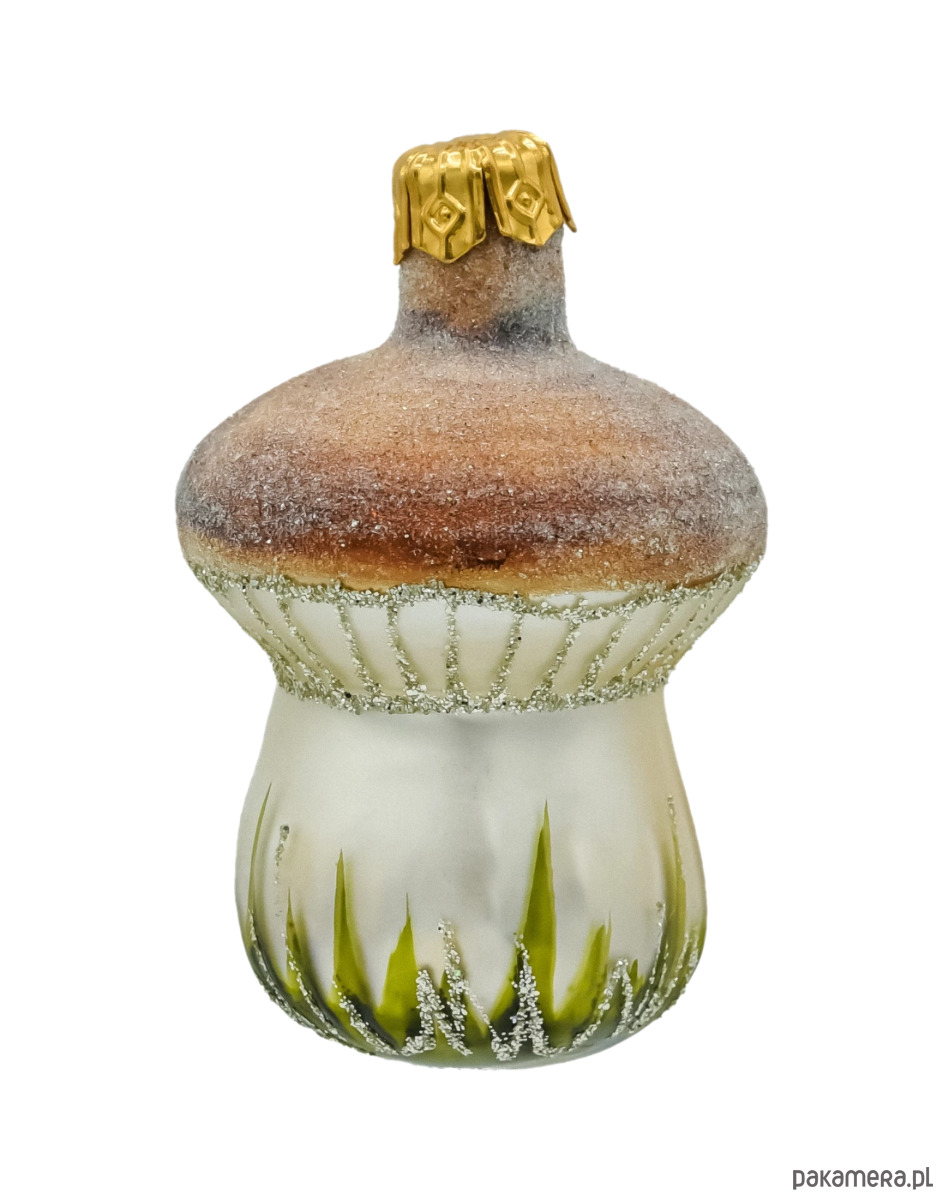 Górna część bombki – kapelusz borowika – została utrzymana w ciepłych odcieniach brązu z efektem przyprószenia delikatnym brokatem, który pięknie mieni się w świetle choinkowych lampek. Blaszki kapelusza zaznaczone zostały srebrnym brokatem, a trzon ozdobiono malowanymi trawkami i trzema maleńkimi grzybkami u podstawy – dodając całości uroku i realizmu.