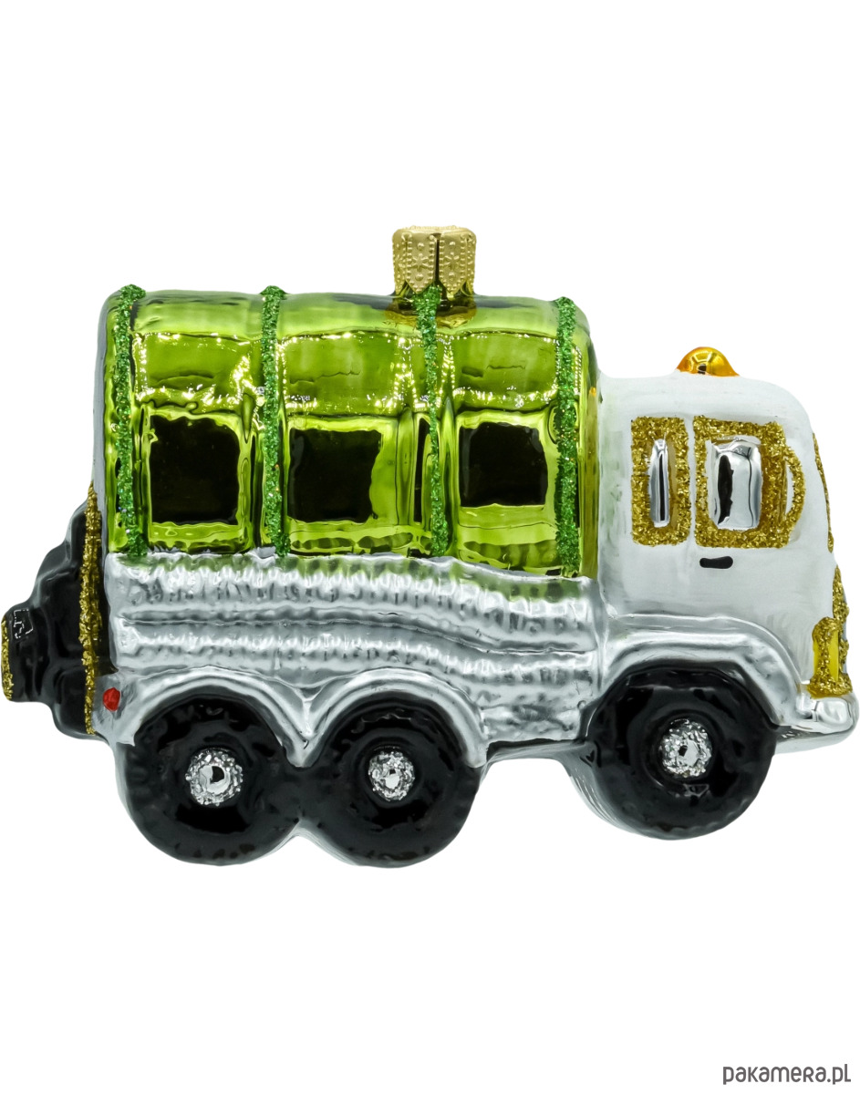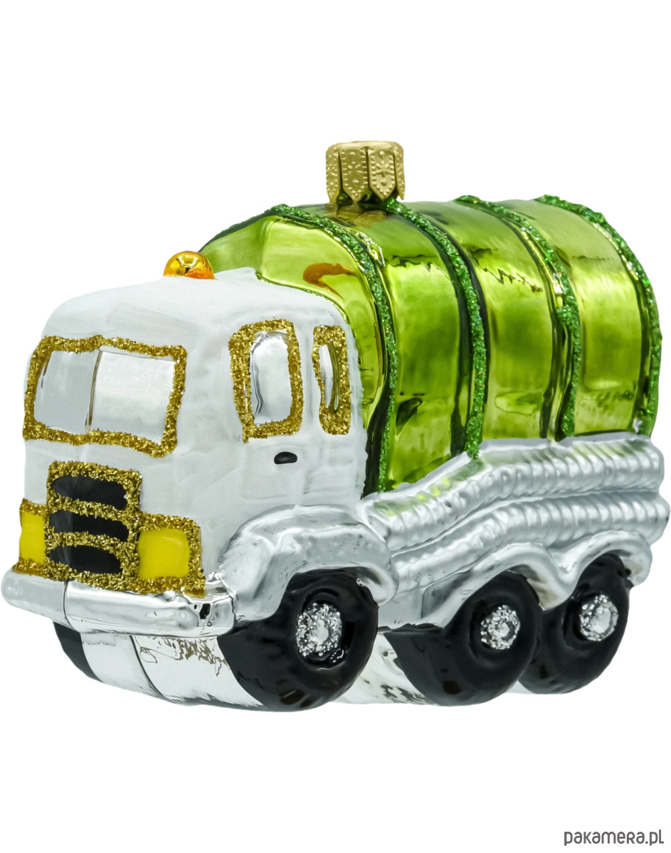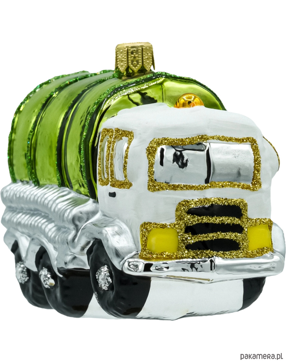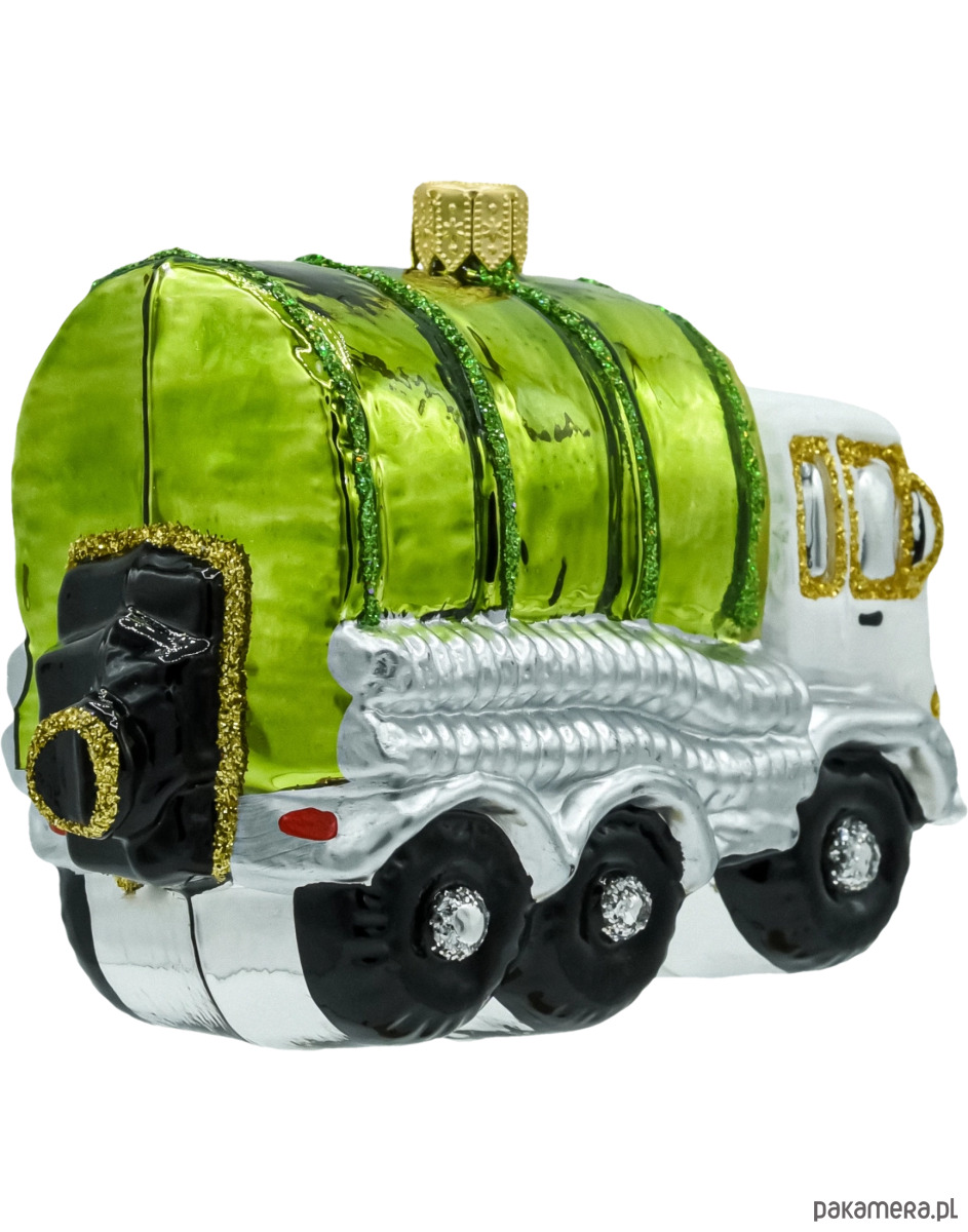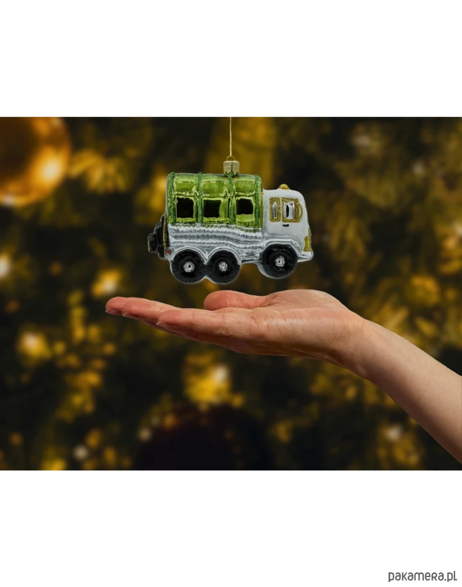 Szczęśliwy kurs prosto pod choinkę! Ta szklana bombka ciężarówka–cysterna łączy dziecięcą radość z kolekcjonerskim kunsztem. Biała kabina z „chromowanym” zderzakiem i żółtymi światłami, trójosiowe podwozie z połyskującymi kołami oraz metalicznie zielony zbiornik zaznaczony brokatowymi wzmocnieniami tworzą efektowną, trójwymiarową scenę. Pomarańczowy „kogut” na dachu i złote obramowania szyb pięknie odbijają światło lampek. To ręcznie malowana ozdoba choinkowa dla fanów motoryzacji i wszystkich, którzy szukają nietuzinkowych akcentów na świąteczne drzewko.